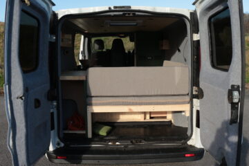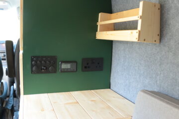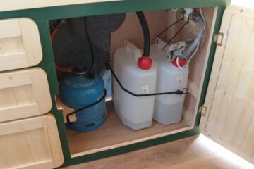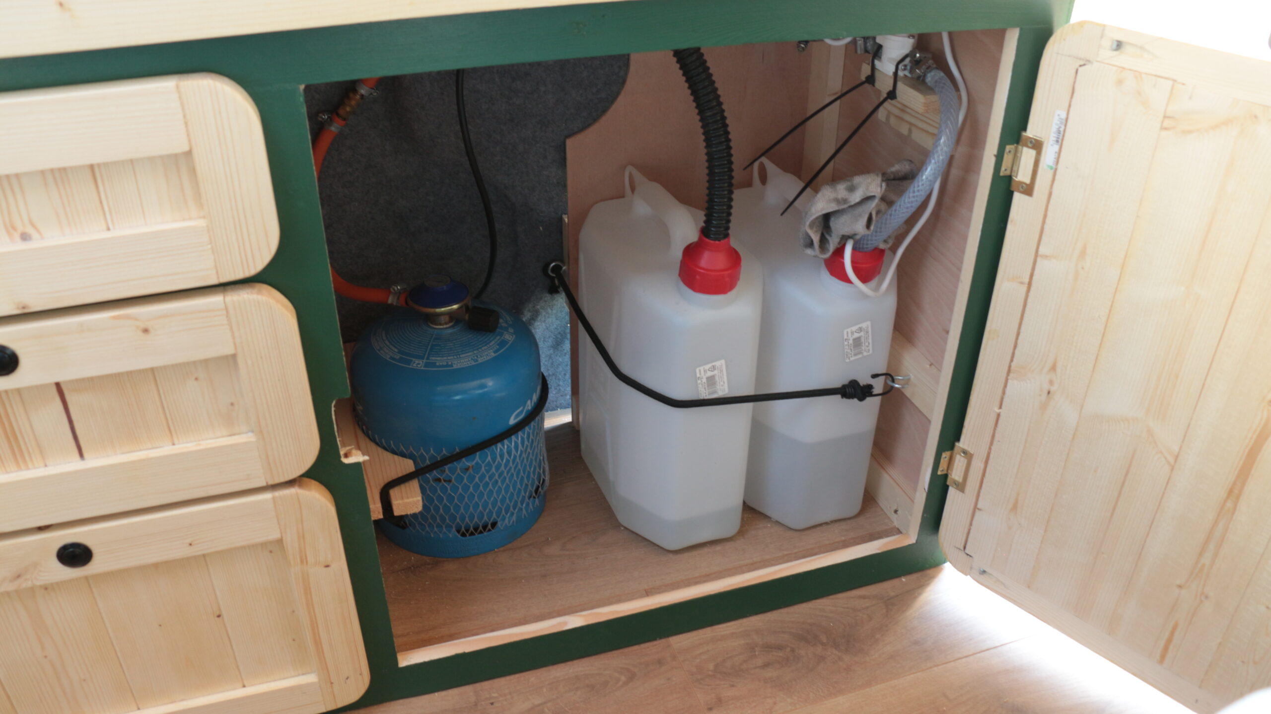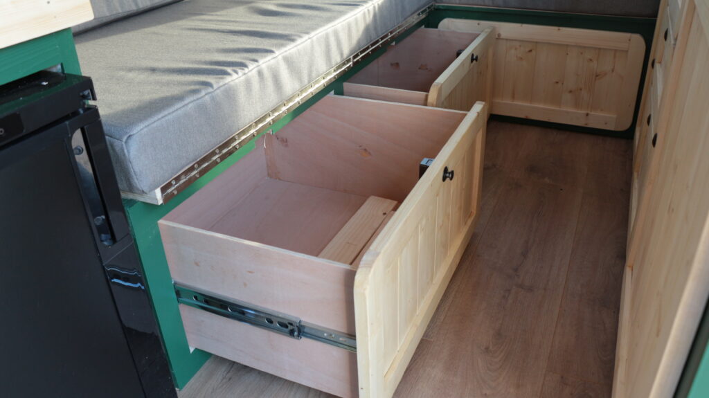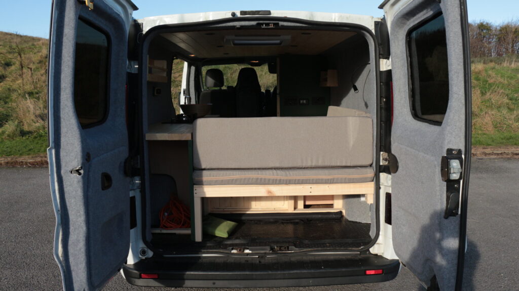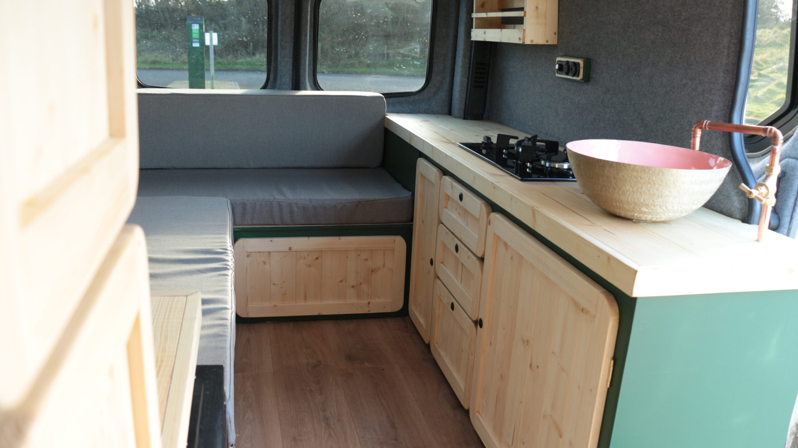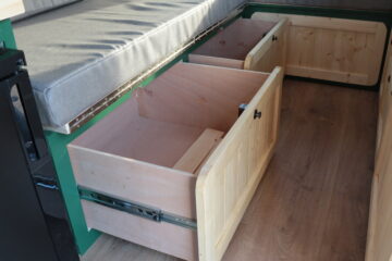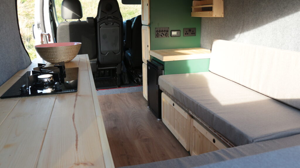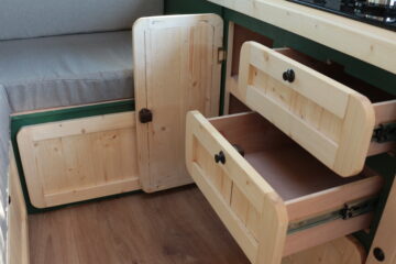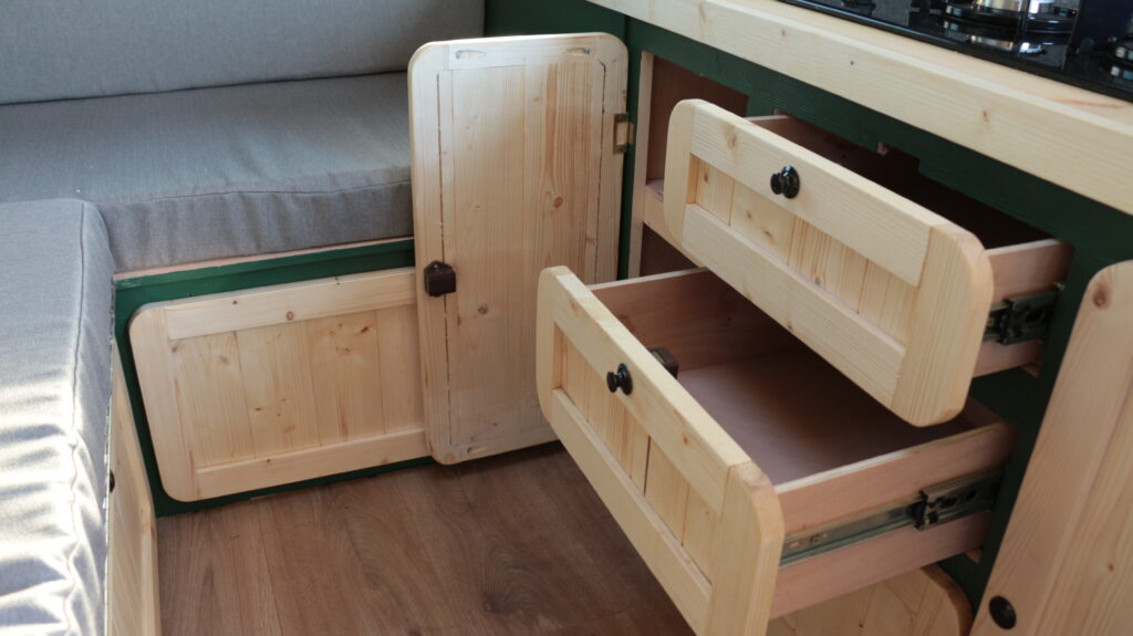 There is plenty of storage space in the van with large drawers under the seat / bed and an array of drawers and cupboards under the main kitchen unit and more cupboards in a floor to ceiling unit. There is also a small “garage area” which is accessible from the back doors for storing outside furniture, tools, muddy boots etc.