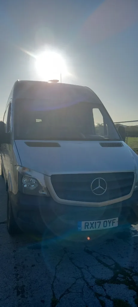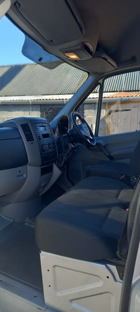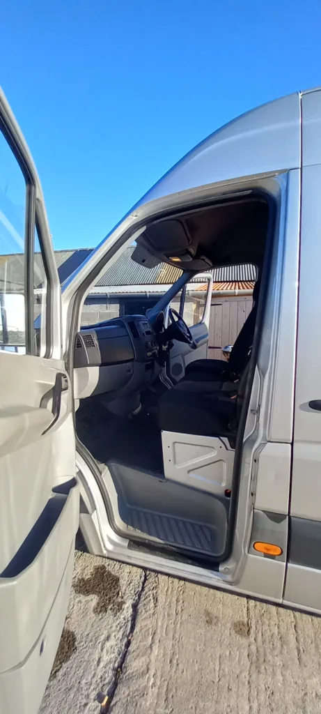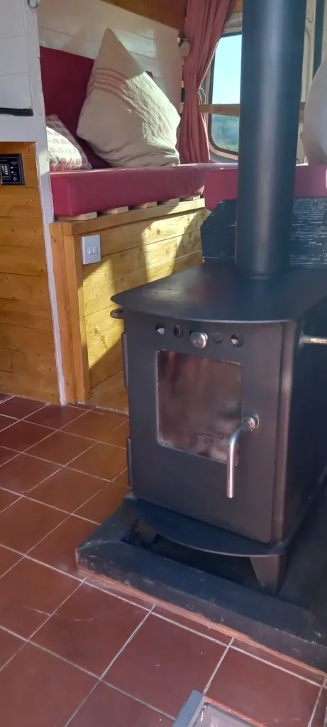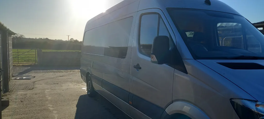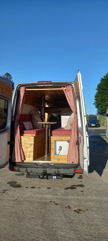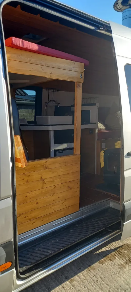 Fully off grid Mercedes’ Sprinter LWB with shower, battery electric storage and hook up, electric angled lighting, 2 ring gas burner hob, fridge freezer, and electric hot water system which ensures you will always have hot showers, with a wood burner for a cosy interior when needed!