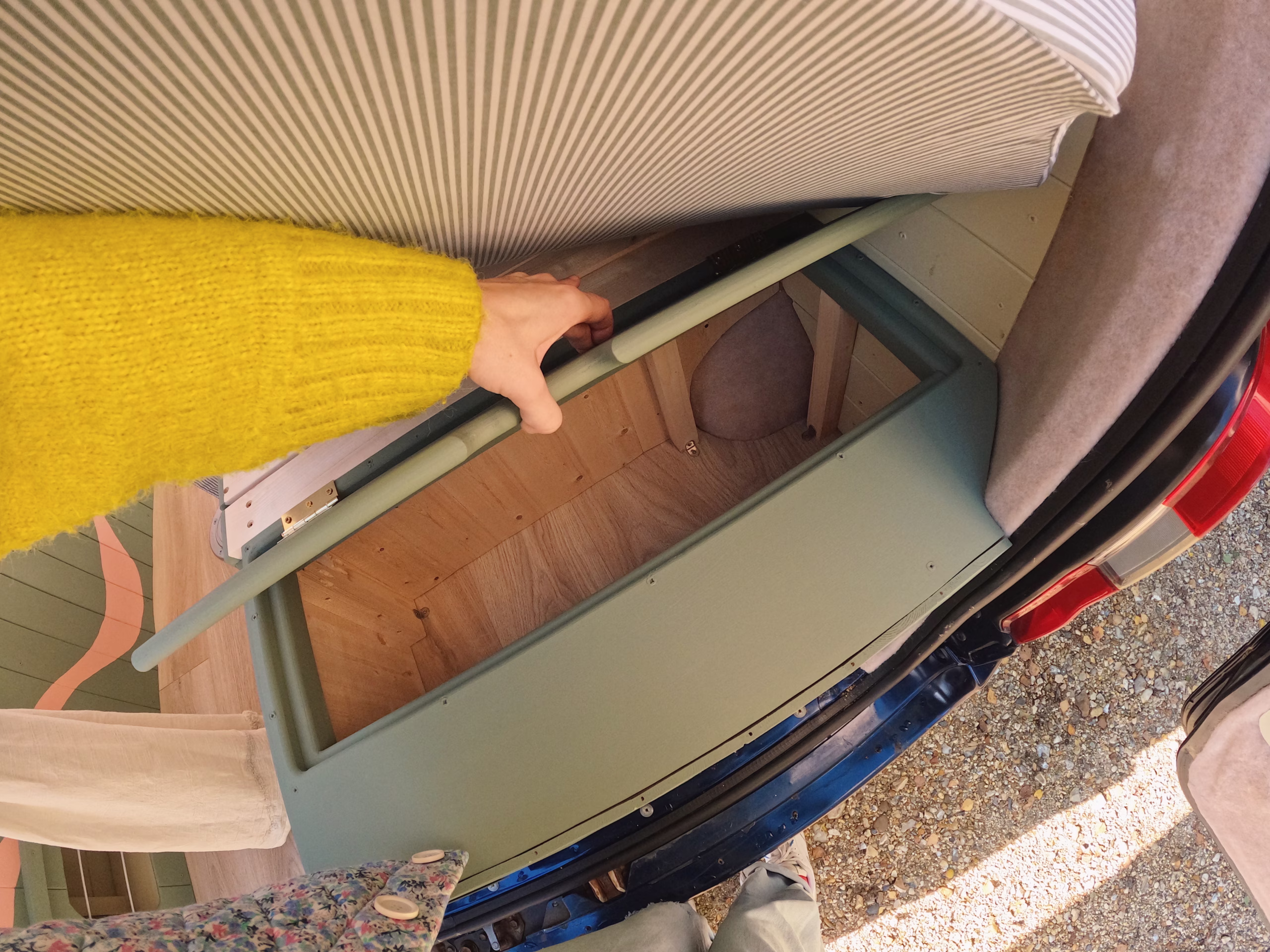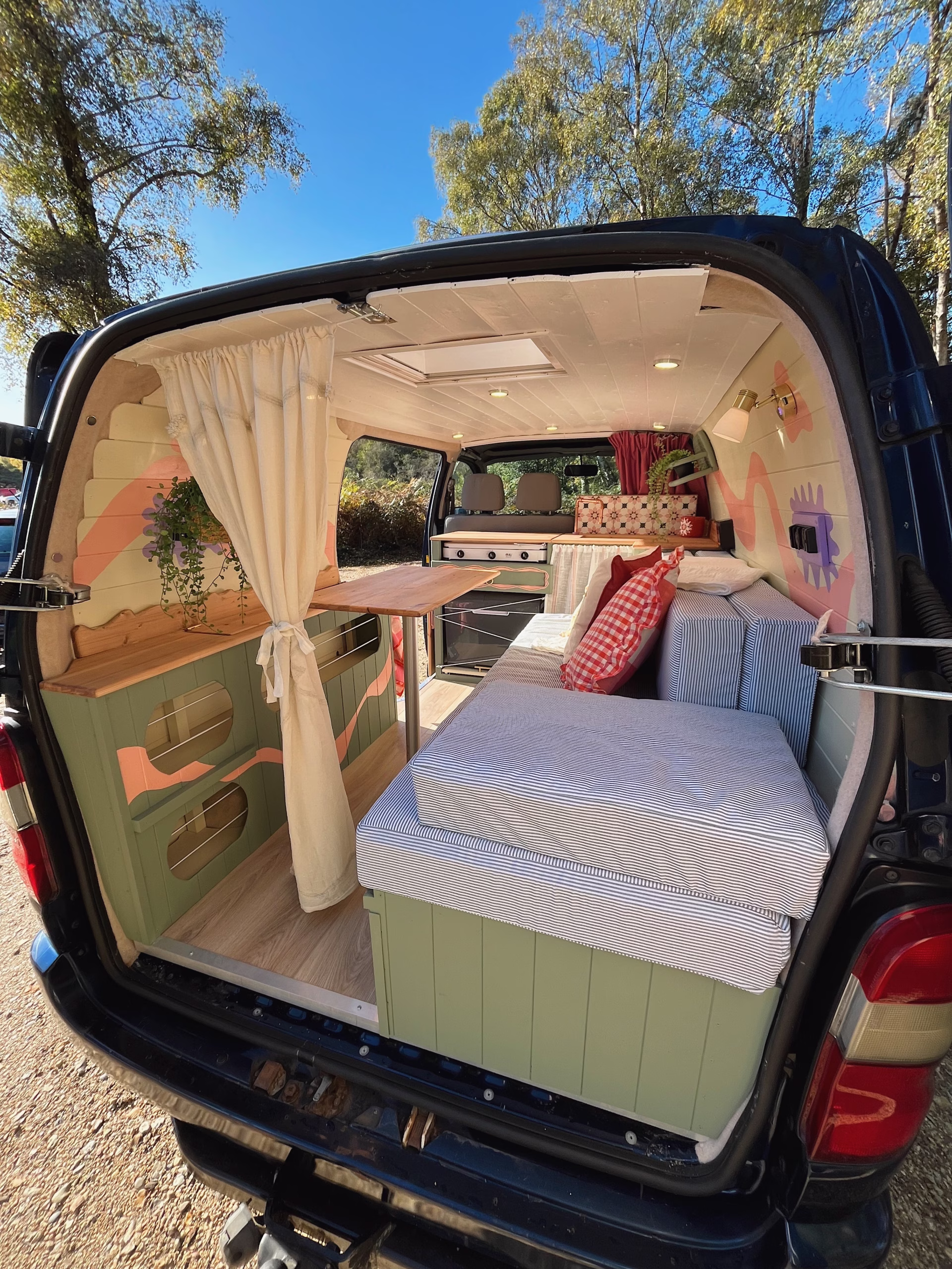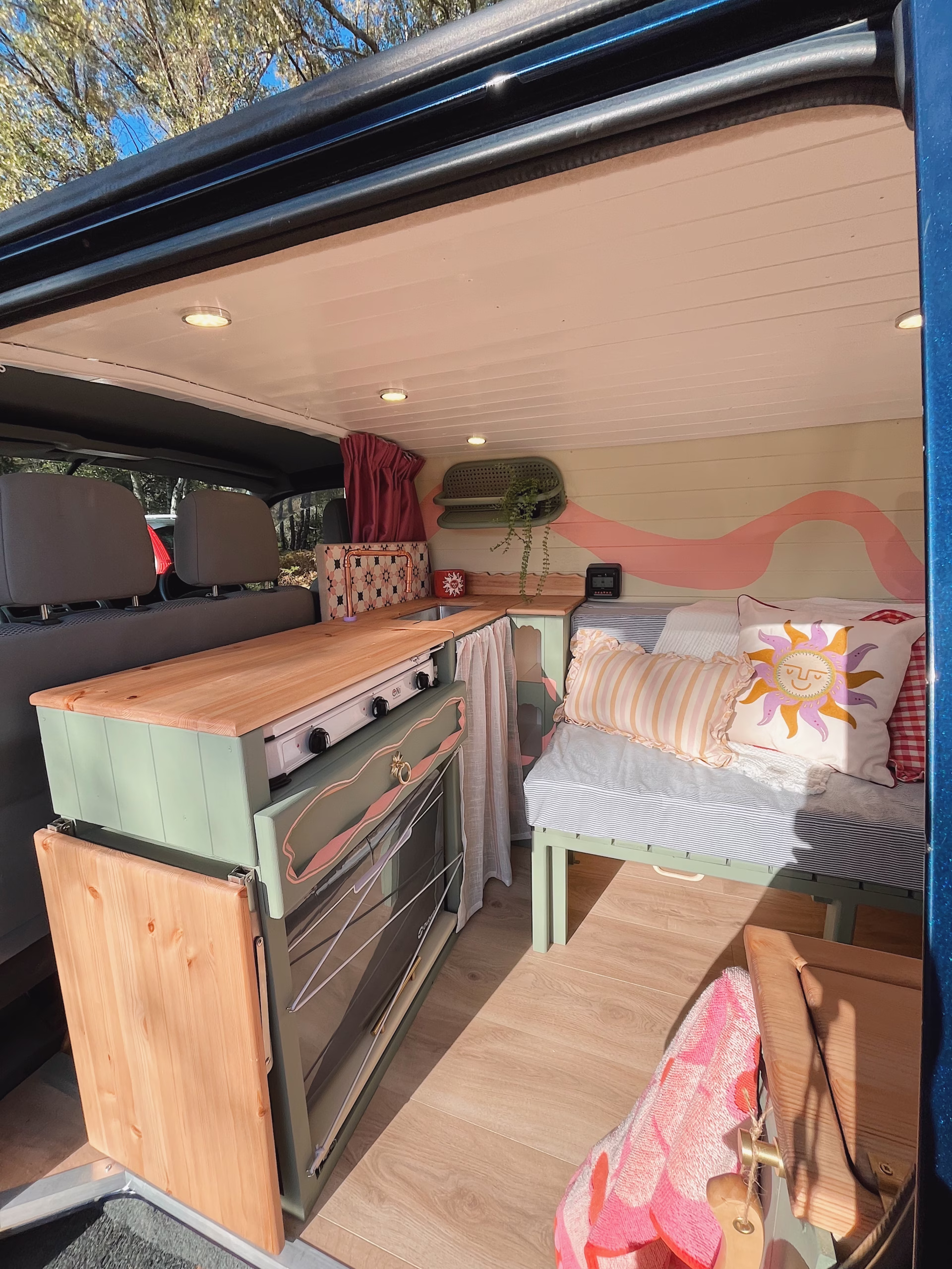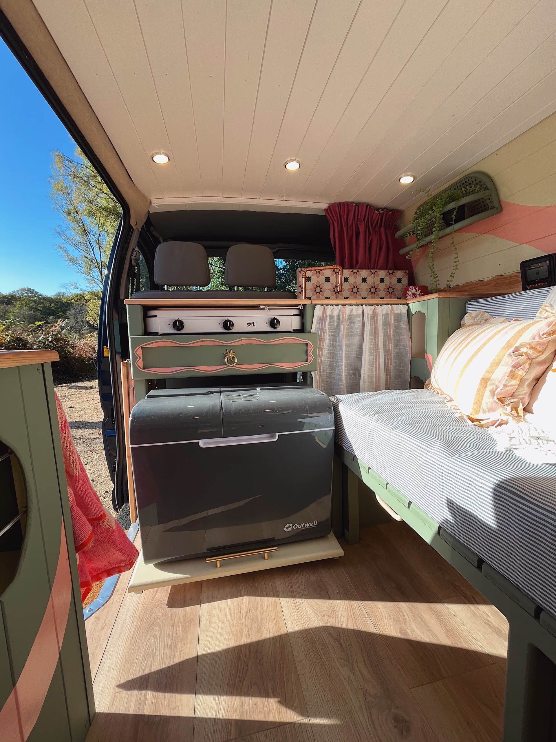 This bespoke conversion compromises of a large L shaped kitchen built with storage in mind. There is a tiled colourful sink splash back, storage via the trio of deep kitchen storage cubby holes and the large draw. There’s a 3 ring gas hob complete with a full Campingaz 907 butane bottle included with Campingaz fittings, all connected up (Campingaz is easily refillable), bespoke swivel copper tap with Whale foot pump (foot pump is a great way of saving water), X2 20L fresh and grey water containers underneath the good-sized rectangular under mounted stainless steel sink. There is a convenient pull up table at the end of the kitchen which provides hugely advantageous worktop space, and outdoor socialising/cooking space. The fridge is a 12V Outwell ECOcool 35L cooler box, which is easily accessible via the compact pull out draw runners and is securely in place whilst driving via the elasticated bungee cord.