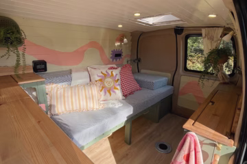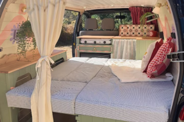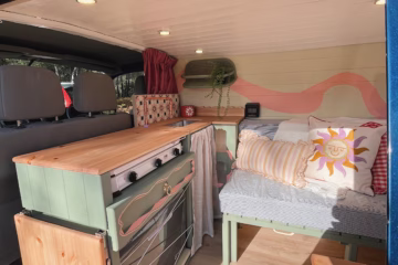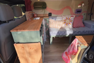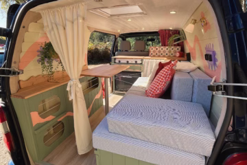 Due to the campers compact low top size it’s easy to manoeuvre and park, not cumbersome, which gives you great piece of mind. There are few vans of this size that are easier to navigate around in urban conditions. The cab is surprisingly car-like, with its vertically oriented steering wheel. You can enter almost every height restricted car park which is hugely advantageous. This camper is a real head turner and is completely unique! It’s undeniably cosy and homely inside which is just what you want from a campervan – a home from home. Converted by CraftyCampers in Southampton.