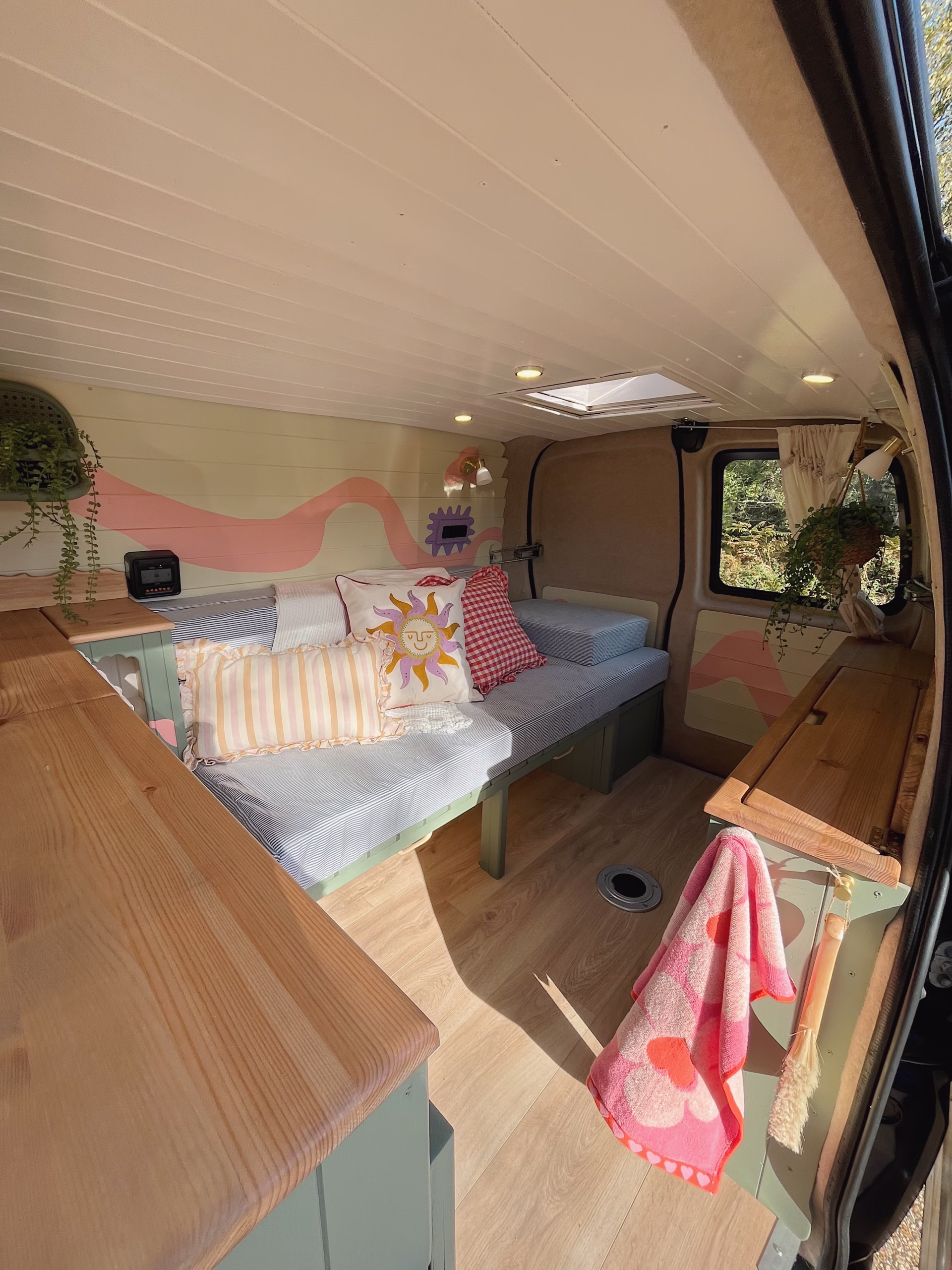 The camper is fully insulated throughout with recycled plastic wool insulation and a second layer of thermawrap foil vapour barrier. The base of the van, underneath the hard wearing laminate flooring, is also insulated with EcoTherm 25mm insulation board. The interior of the camper has been smartly finished with pine tongue and groove cladding and decorated in calming eggshell colours, with the unique wavy hand painted muriel. The inside panel metal work has been lined throughout with sound deadening.