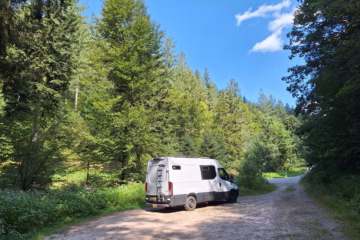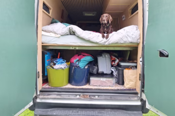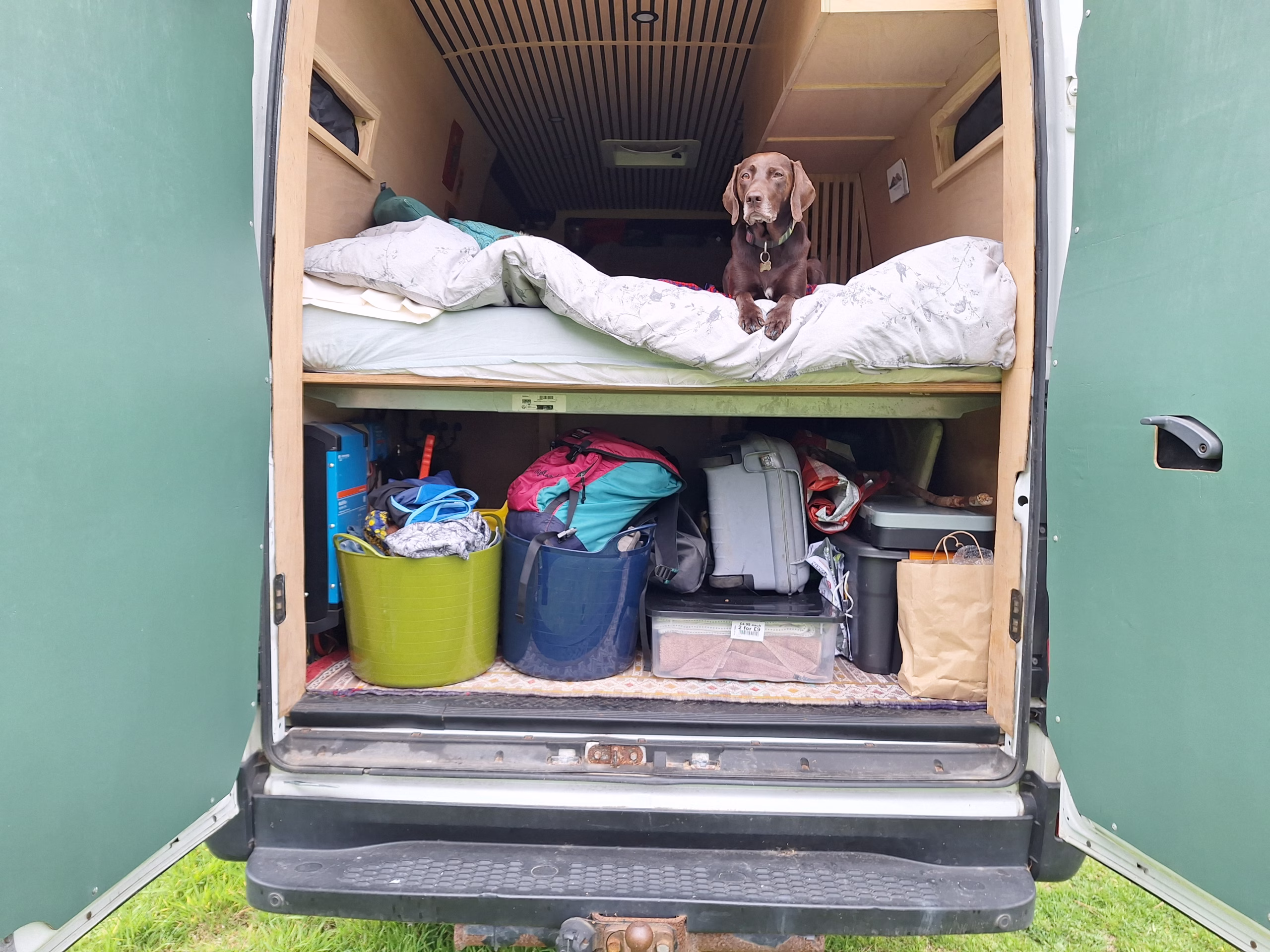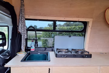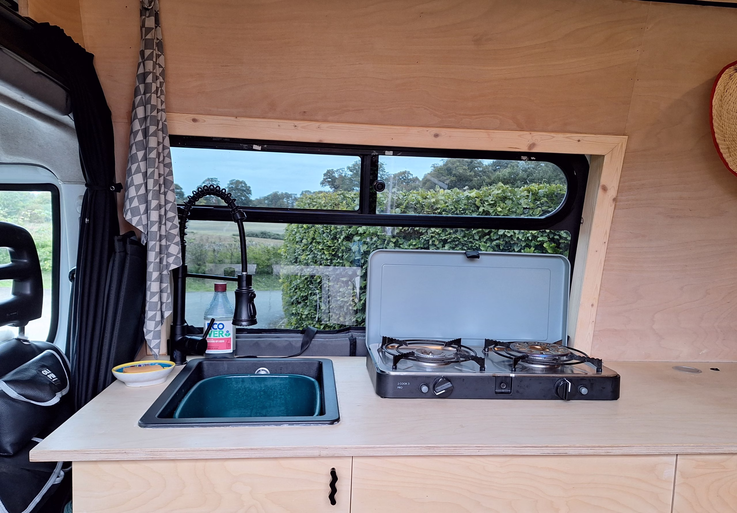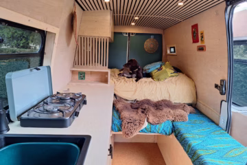The bed is fixed at the back of the van and is a double (175 x135cm). It’s a SIMBA mattress and provides a comfy nights sleep. There are two small windows with insect netting at the back of the van, which provides good ventilation, plus you can open up the back doors to enjoy the views from bed. Plenty of space for a dog bed in the cabin too. Reading lights over the bed and all windows have black out / insulated covers.