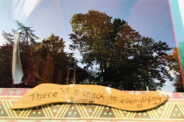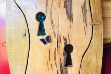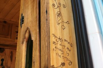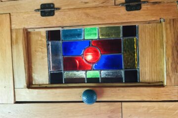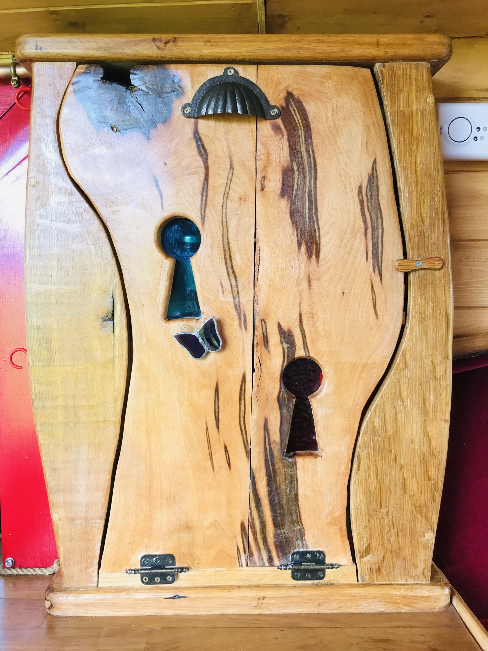 On the worktop kitchen area James has made a quirky little storage cupboard for those essential, get your hands on quickly items such as spices, tea, coffee etc. The details include more coloured glass and keyhole carvings.