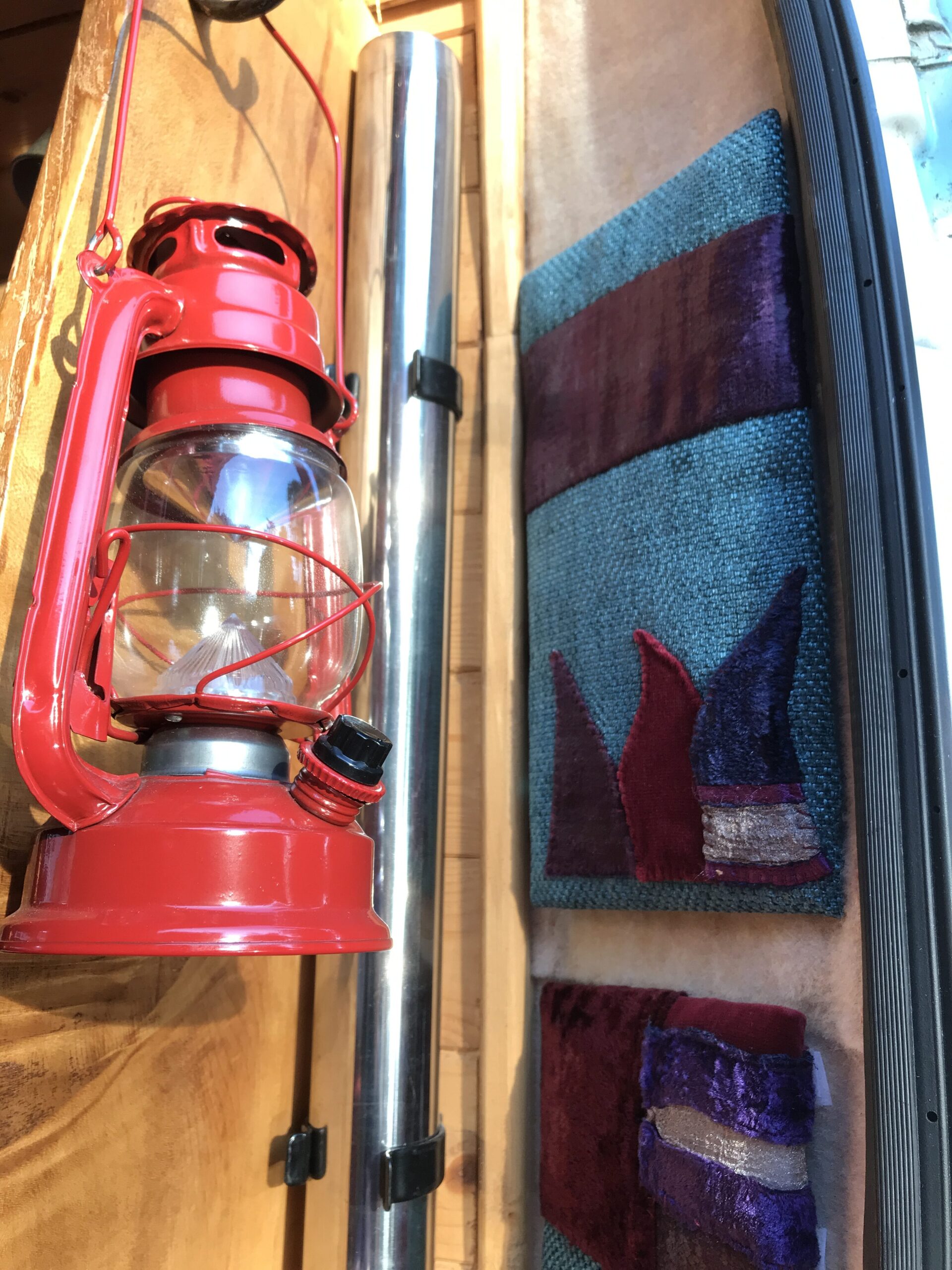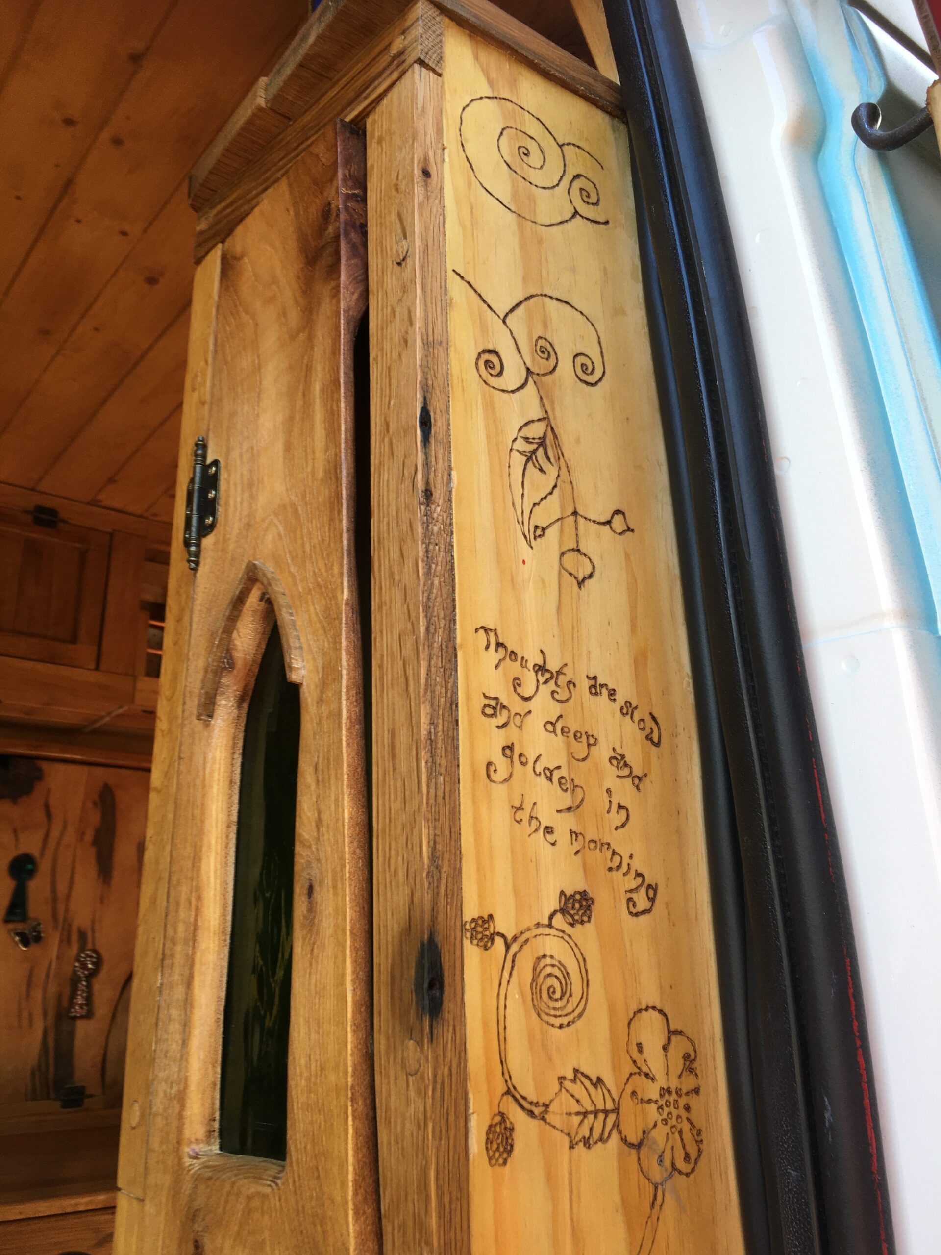 There is a beautiful whimsical cupboard with stained glass detail behind the diesel stove. This Upright cupboard is capable of holding camping chairs, small folding table, folding step and hanging jackets.