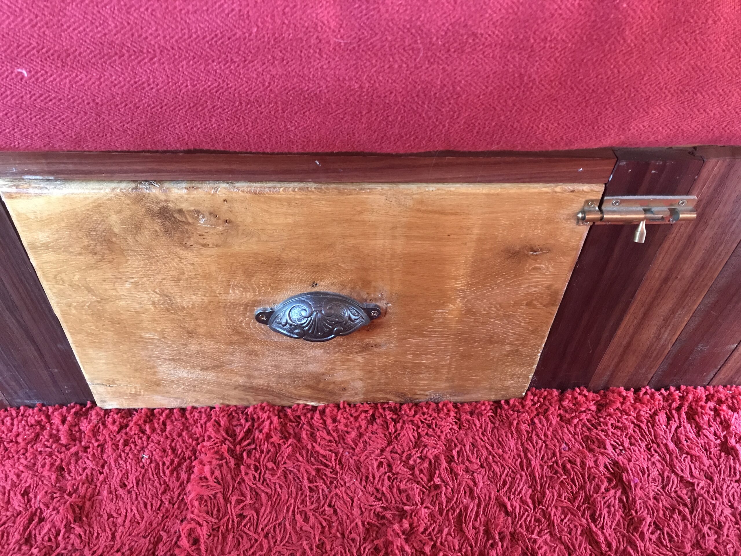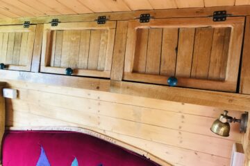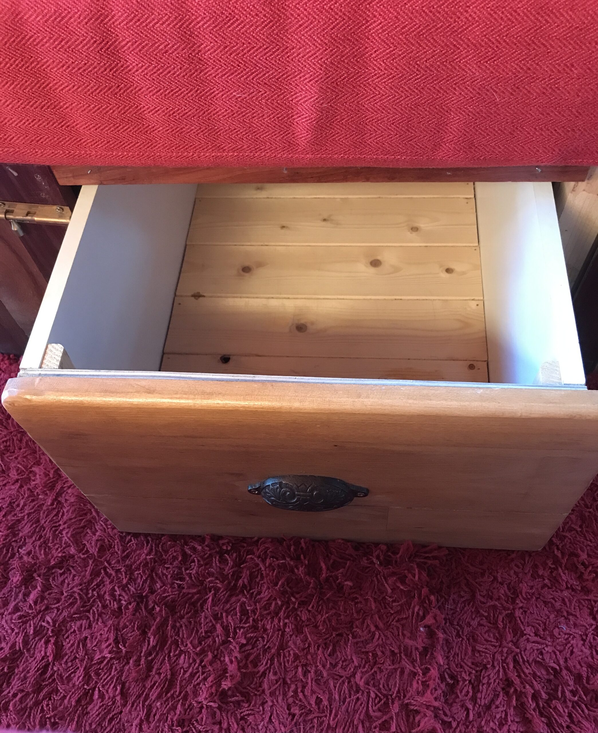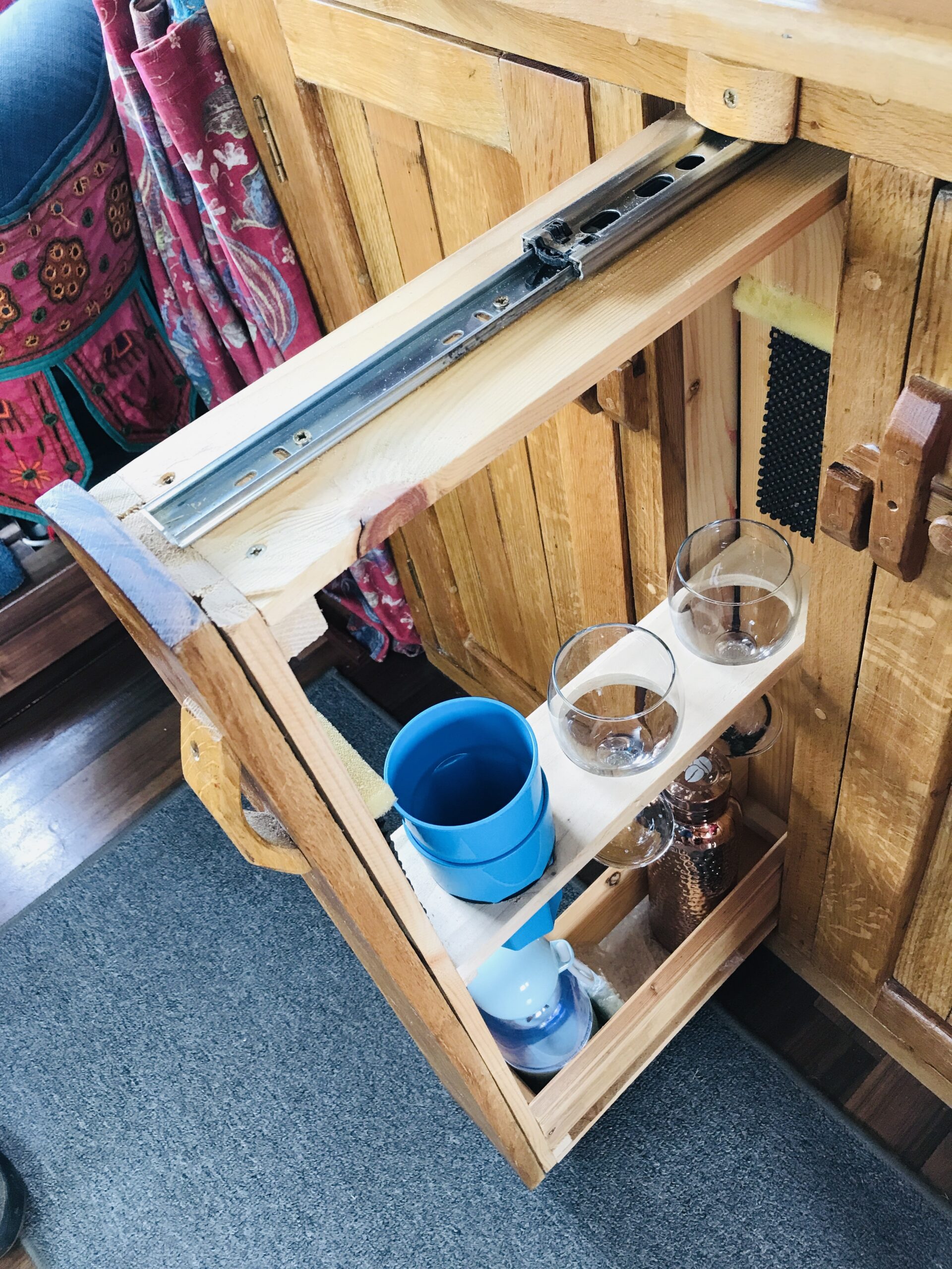 There is more storage cupboards under the sink with gorgeous hand crafted latches. In between the main 2 cupboards there is a handy little pull out pantry to store glasses and water bottles. Also in this area is stored the porta-potti (behind the curtain) as well as a boot basket to get your wet boots off the floor.