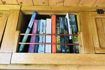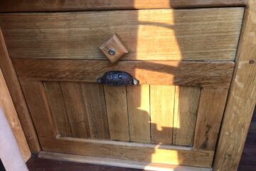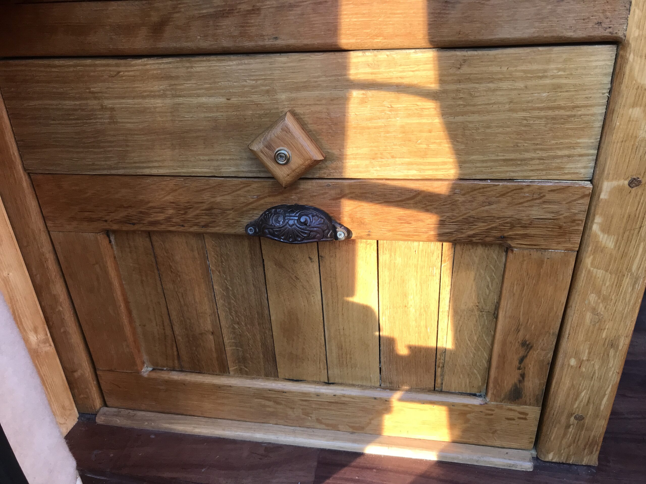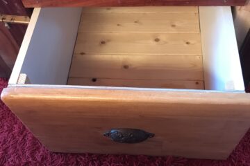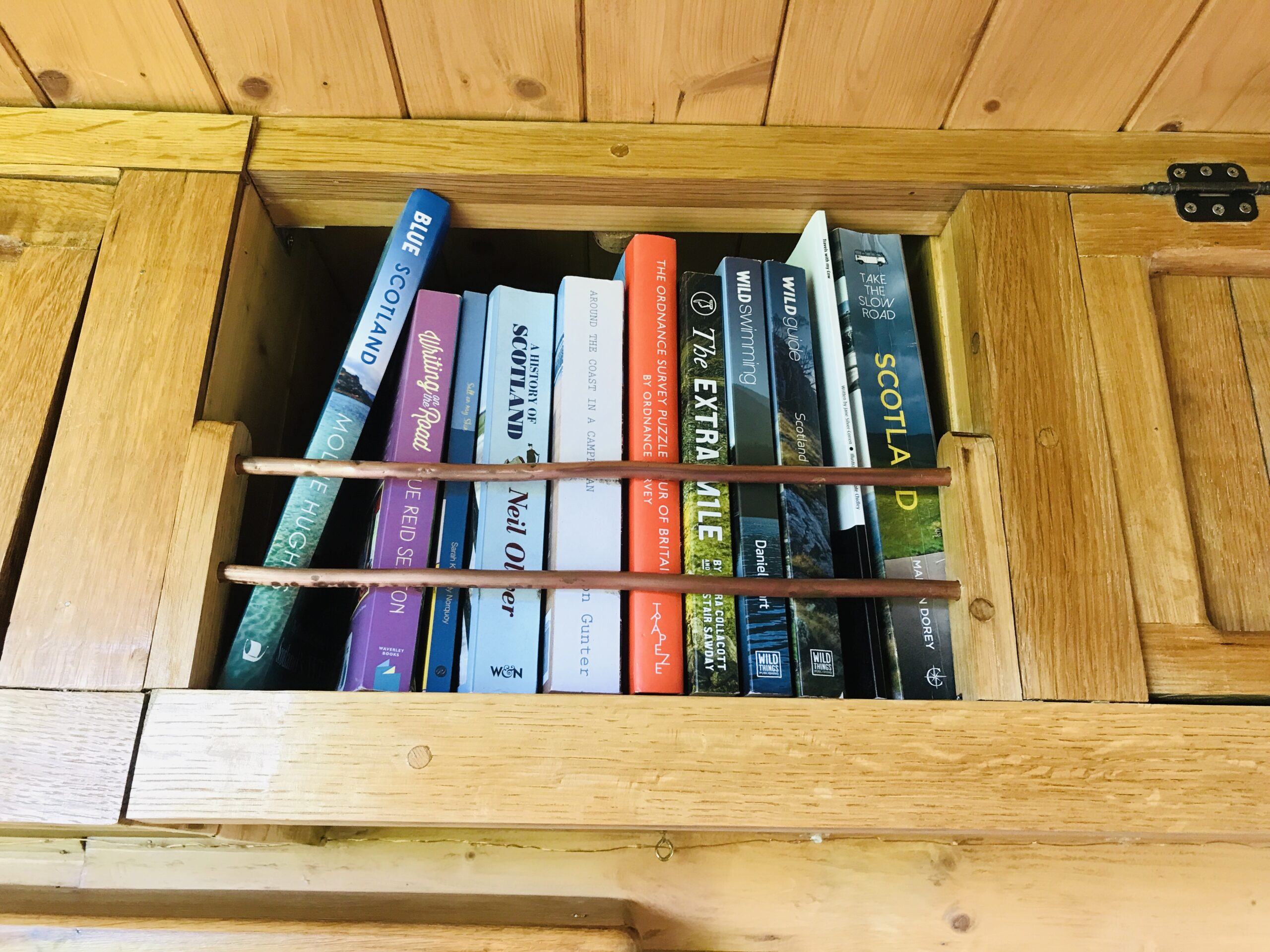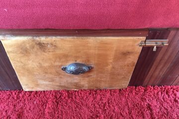 There is more storage cupboards under the sink with gorgeous hand crafted latches. In between the main 2 cupboards there is a handy little pull out pantry to store glasses and water bottles. Also in this area is stored the porta-potti (behind the curtain) as well as a boot basket to get your wet boots off the floor.