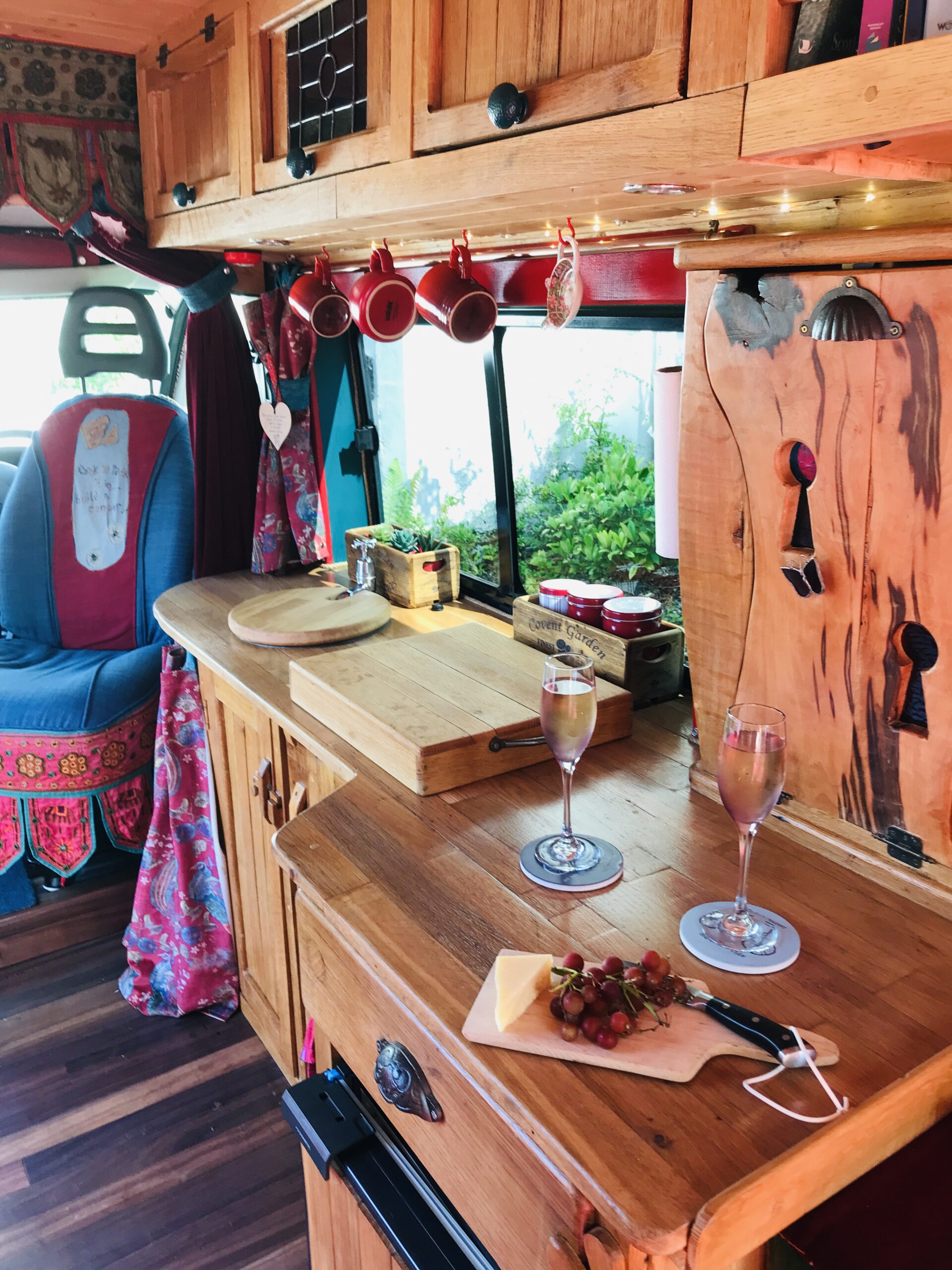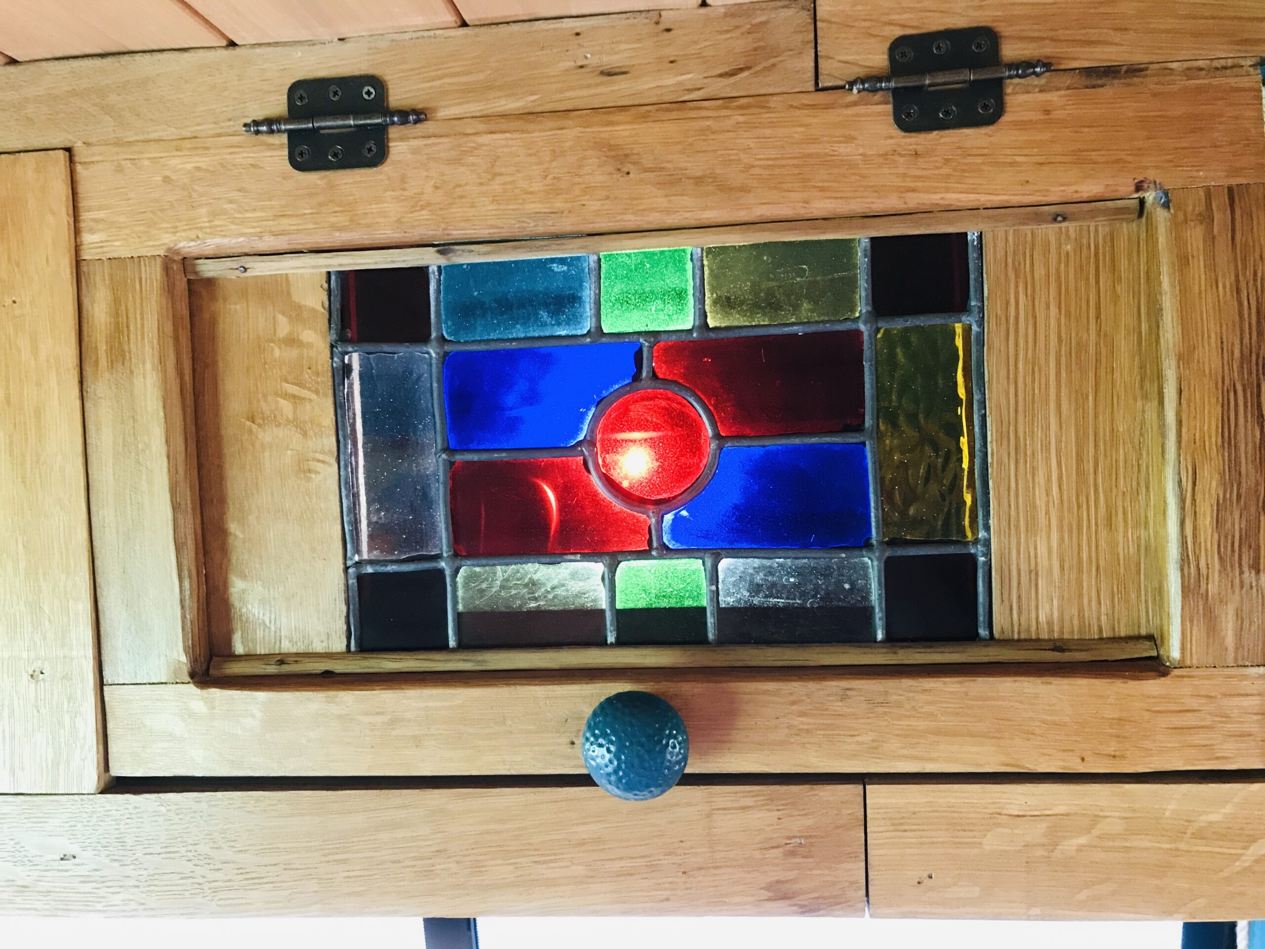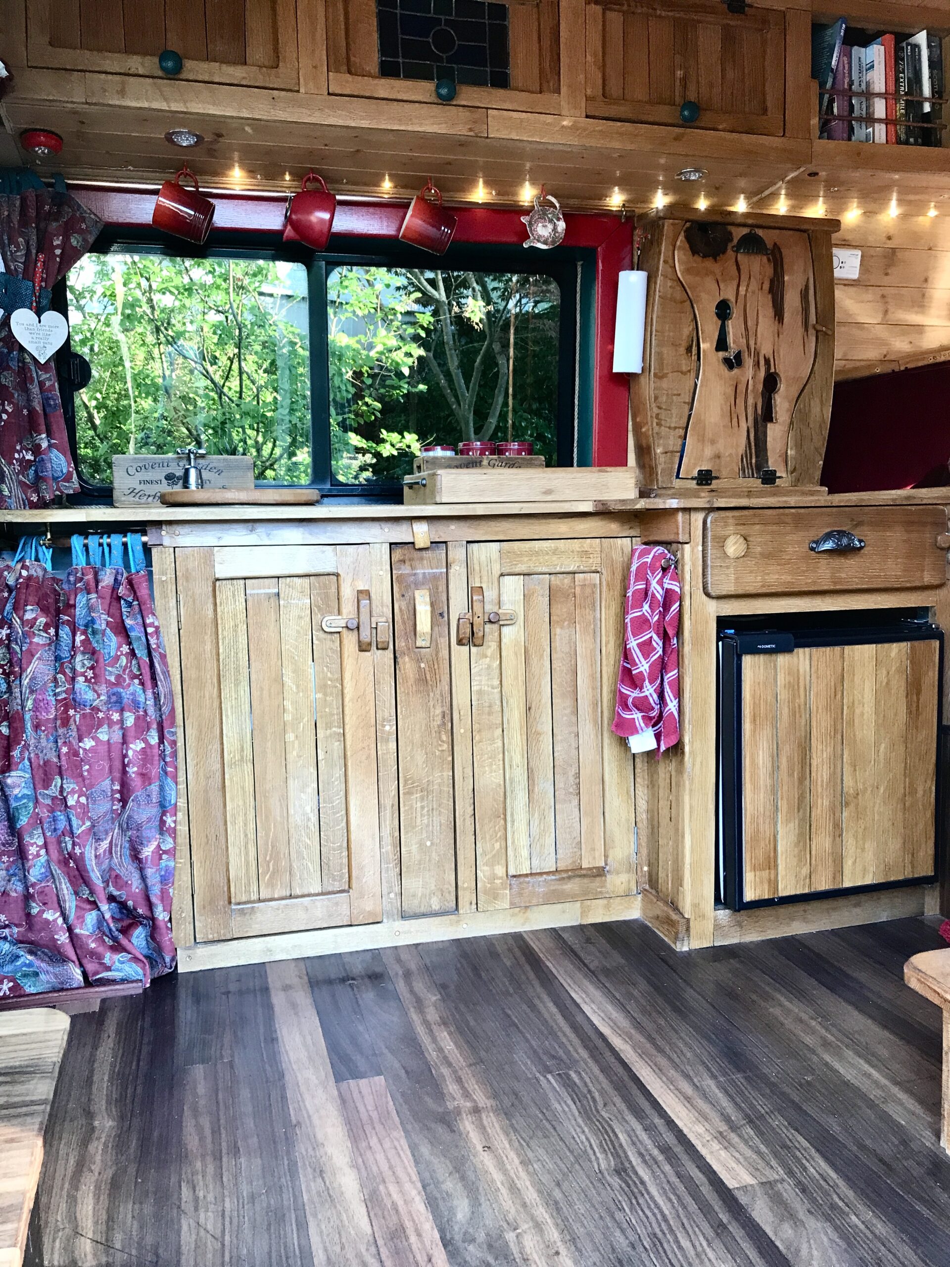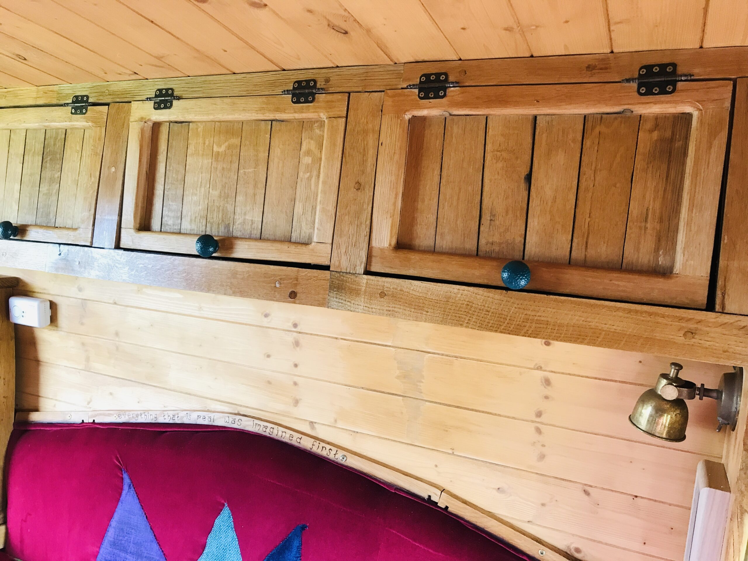 Six generous overhead cupboards run the length of one side of the van. Each cupboard is painted a different colour inside which helps you remember which cupboard things are in! One cupboard has a beautiful stained glass insert to add another unique touch.