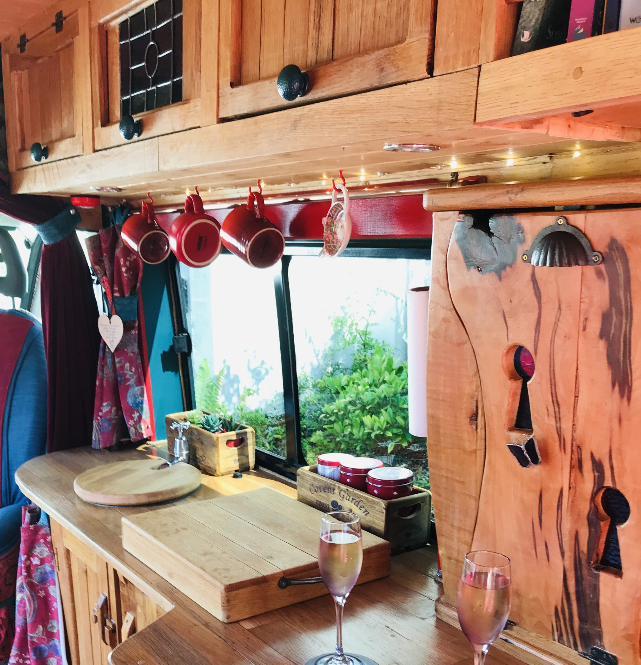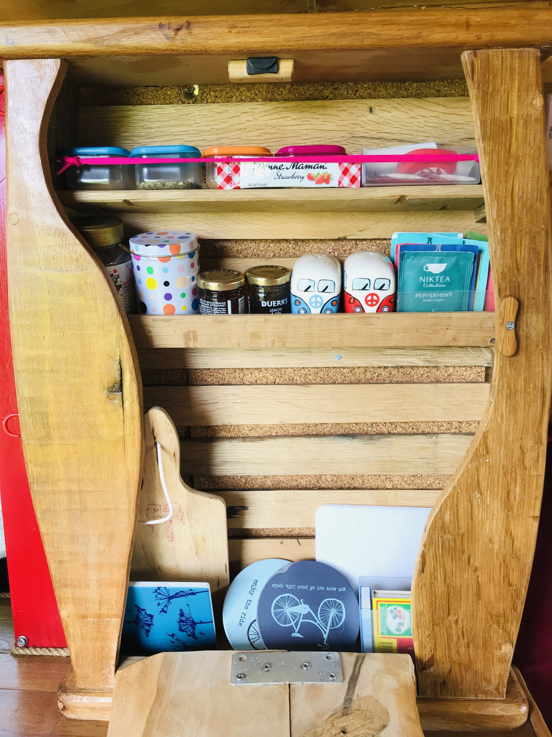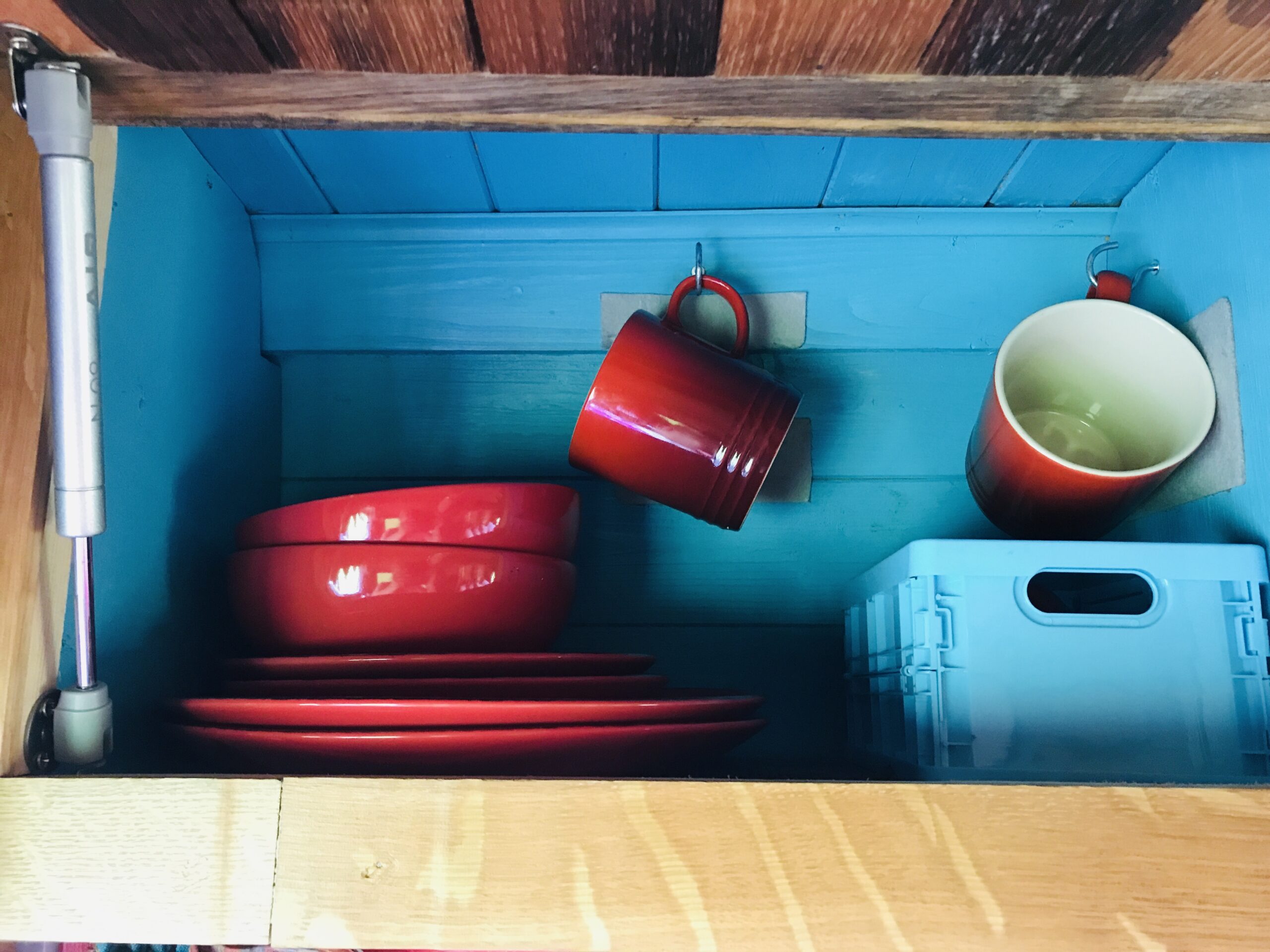Six generous overhead cupboards run the length of one side of the van. Each cupboard is painted a different colour inside which helps you remember which cupboard things are in! One cupboard has a beautiful stained glass insert to add another unique touch.