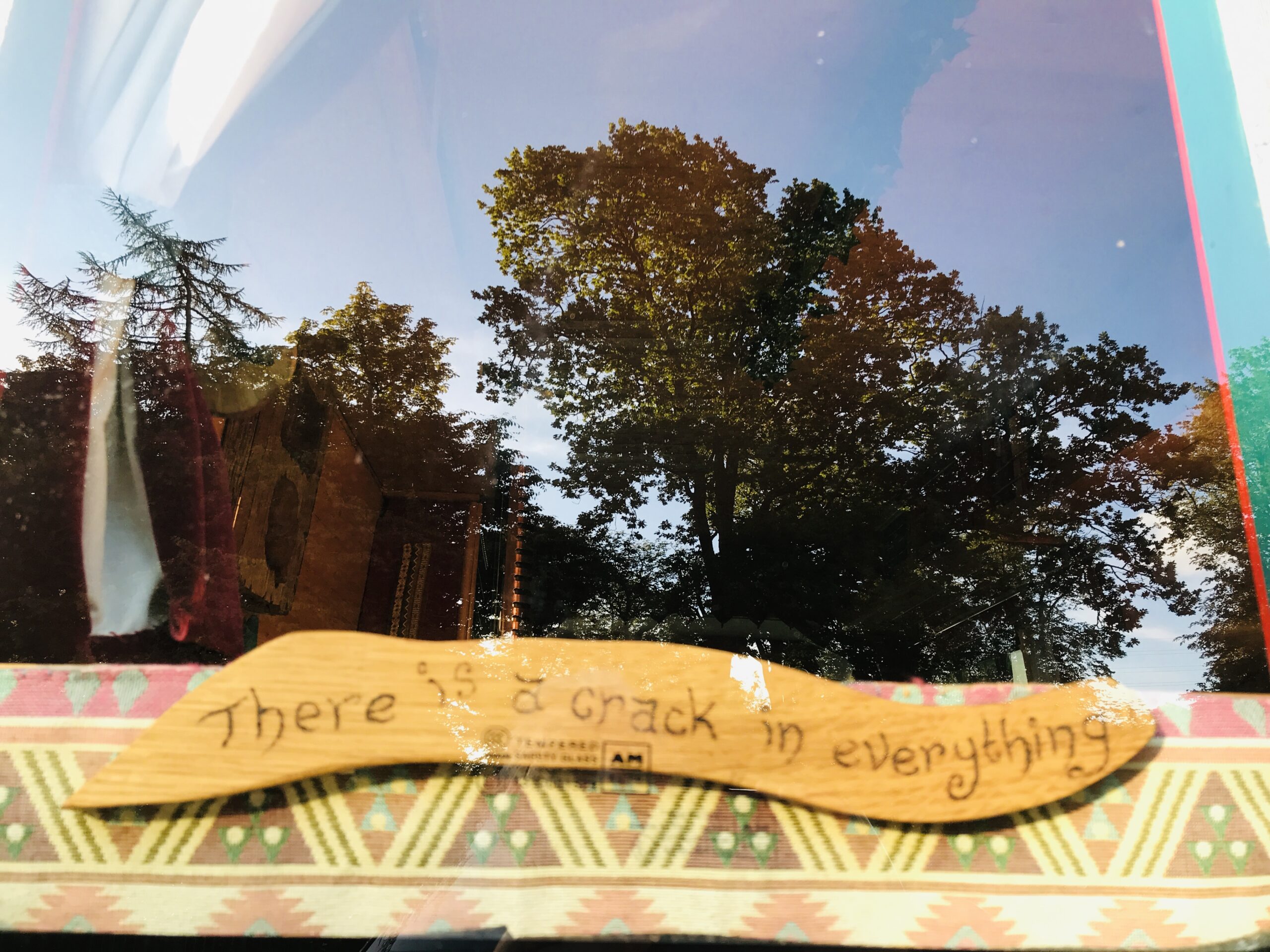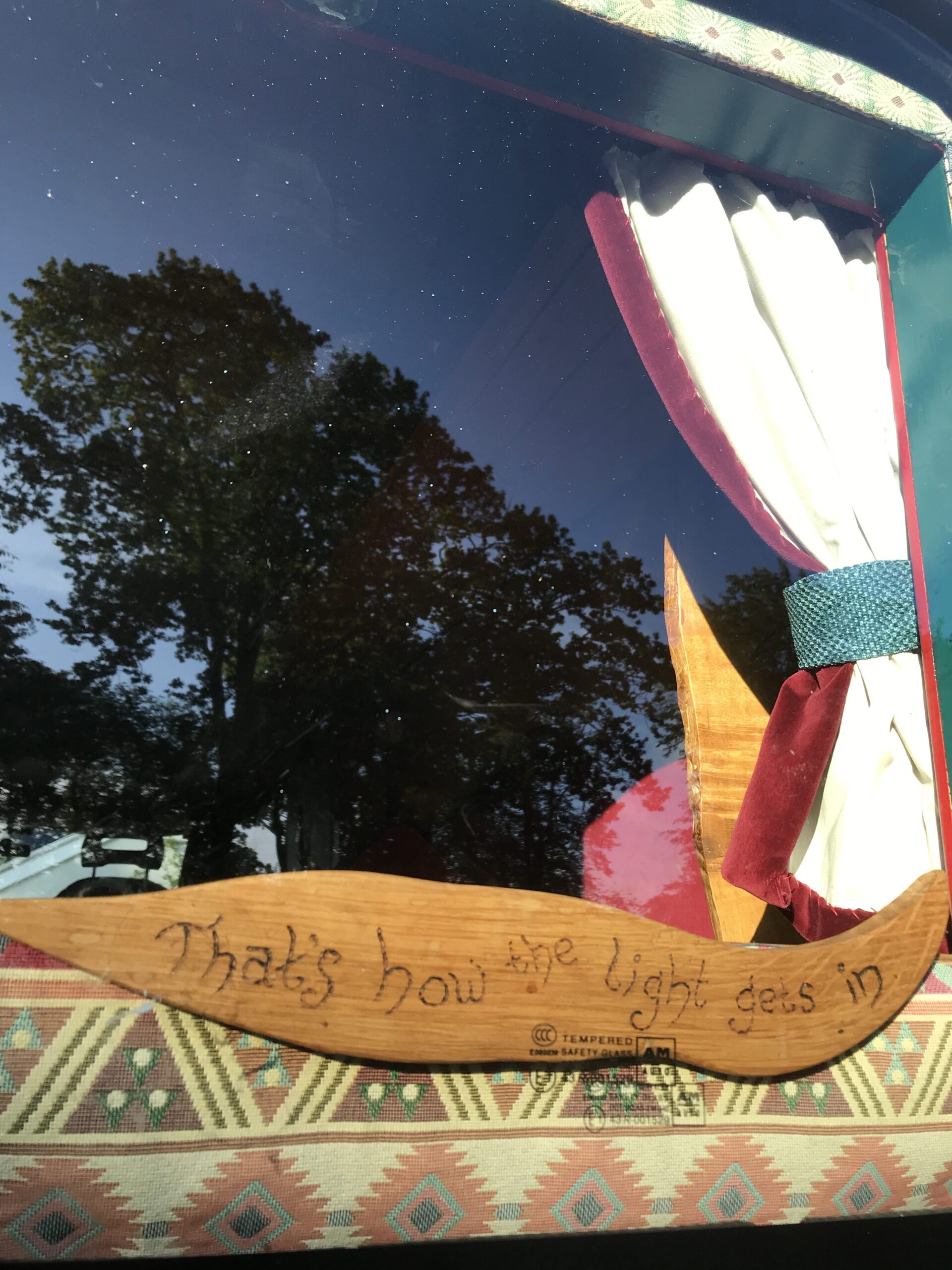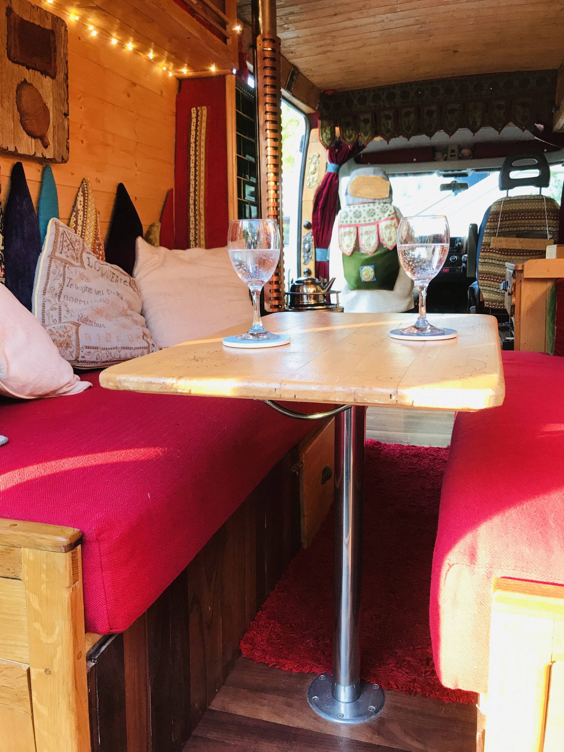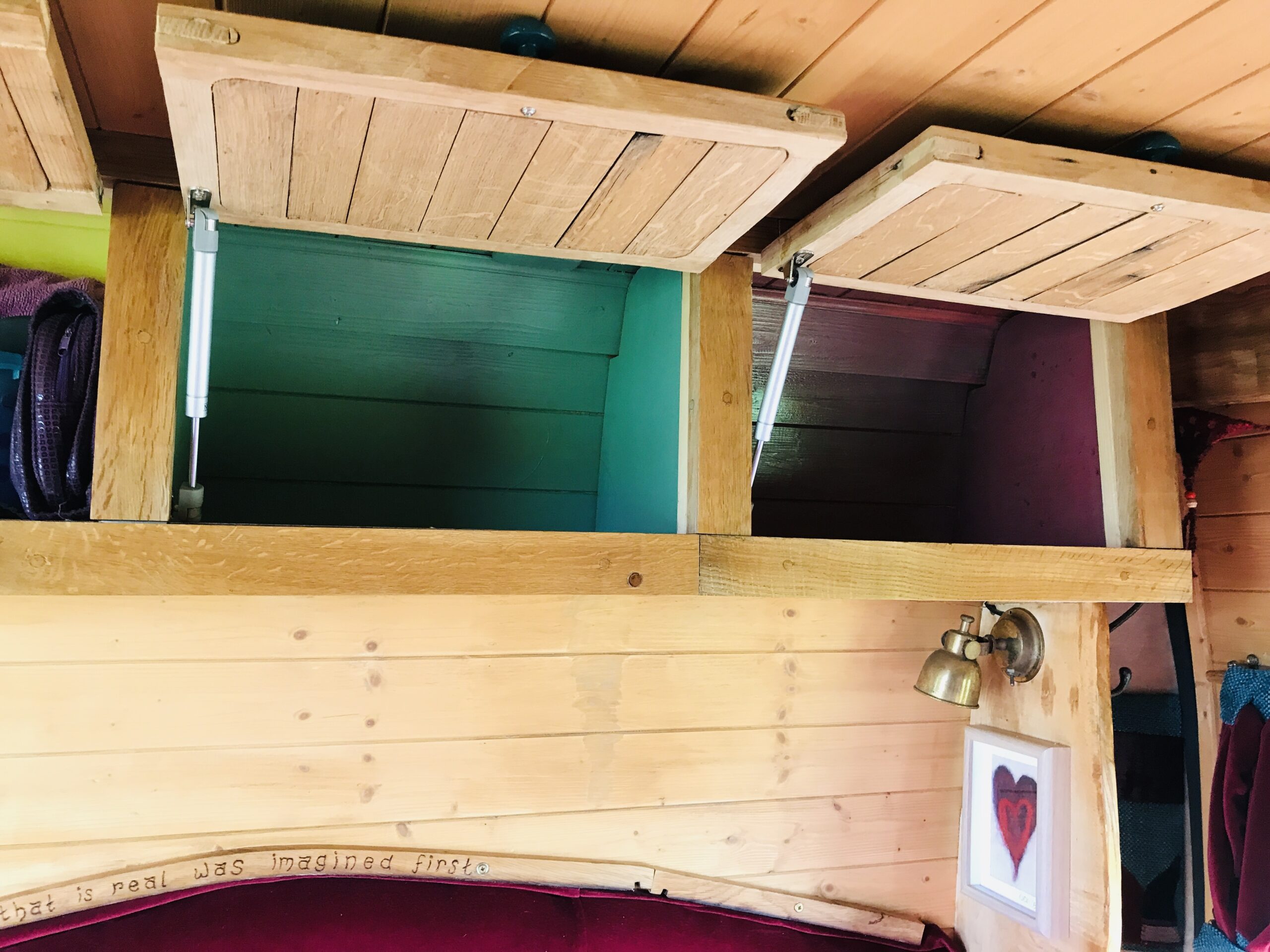 Six generous overhead cupboards run the length of one side of the van. Each cupboard is painted a different colour inside which helps you remember which cupboard things are in! One cupboard has a beautiful stained glass insert to add another unique touch.