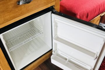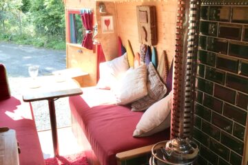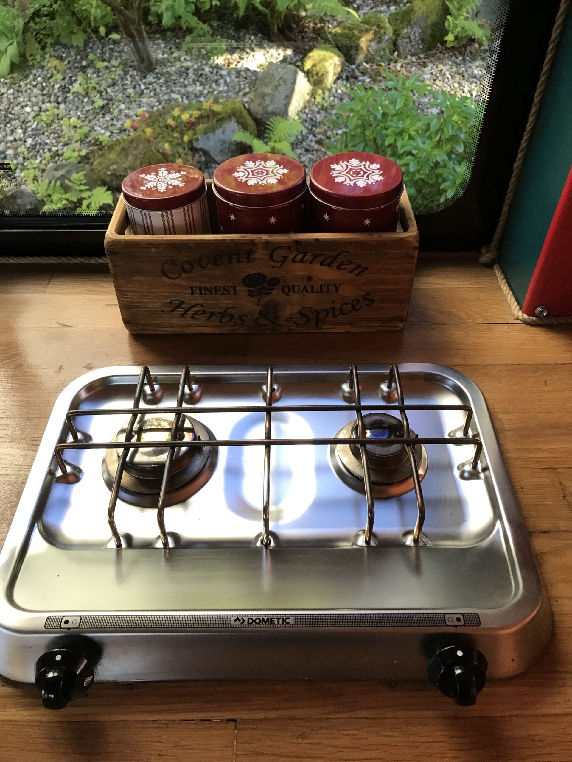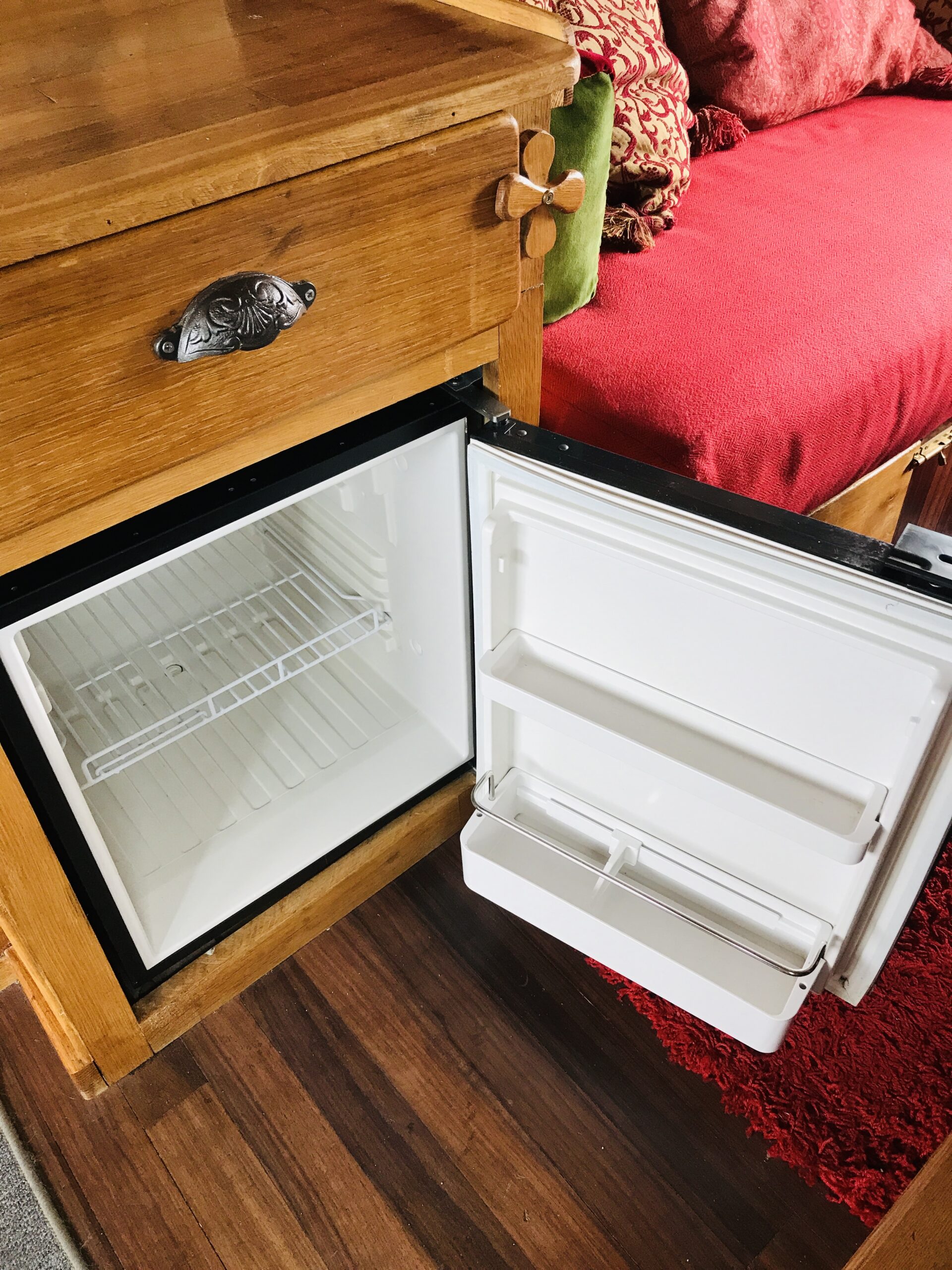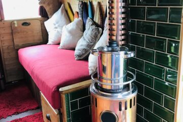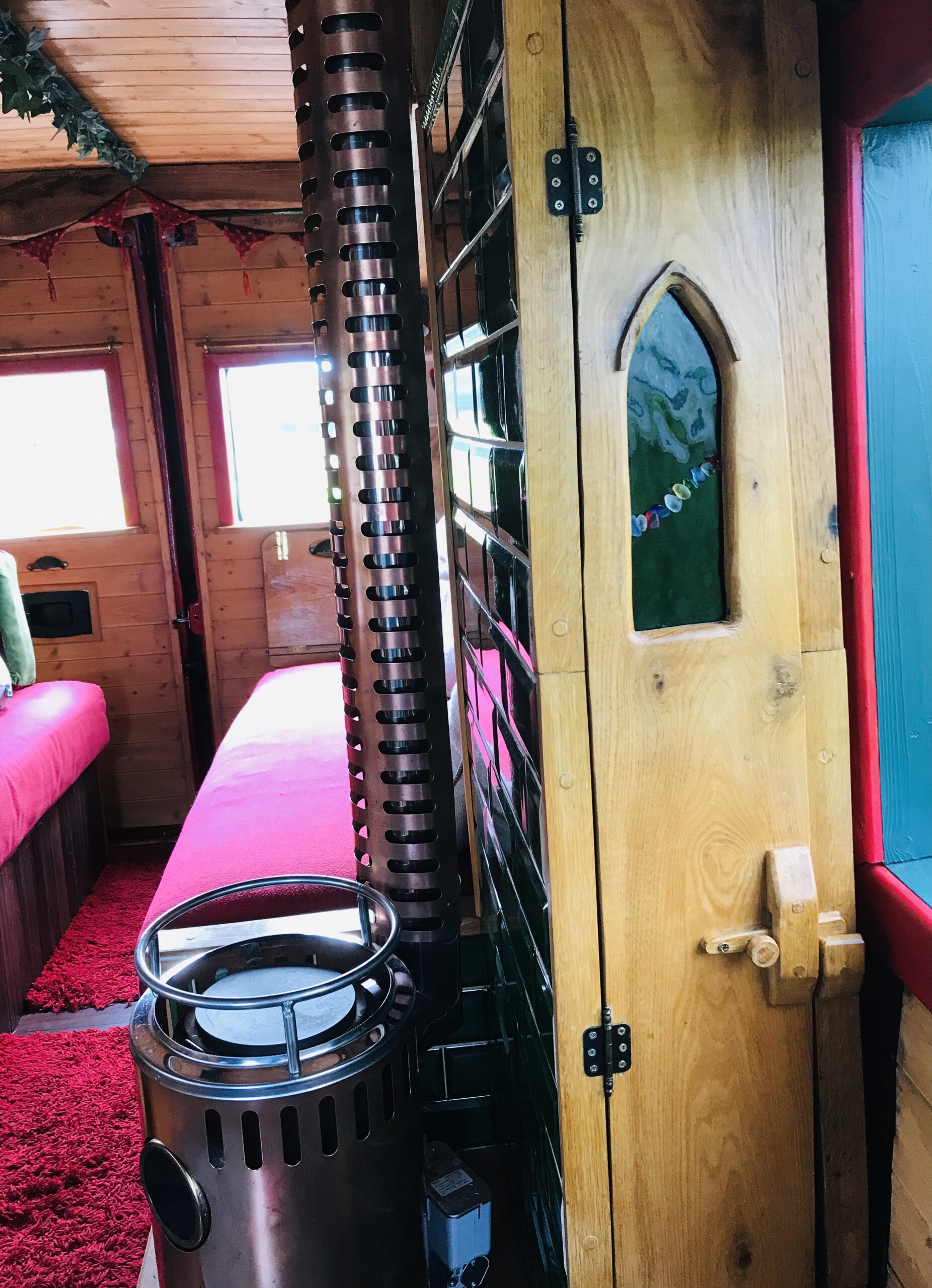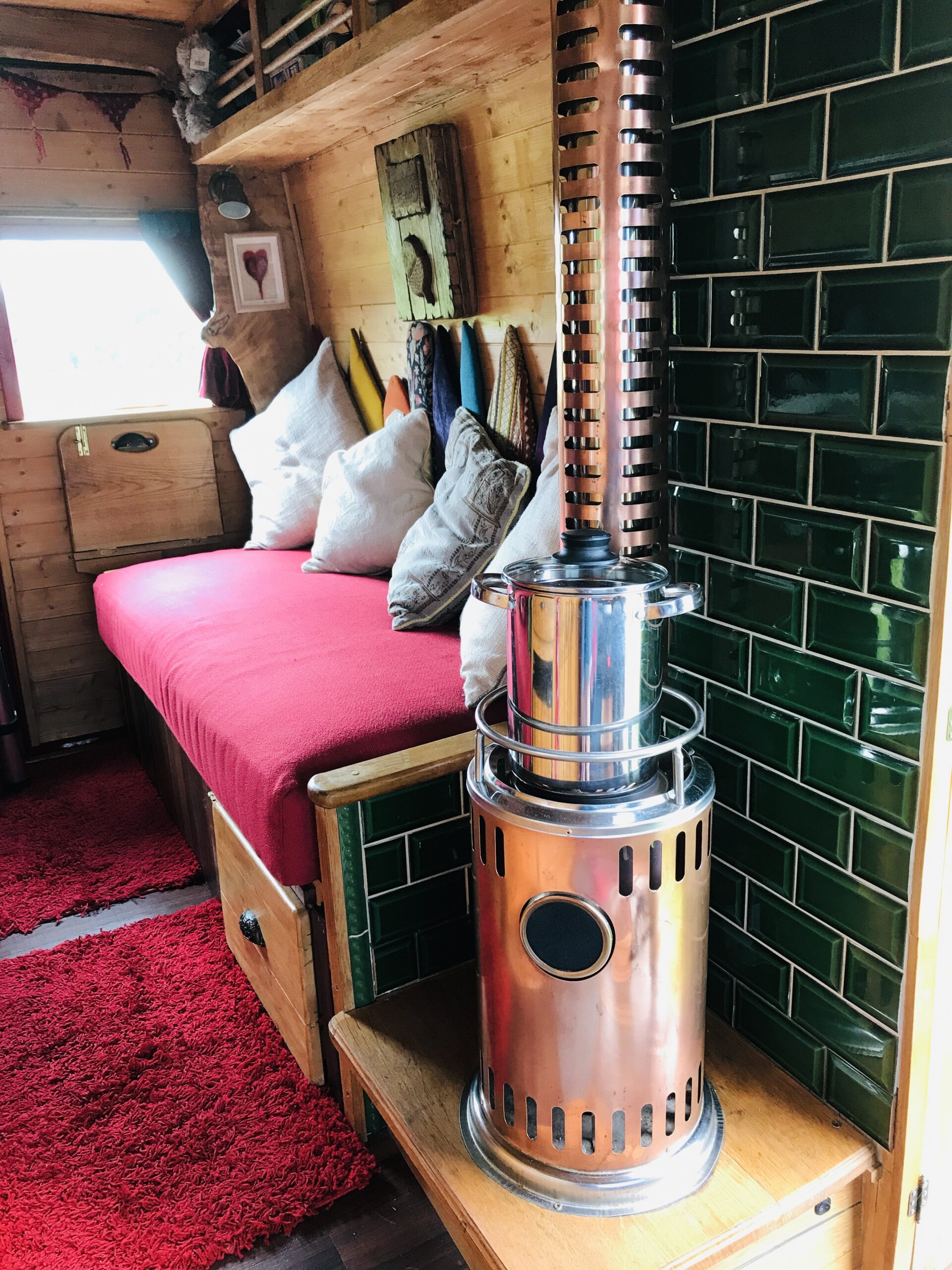 Ruby is totally off-grid with power from 2 solar panels on the roof. She has a gas stove as well as a Refleks diesel stove that you can cook from. The refleks diesel heater takes diesel directly from the tank so no need to carry extra diesel. There is a cut off switch which will not allow the heater to run if there is less than 20% diesel in the tank. This ensures you never deplete your driving diesel and run out! The heater has a beautiful window so you can see the flame which makes Ruby a lovely cosy space in the evenings in the winter. Not forgetting you can cook your baked potatoes for the next day on it whilst it’s doing so!