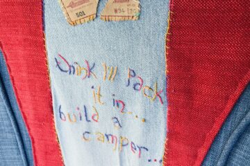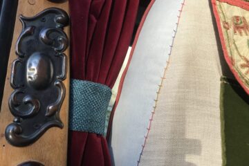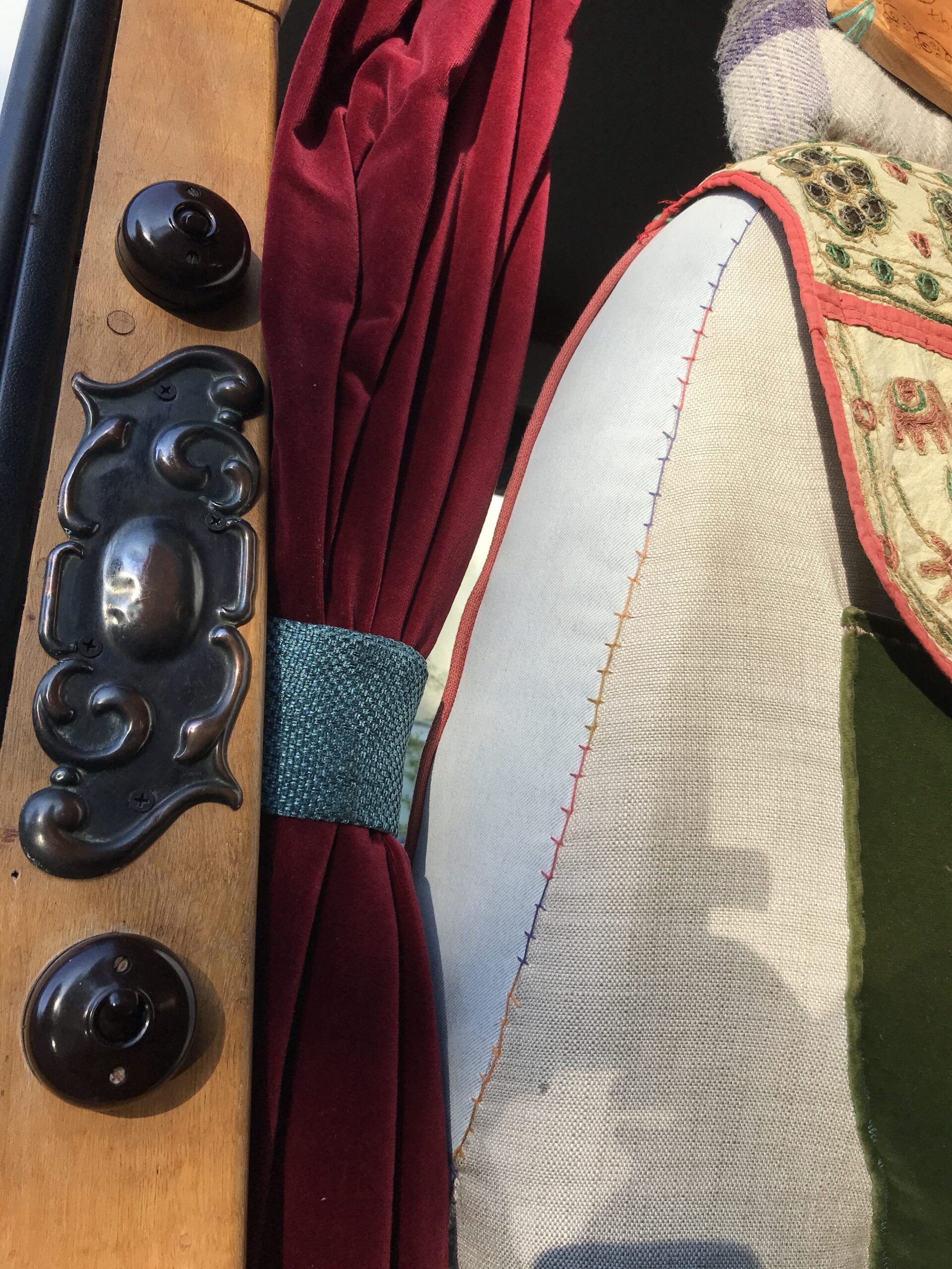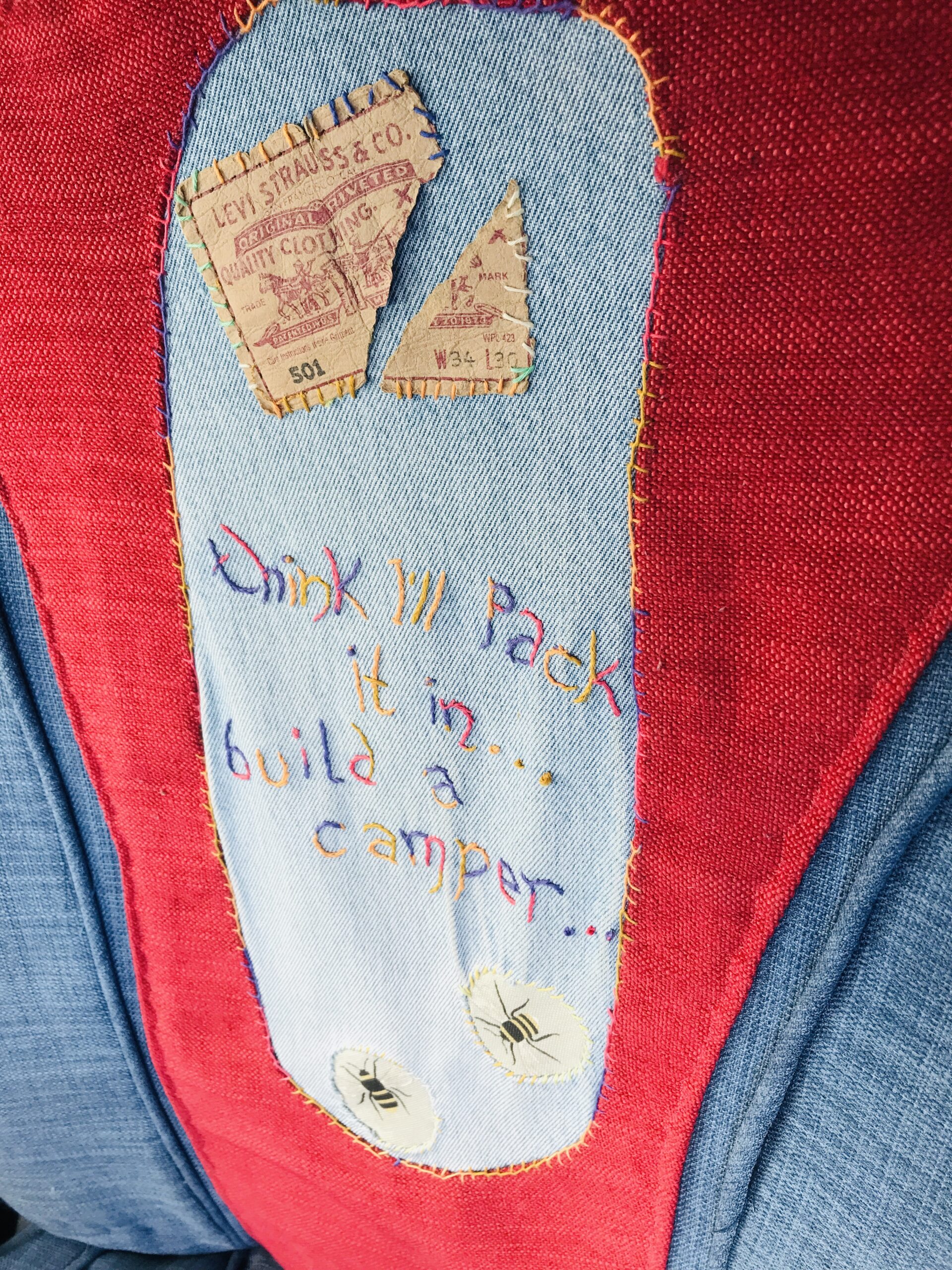The bed set up is a bench style conversion which makes into a double bed within 3 minutes. We know this because Anita timed it! The super thick bench seats allow for a magically comfortable sleep whether as a single bed or a double. The bed measures 180 cm length and 150 cm width fully made up. The bed footer has been upholstered in a whimsical theme that I’ve tried to replicate in other upholstered areas of the van ie the bench seat back, the back curtains and the vent cover panels.