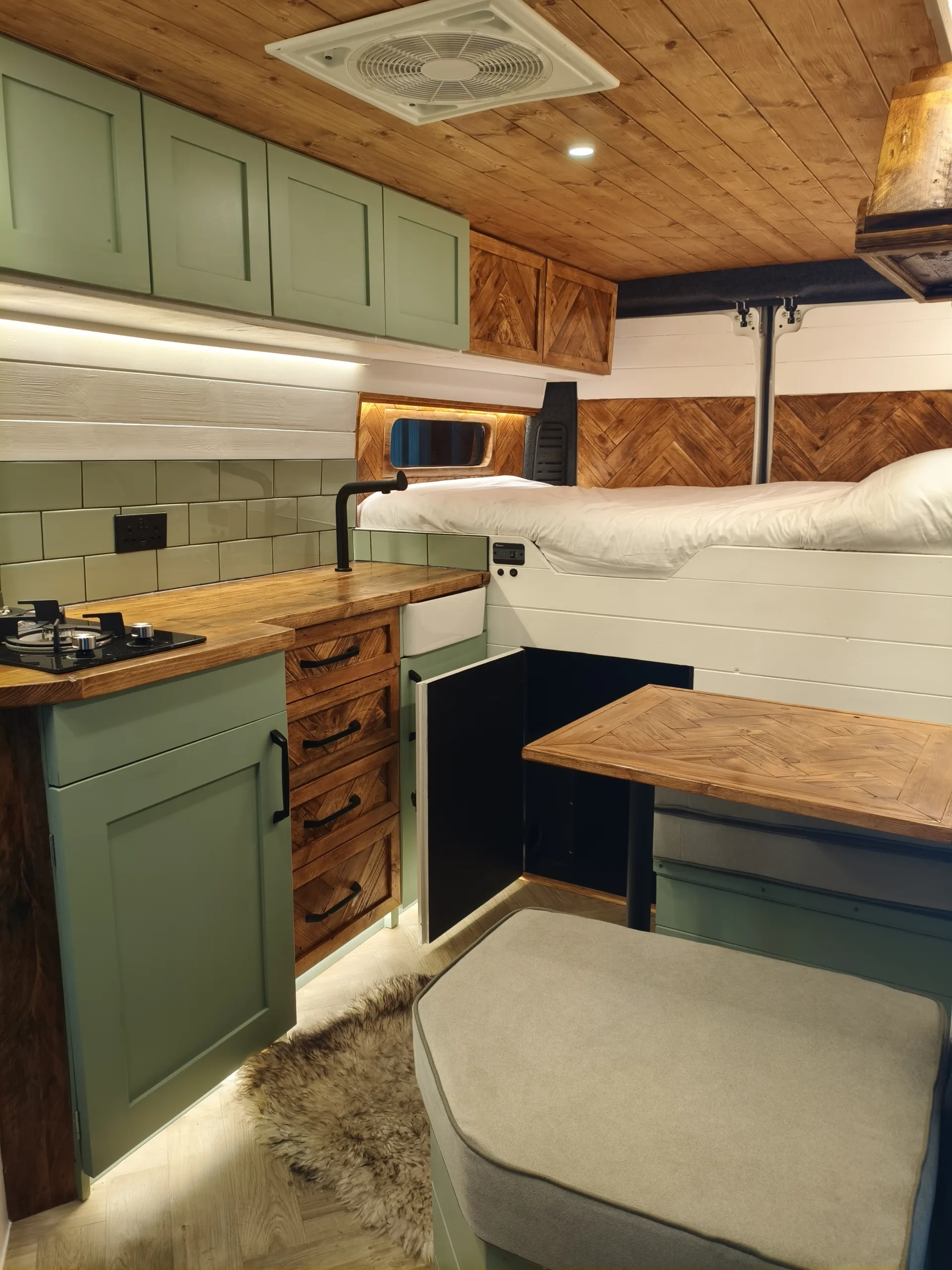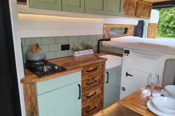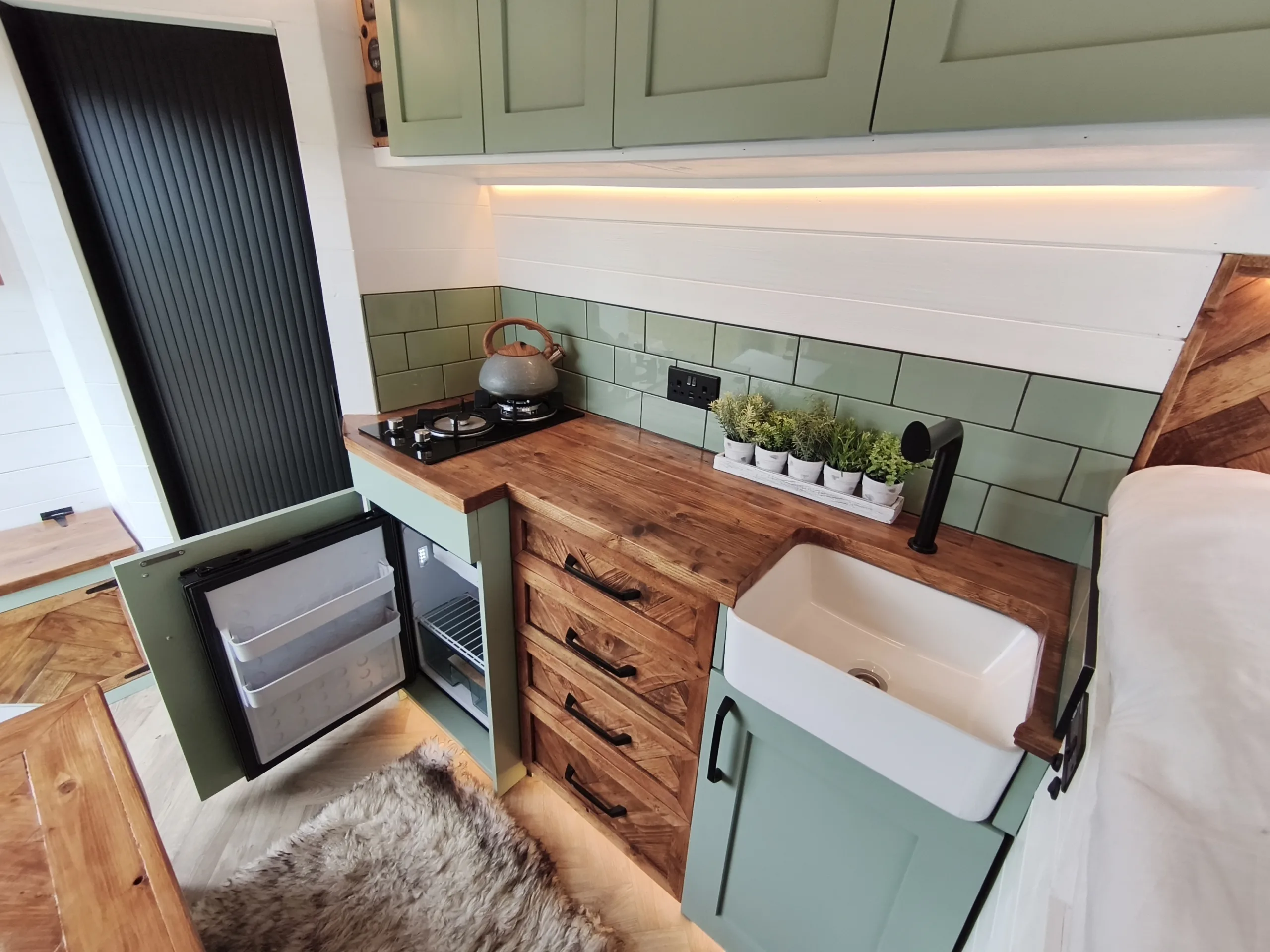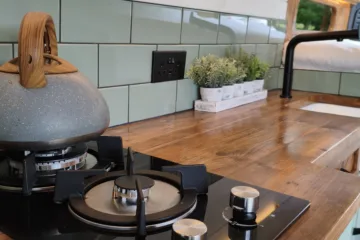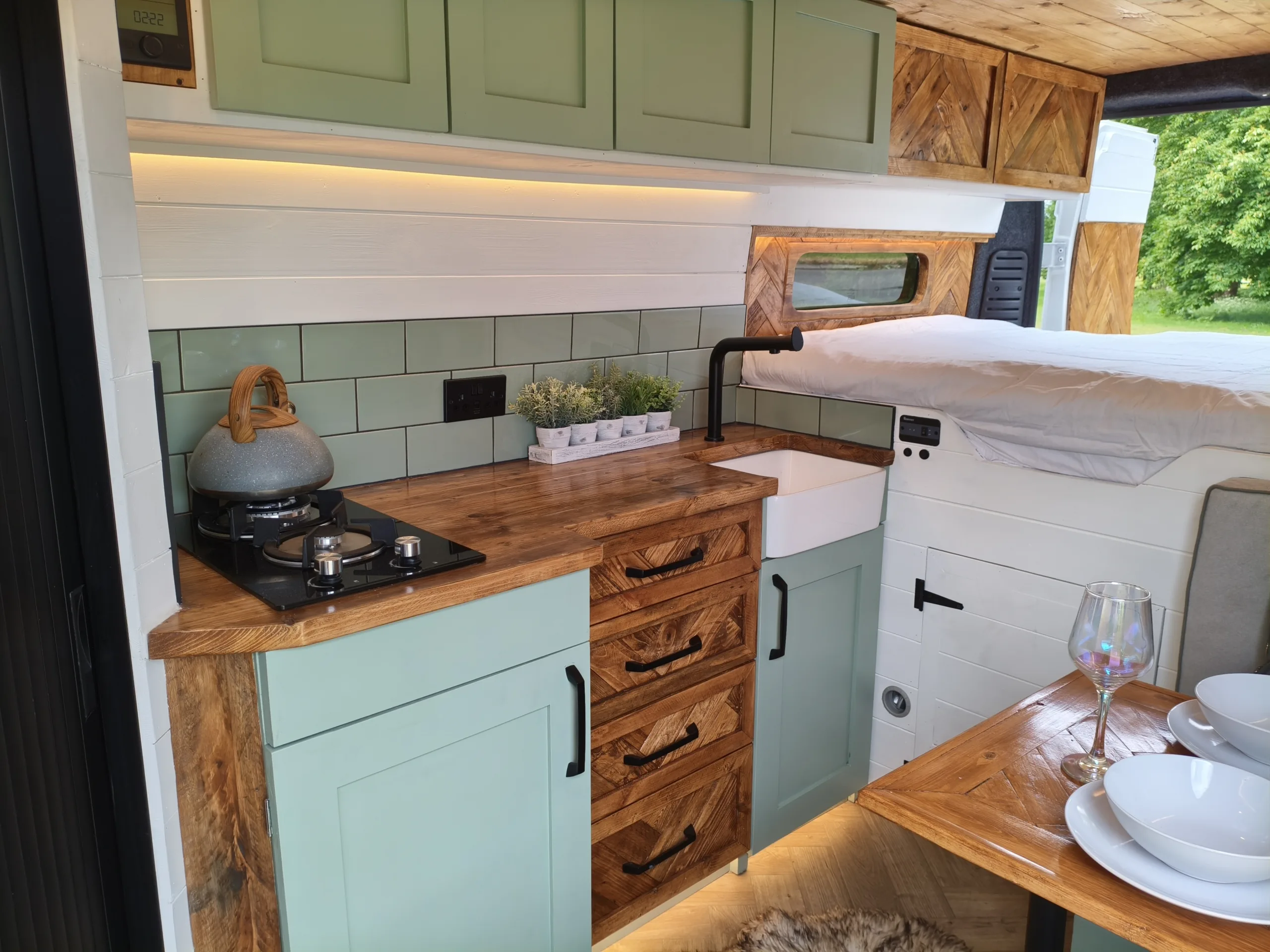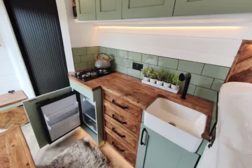 – Beautifully tiled kitchen complete with 12v compressor fridge (LG compressor – its the quietest and most efficient option), gas hobs and Belfast sink, cupboards providing plenty of space for cooking and washing up.