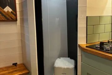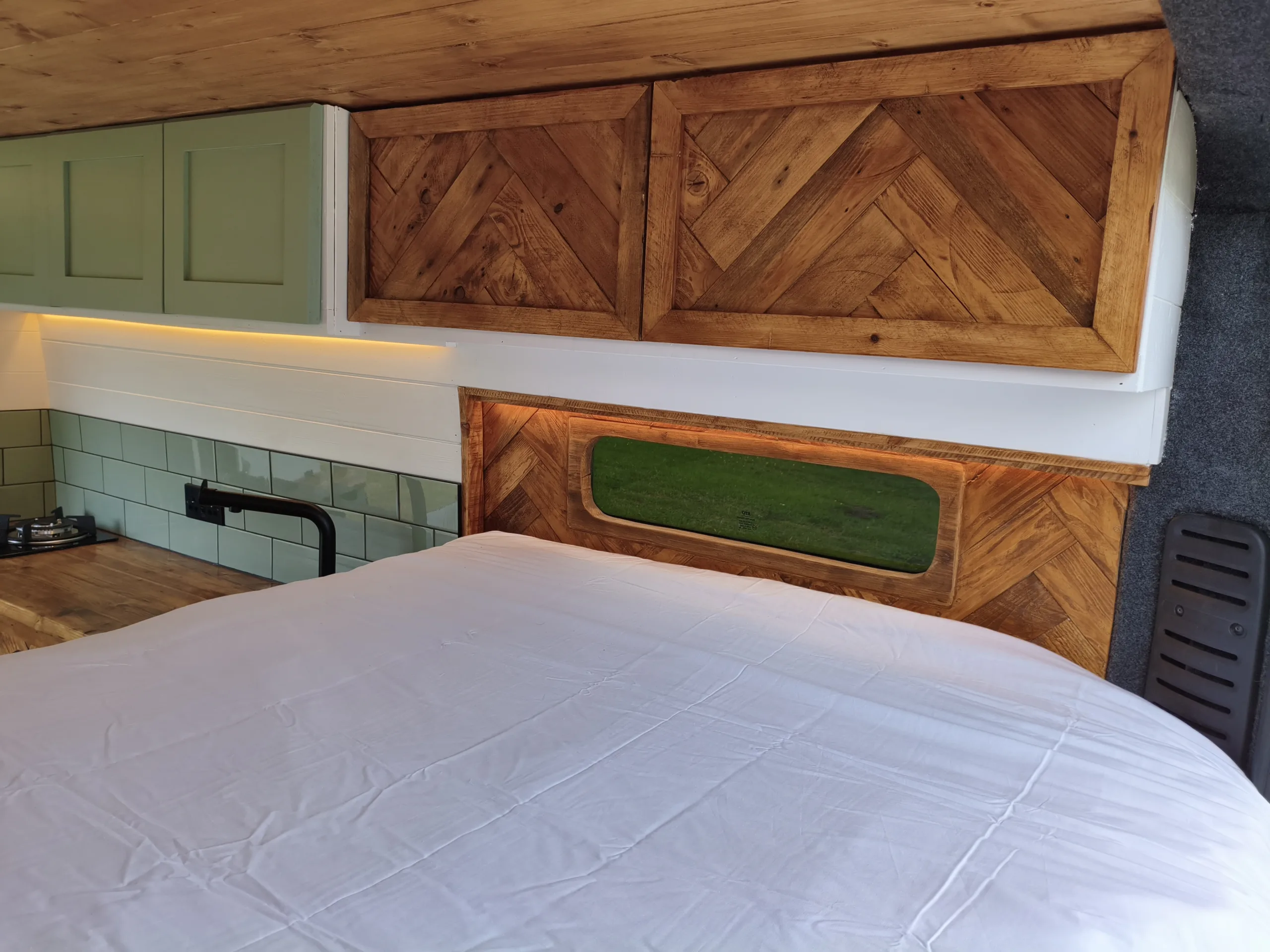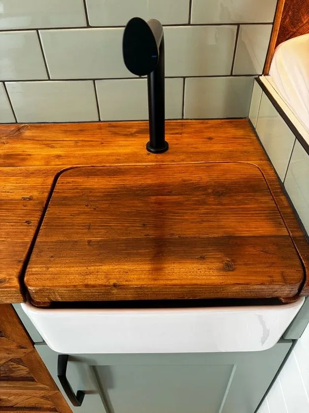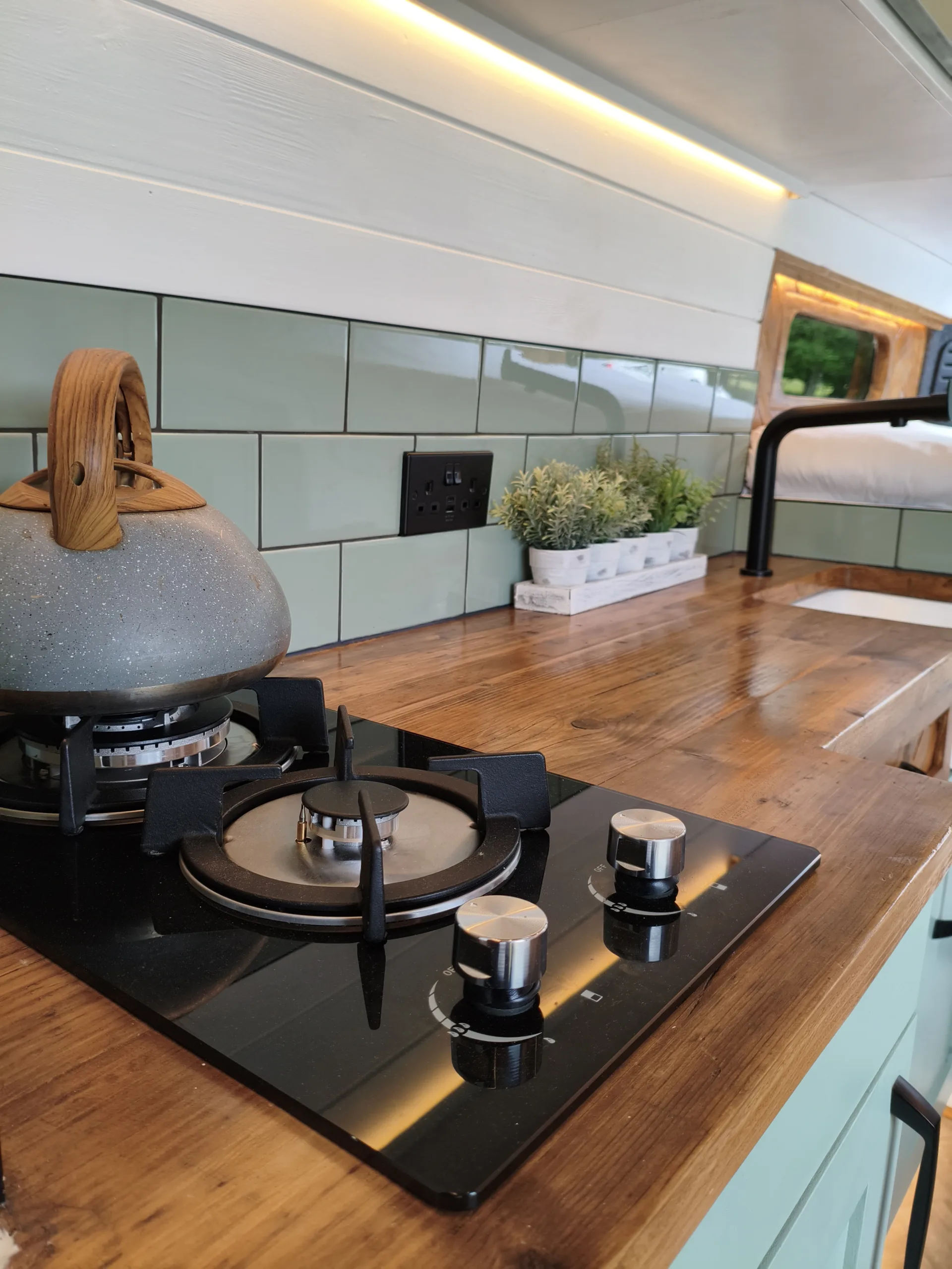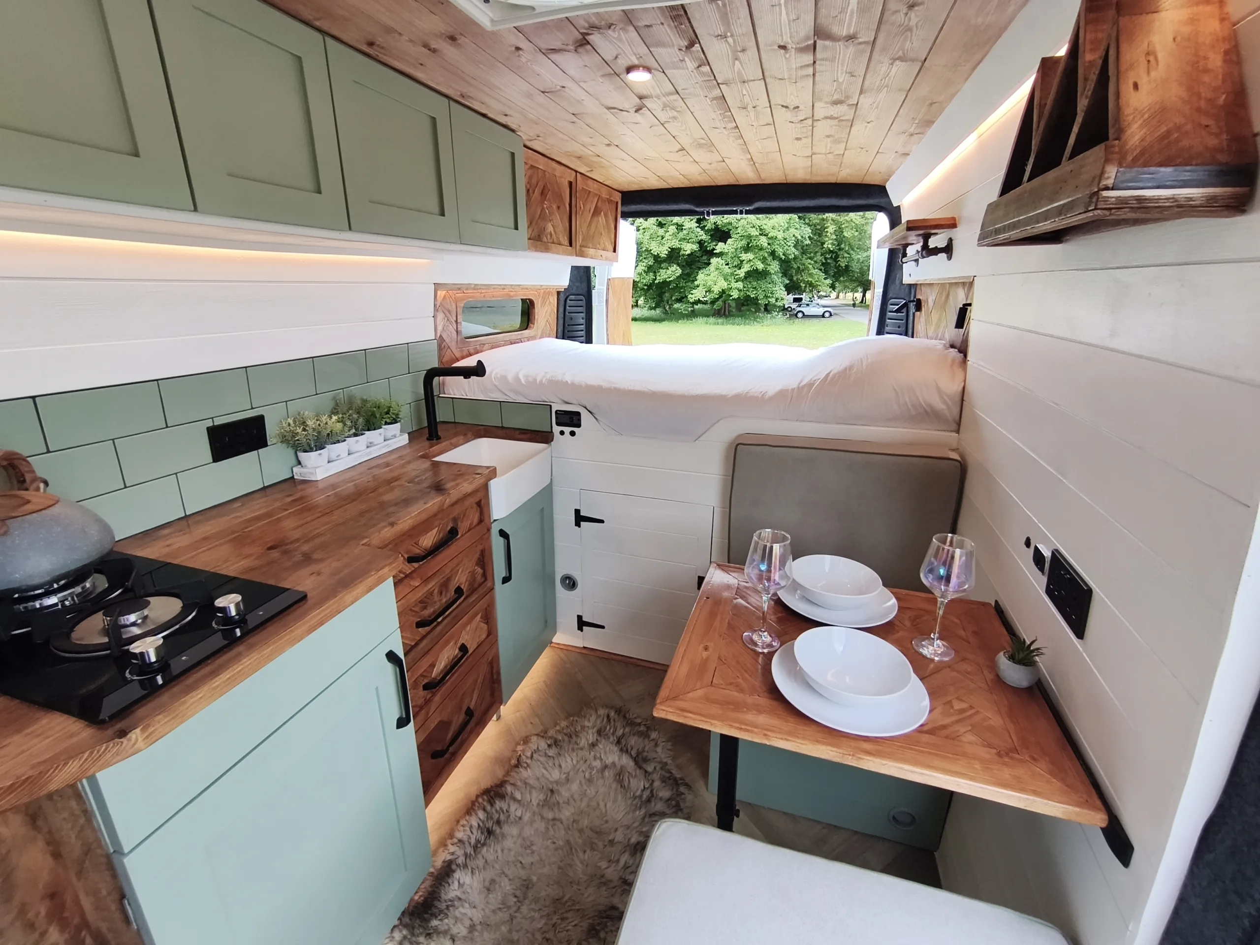 – Beautifully tiled kitchen complete with 12v compressor fridge (LG compressor – its the quietest and most efficient option), gas hobs and Belfast sink, cupboards providing plenty of space for cooking and washing up.