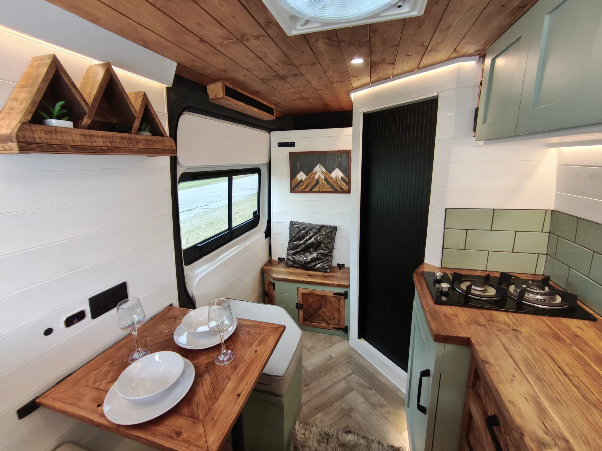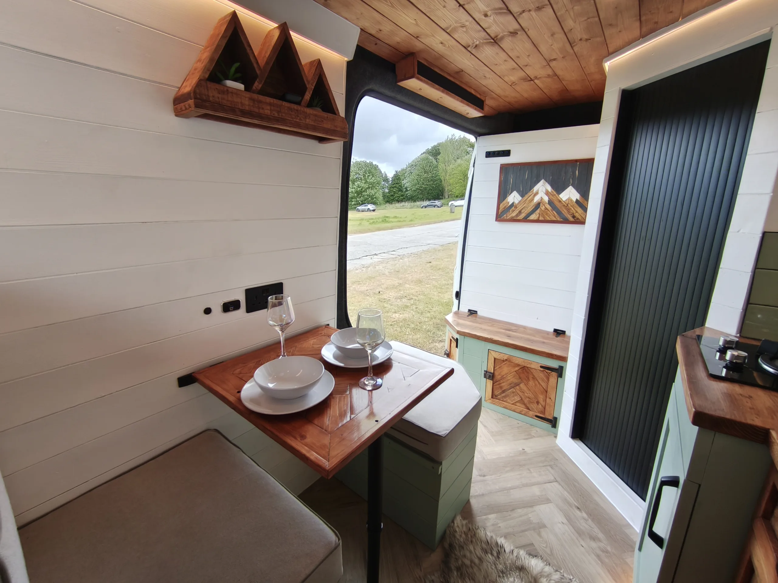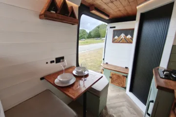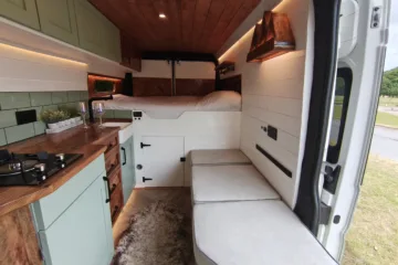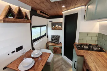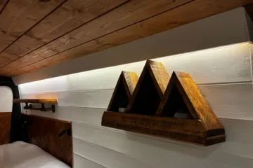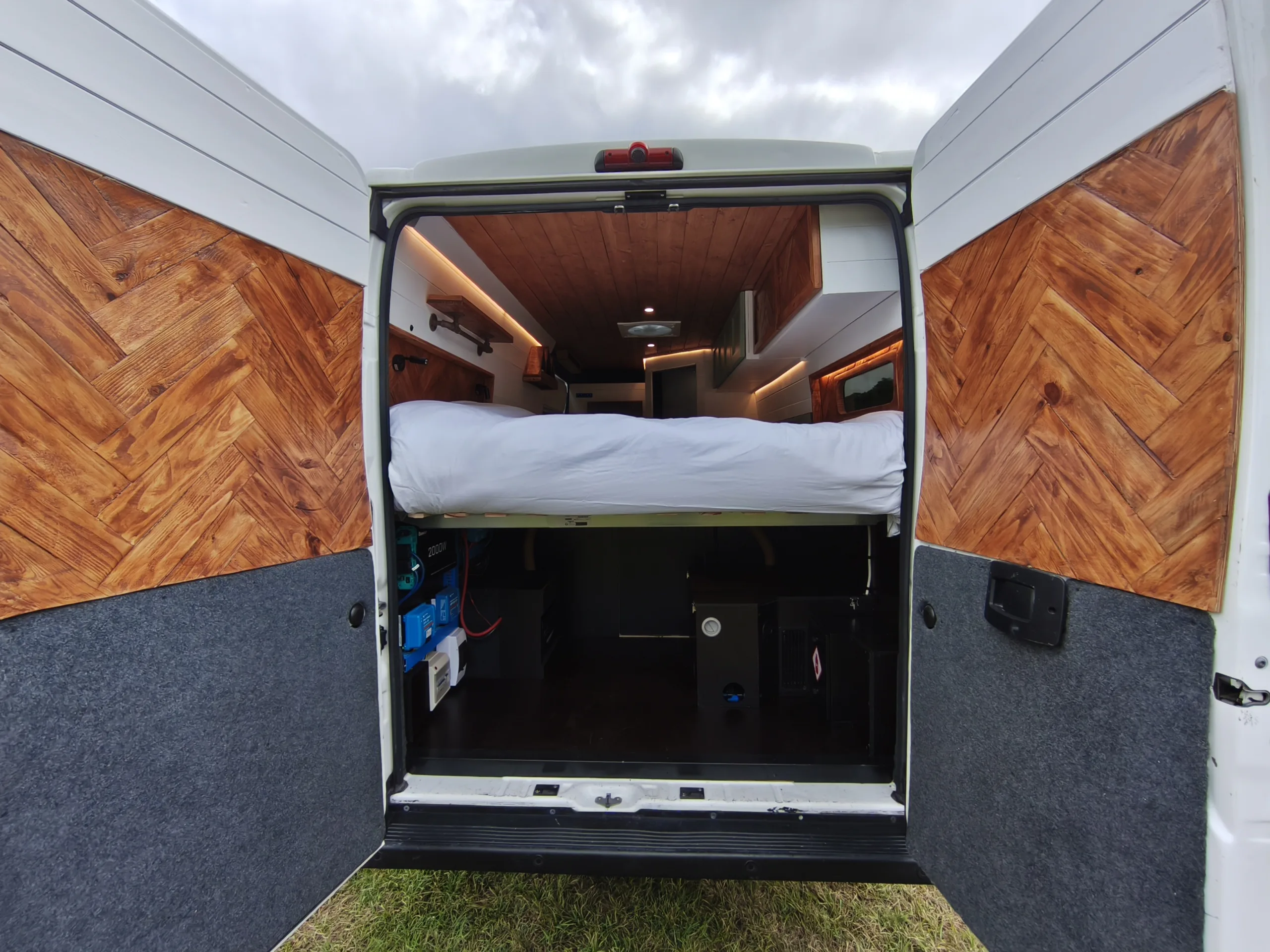 The the wooden panelling and upholstered sofa cushions make this van feel really cosy. It’s built with off grid in mind with a huge 300ah Lithium battery, large solar panels, Victron electrical system and Renogy inverter, all professionally installed, configured and tested. Light weight! Only 2,165kg.