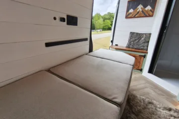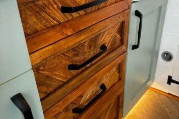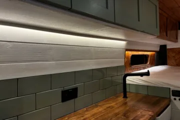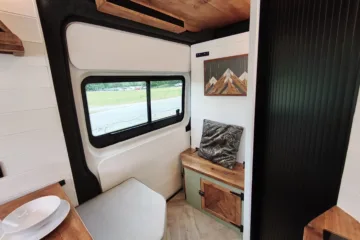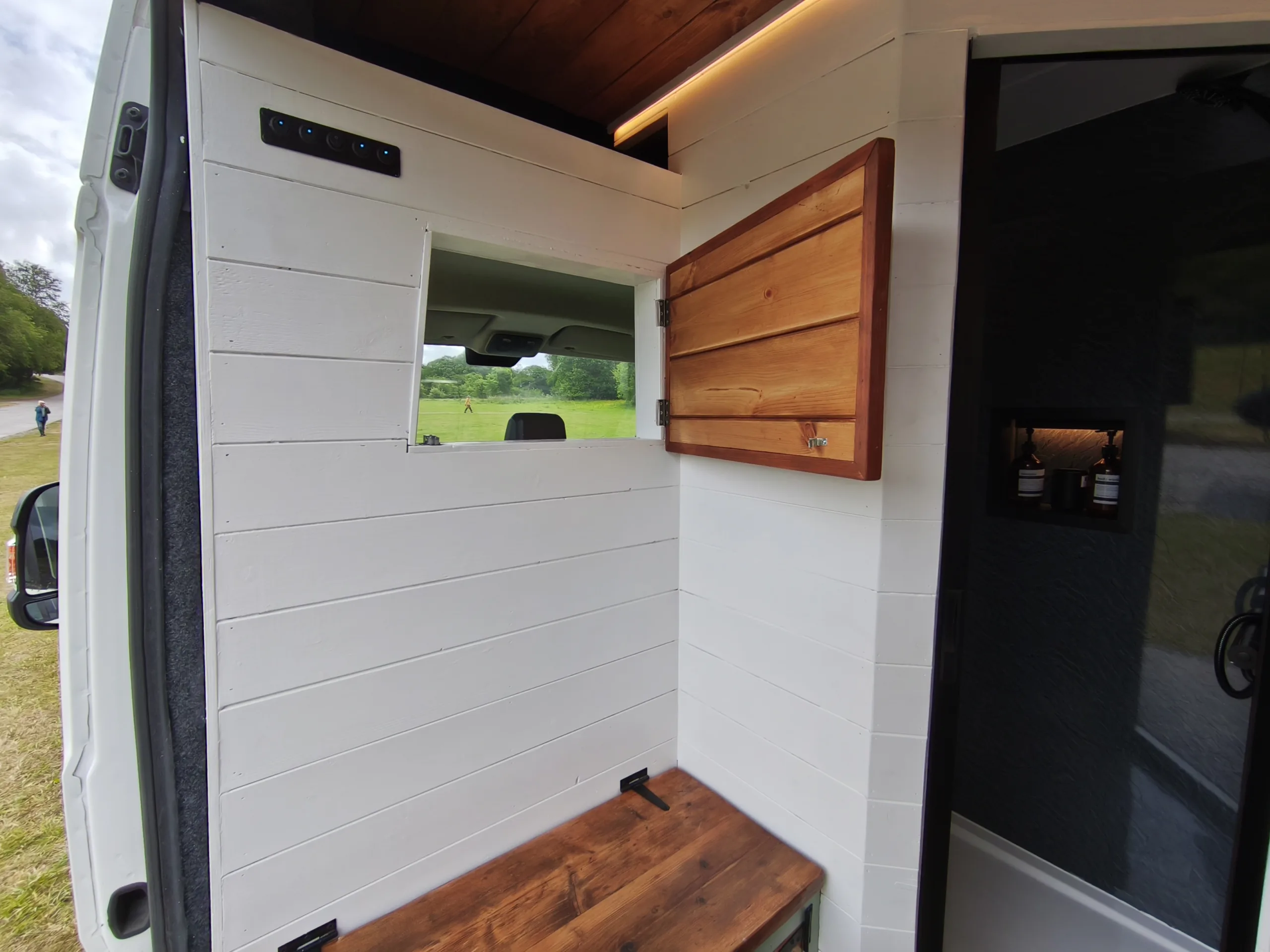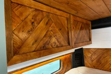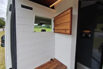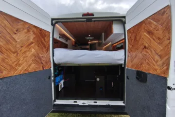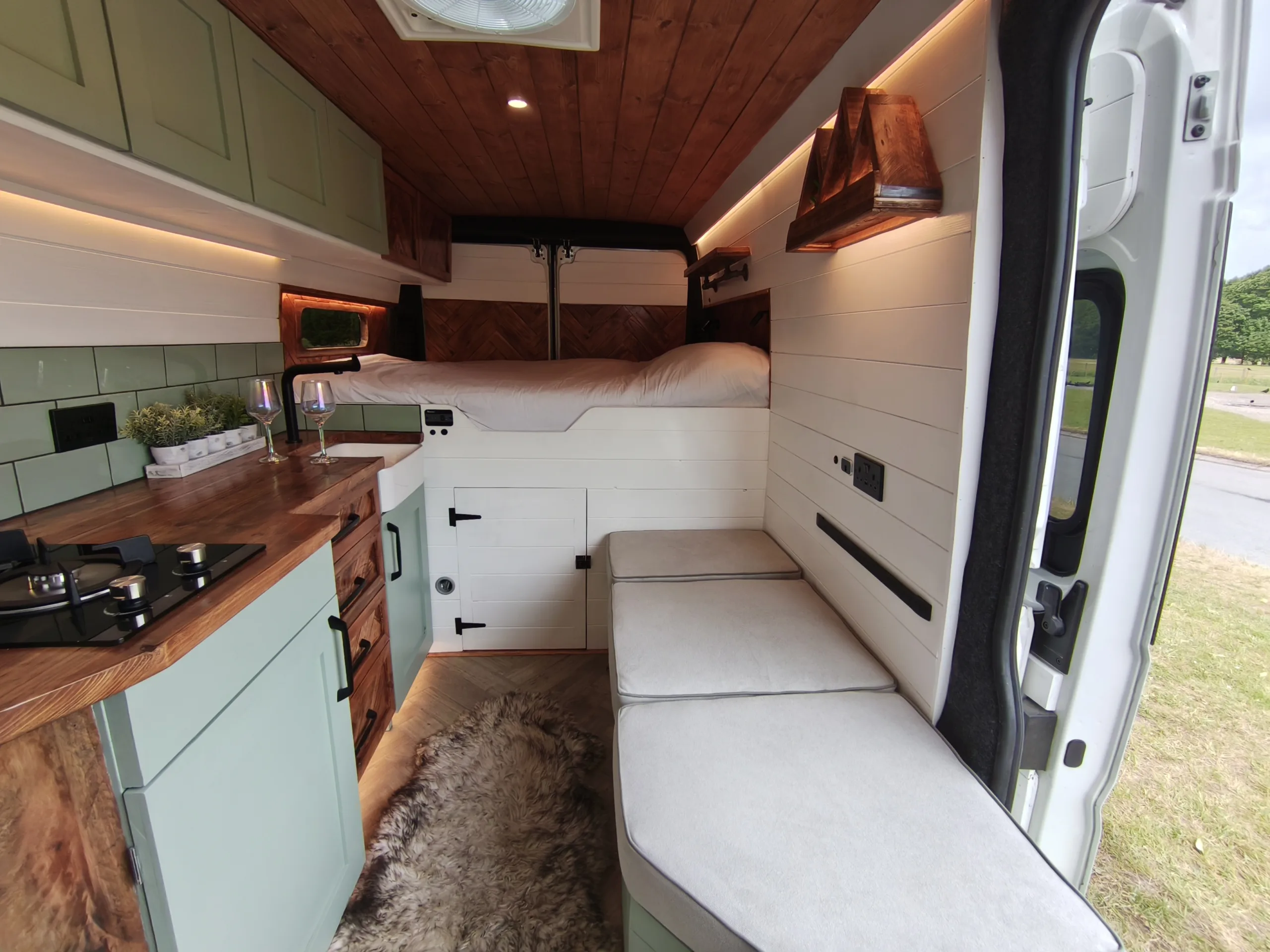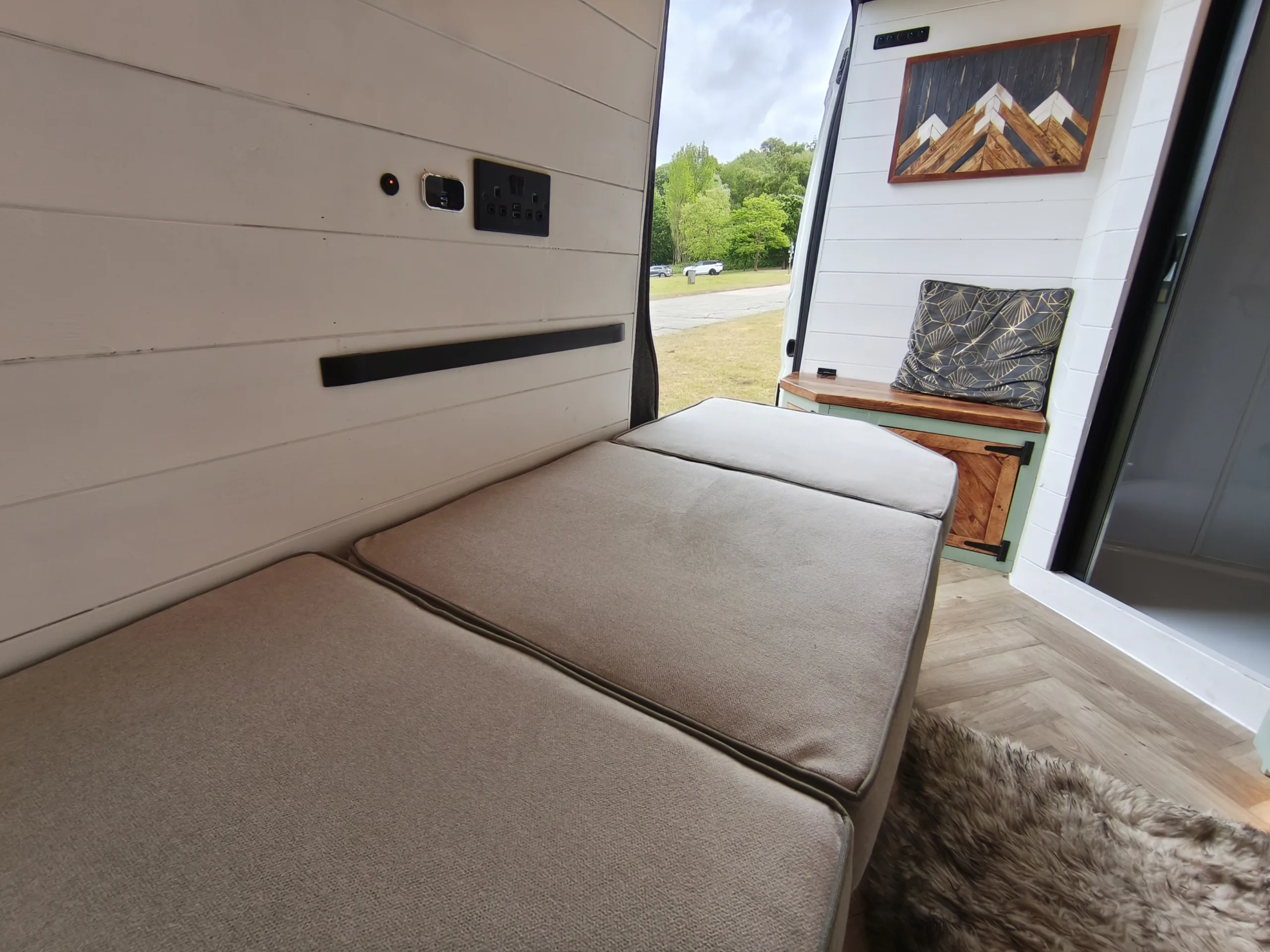 The the wooden panelling and upholstered sofa cushions make this van feel really cosy. It’s built with off grid in mind with a huge 300ah Lithium battery, large solar panels, Victron electrical system and Renogy inverter, all professionally installed, configured and tested. Light weight! Only 2,165kg.
