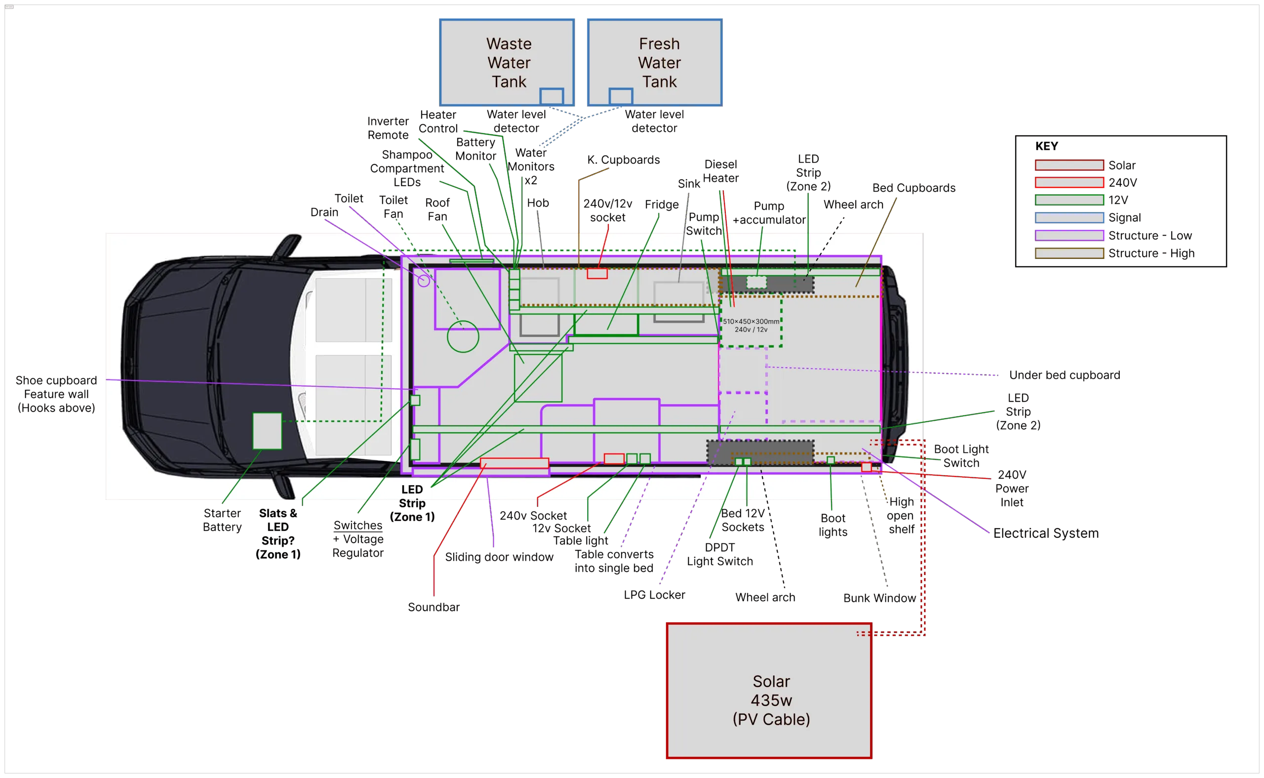 • High-output solar panel, 240V sockets, shore power hookup & charging, and alternator charging while driving