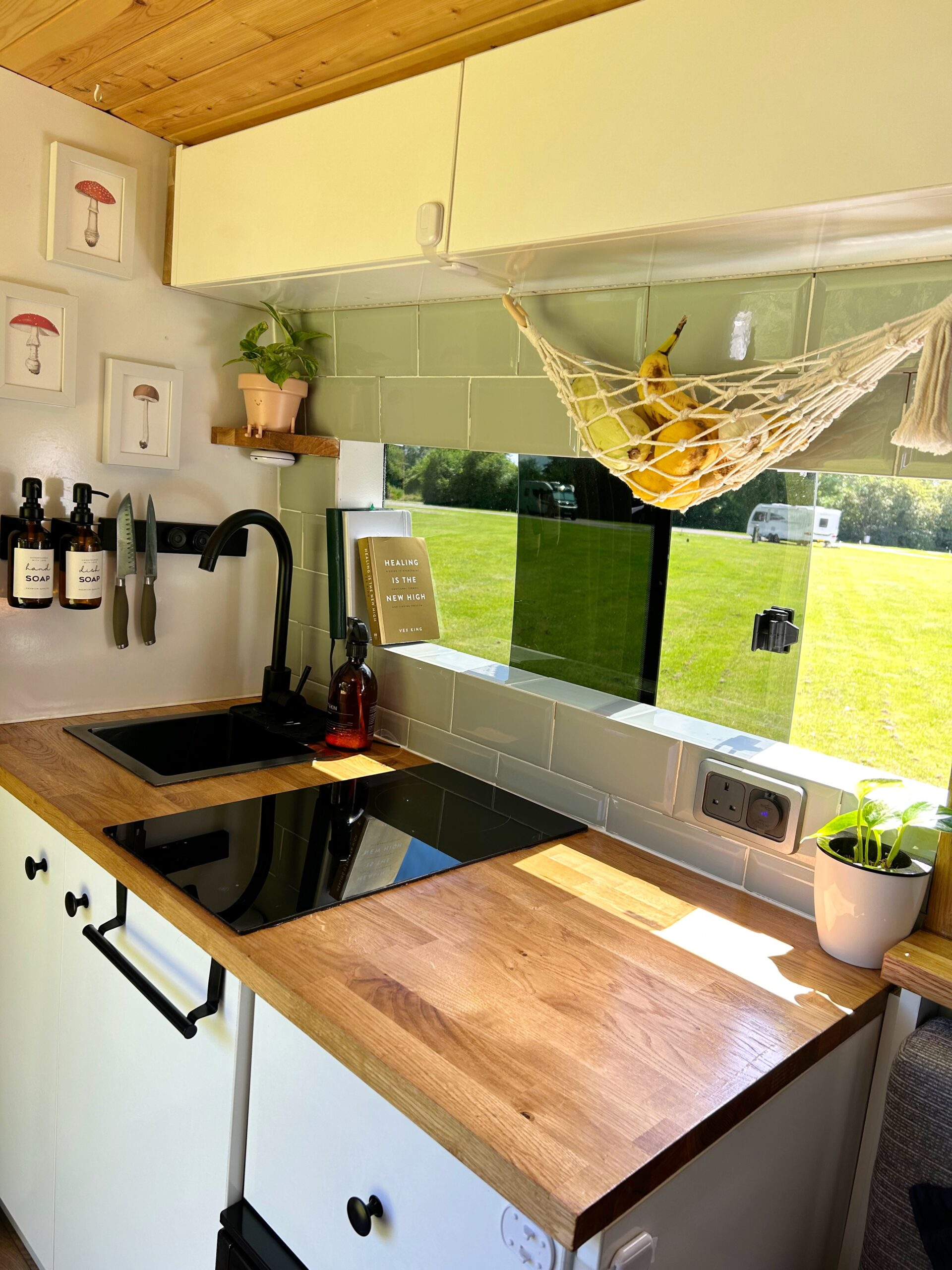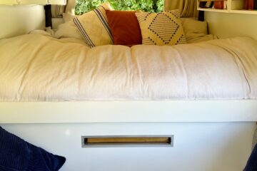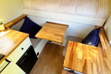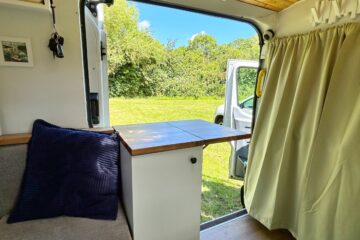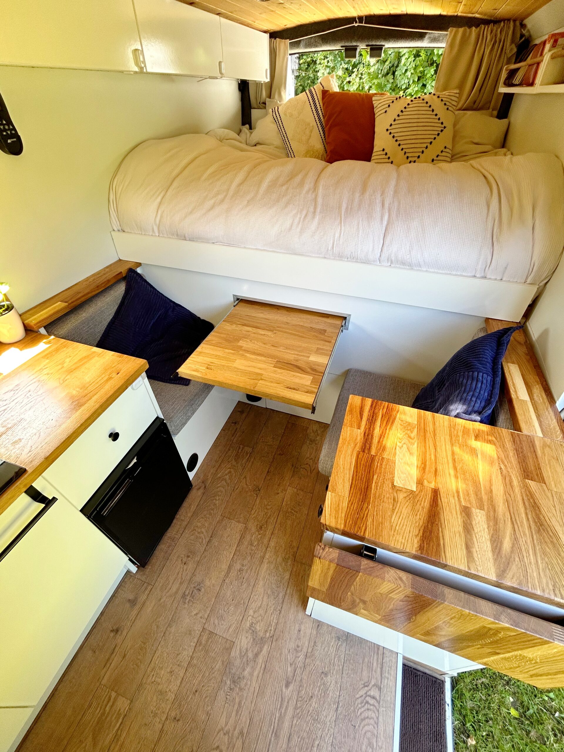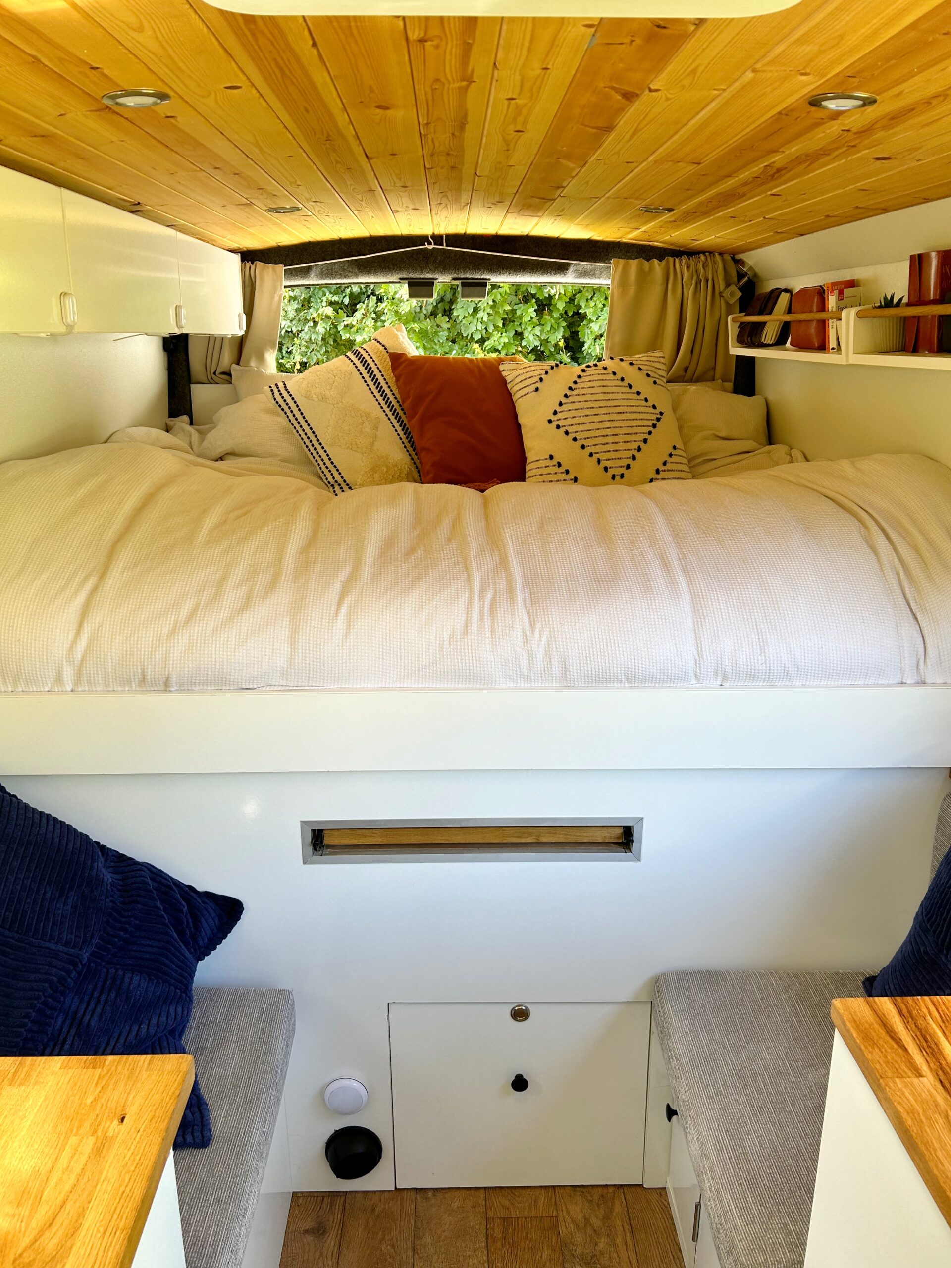 We bought the van fully converted to a high standard and have added some extra comforts along the way, including extra storage and a bed extension – when extended giving you a king size bed!