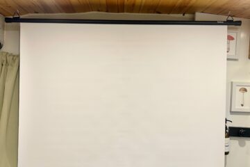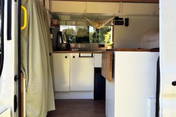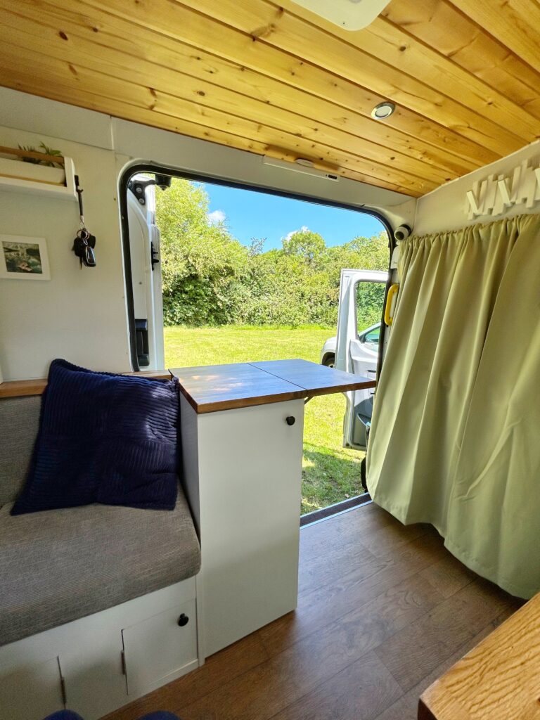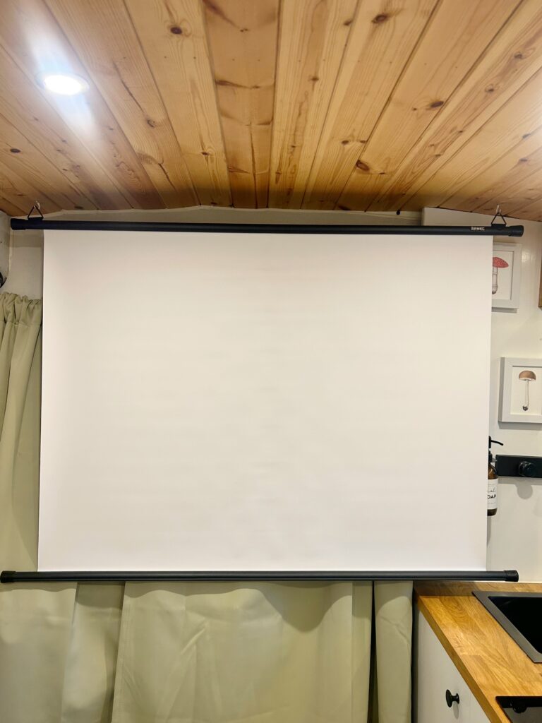 The van is beautifully decorated inside with good storage, led dimmable lighting, and a projector screen that cleverly stores away – as we were living in it full time it really is set up for comfortable living.