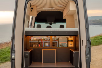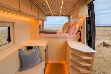 We had the van converted by the fantastic JMH Workshop over six months. Inspired by Millook beach near our home in North Cornwall, the interior reflects the calm, natural palette of that wild and peaceful stretch of coastline – soft birch finishes, muted tones, natural materials, and warm lighting.