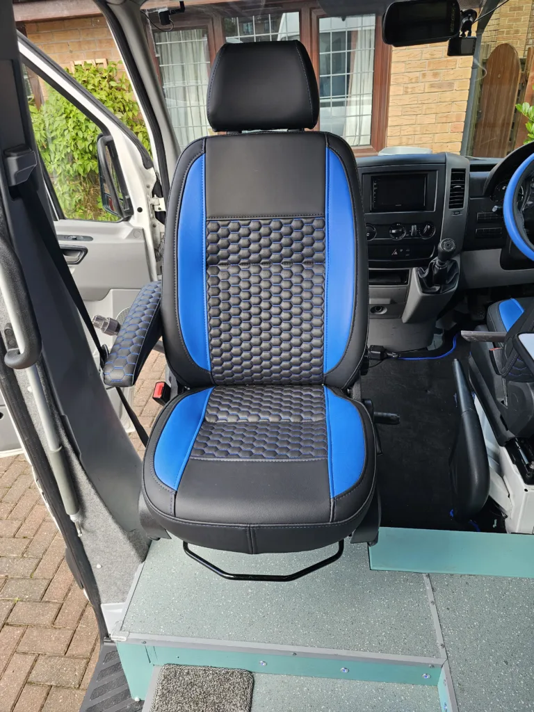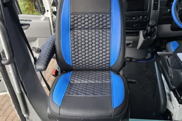 Both front captain seats are swivel and professionally upholstered to match double bench seat in the seating area.