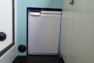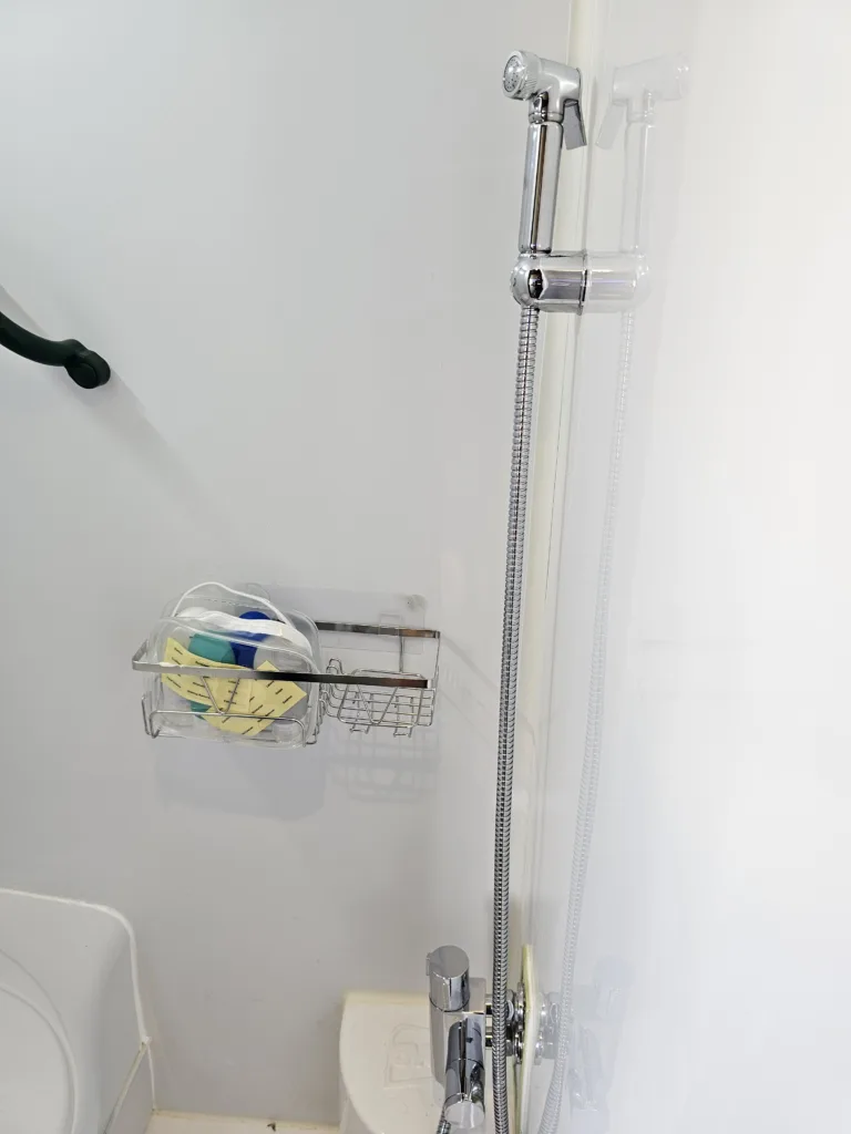 Full hot water to full size shower and kitchen mixer tap. Bobil hot water heat exchange and 12v thermostat for hot water in 15-30 mins. No mains hook up required.