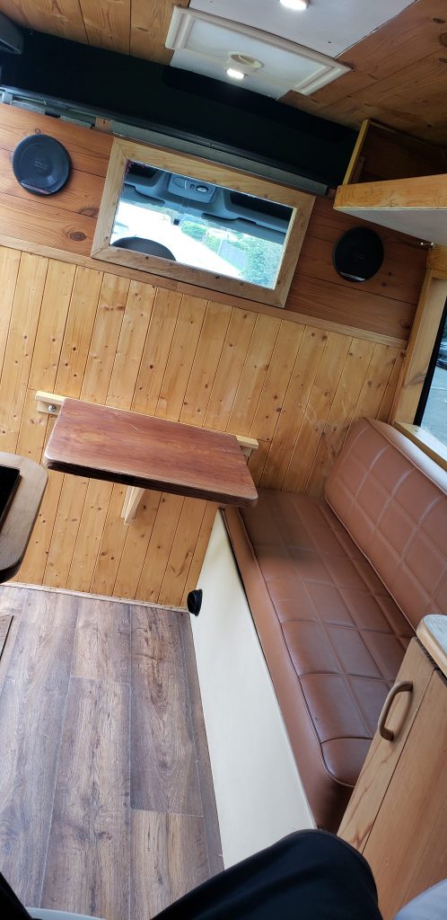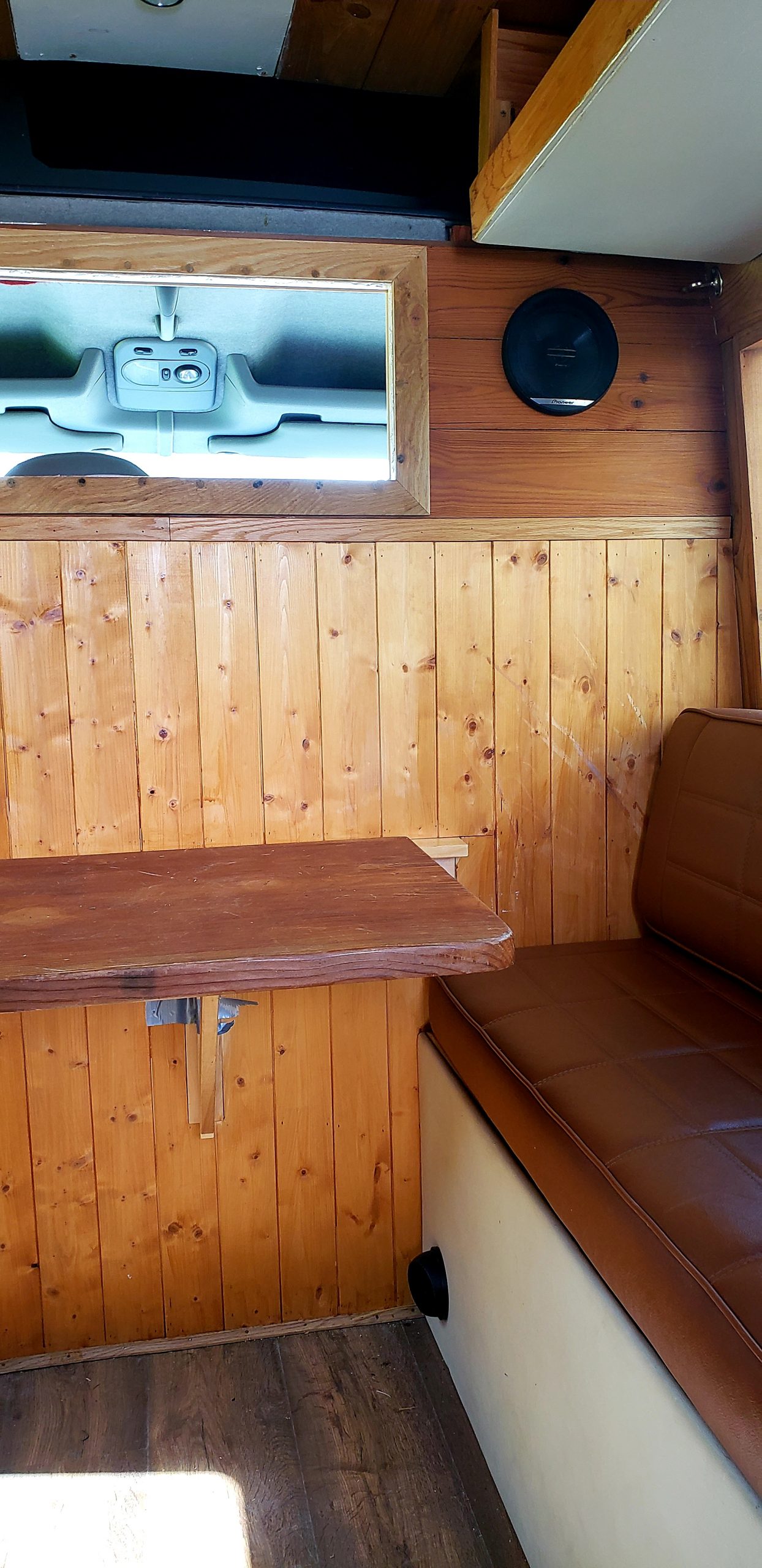 The van has overhead open cupboards, LED lights and a water pump. It is a basic conversion and is warm in the winter, and has kept us safe and dry during a period of full time living in it for 3 months of the winter of 2022.