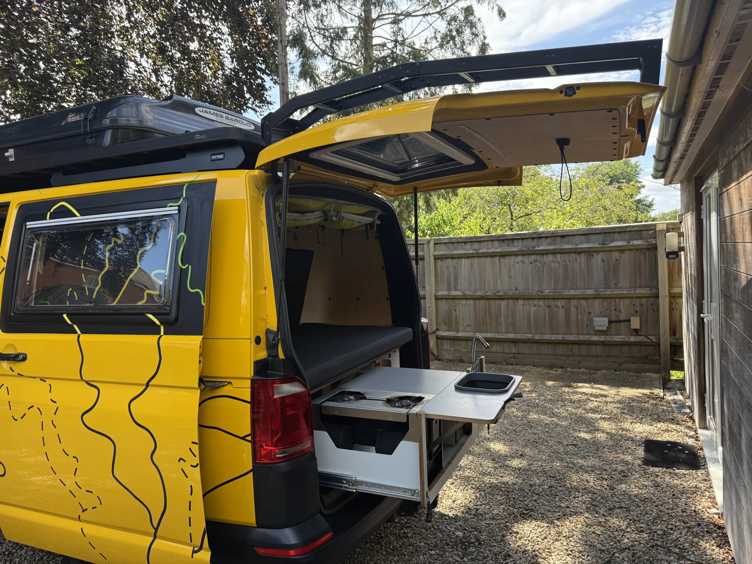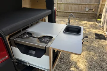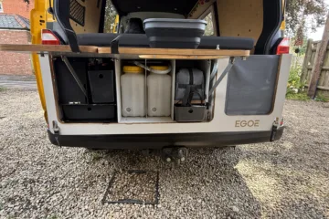 Our Dirty Weekender conversion is up for sale. After agreeing a custom build designed for total flexibility, we picked this up in in August 2023 and it is worked flawlessly through UK and European adventures. It’s designed for comfort in all temperatures and handling multi day journeys. We selected a rear pull-out kitchen from Egoe – because it maximizes interior space, giving a wider bed. Power comes from a lithium battery (charged while you drive or from mains), and there is are two propane canister-fueled stoves for cooking (note: one of the stoves has developed a fault and I am working on getting a warranty replacement!).
