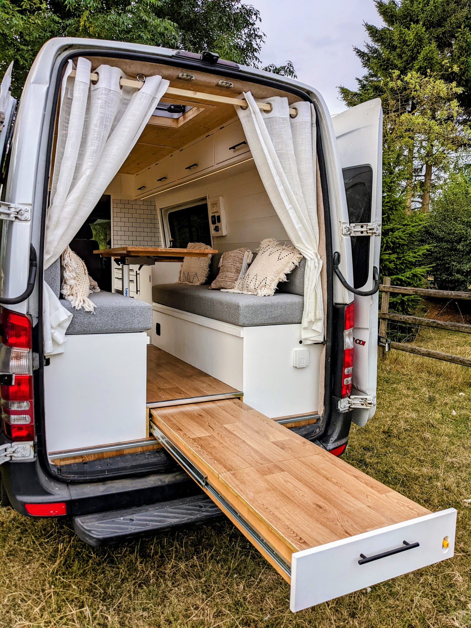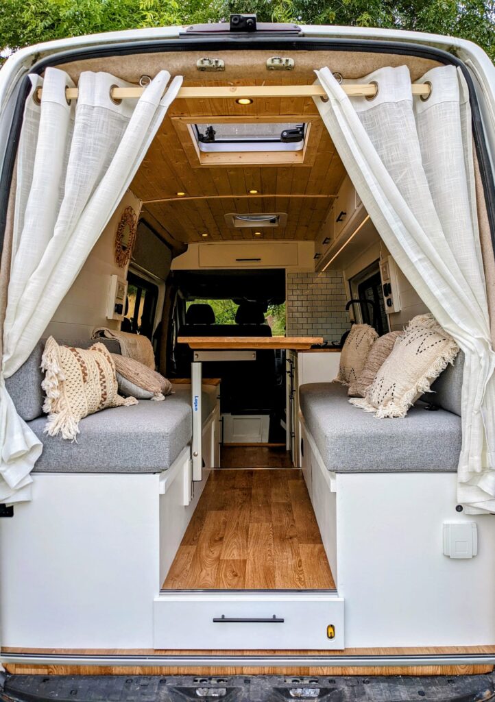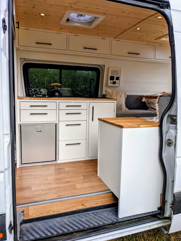 Last summer I paid for this MWB van to be converted to a bespoke design. It has a sofa set up that converts to a bed which is a queen size (I’m 5ft 11 and can sleep width or length ways in it)