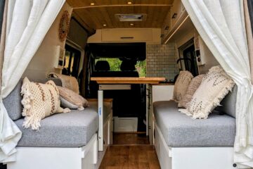 Overhead cupboards are spacious and have more than enough room for clothes, with extra storage under both sides of the sofas. It also has a large hidden drawer that pulls out for extra storage at the back of the van from in-between the floor of the sofas.