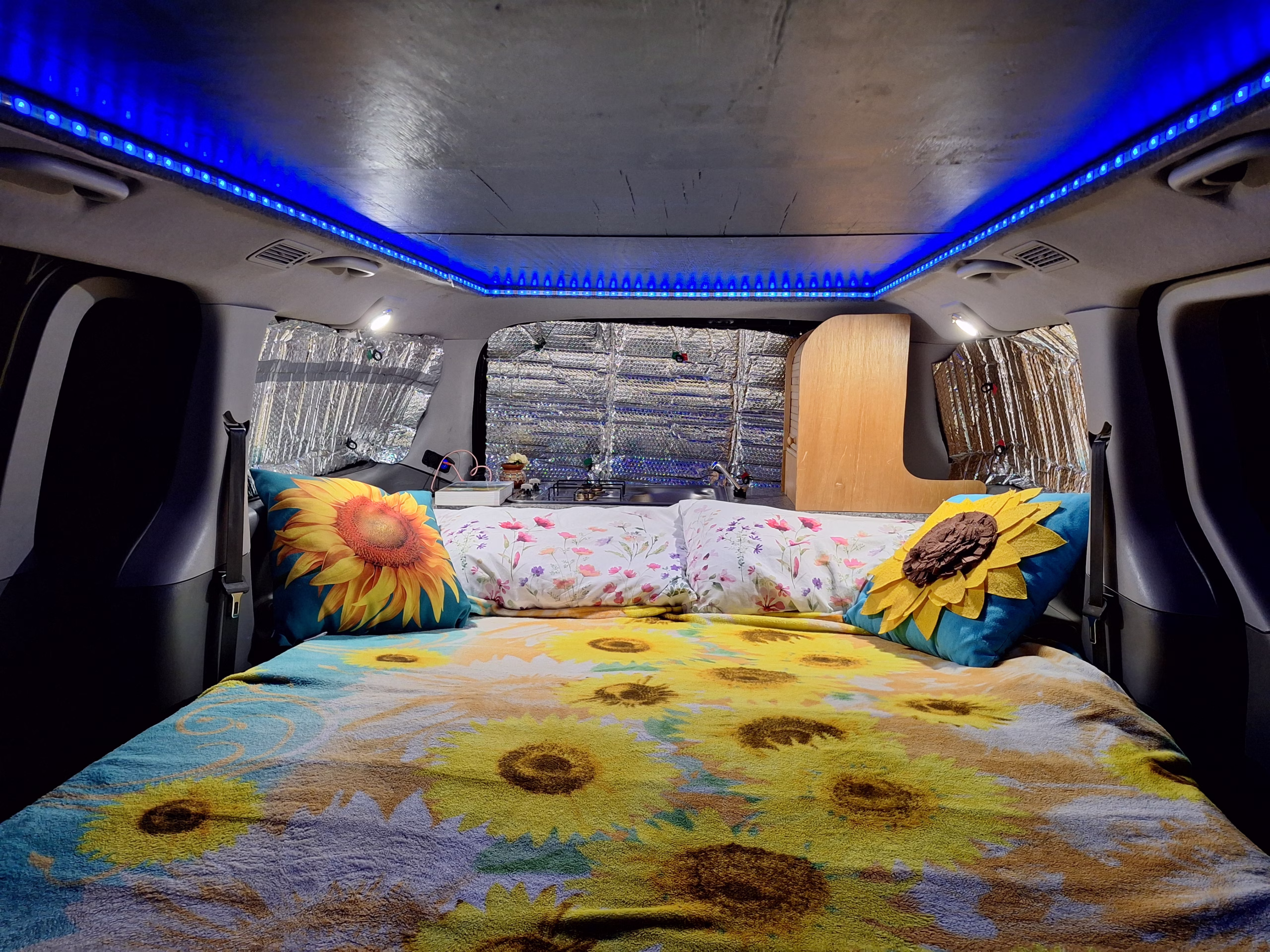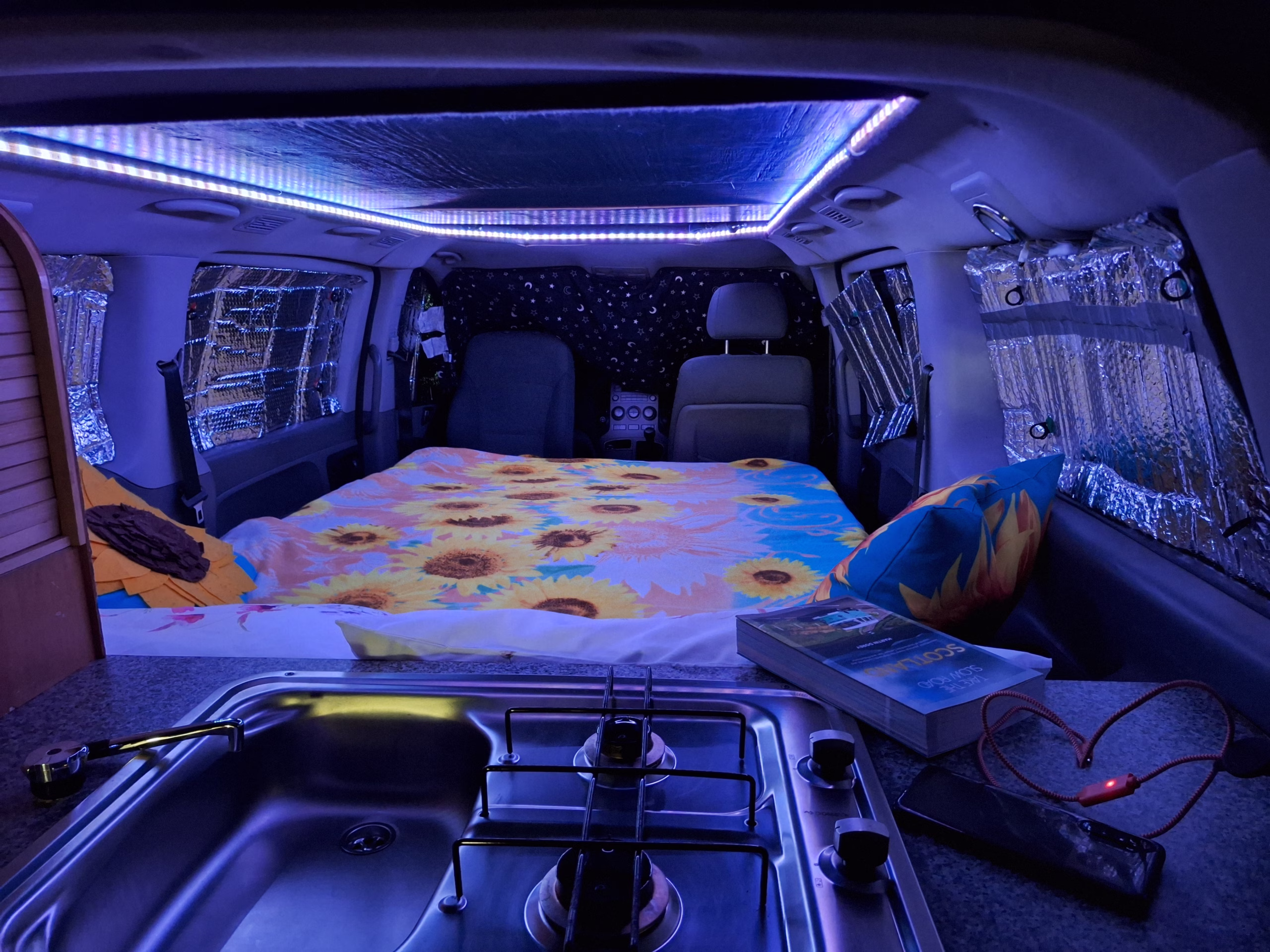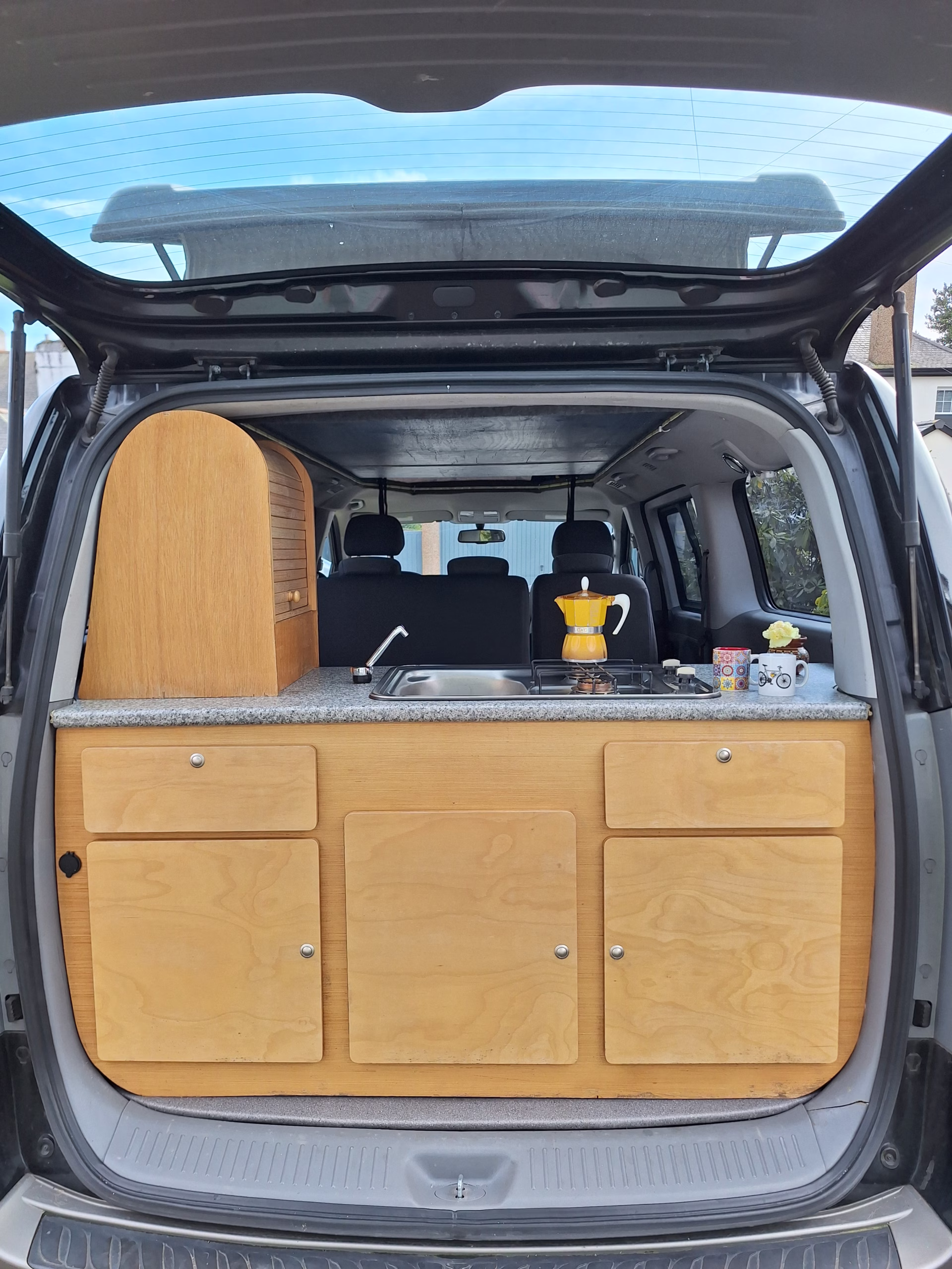 Fabulous bespoke rear kitchen with built in Dometik 2 burner gas hob and sink with 12v water tap. Underslung LPG tank for burner. 25 litre water tank in cupboard. Cook from inside or outside the van under the shelter of the tailgate. Plenty of storage for all cooking equipment and food.