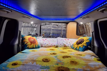 Split relay charger to 95Amp hour leisure battery (replaced 2024) which runs multi-coloured LED lights, reading spotlights, water pump, along with 12v sockets and USB in rear of van.