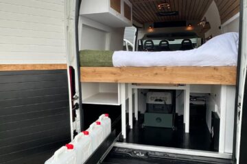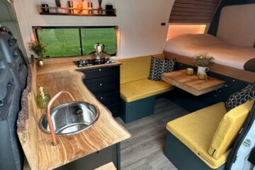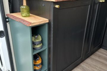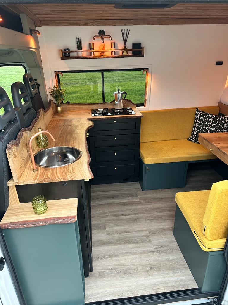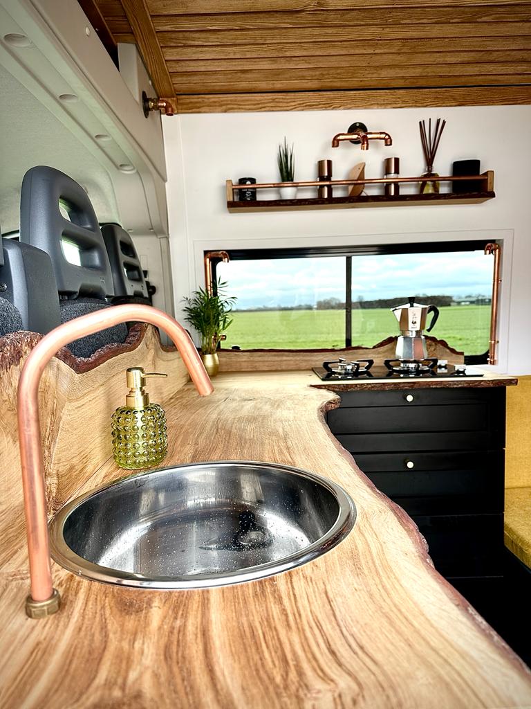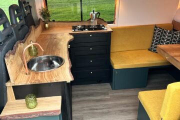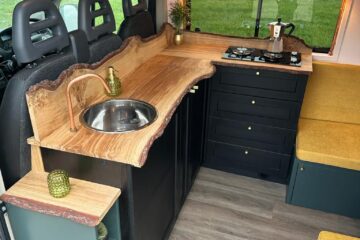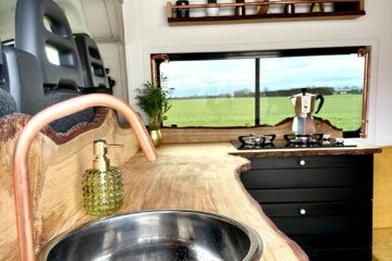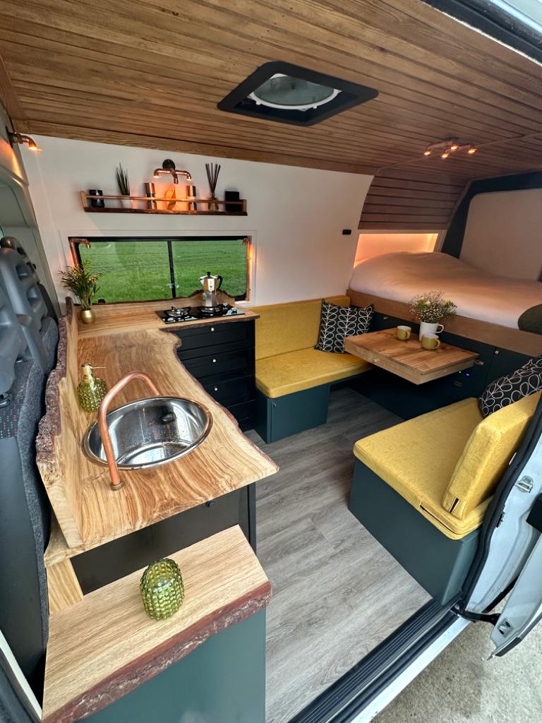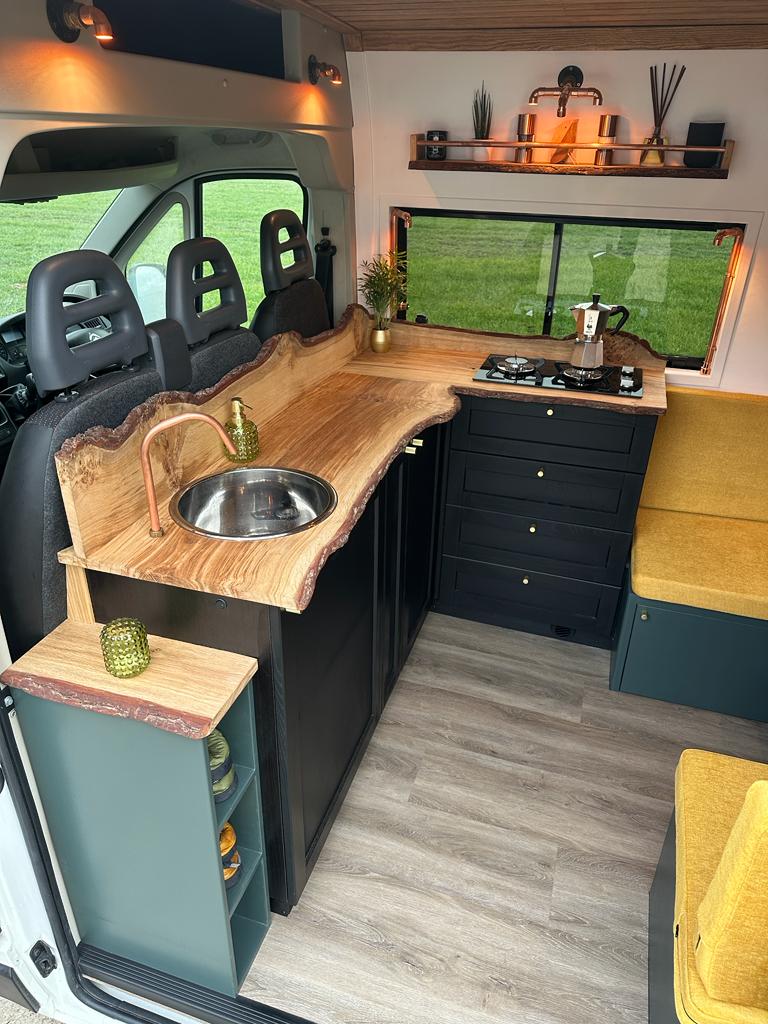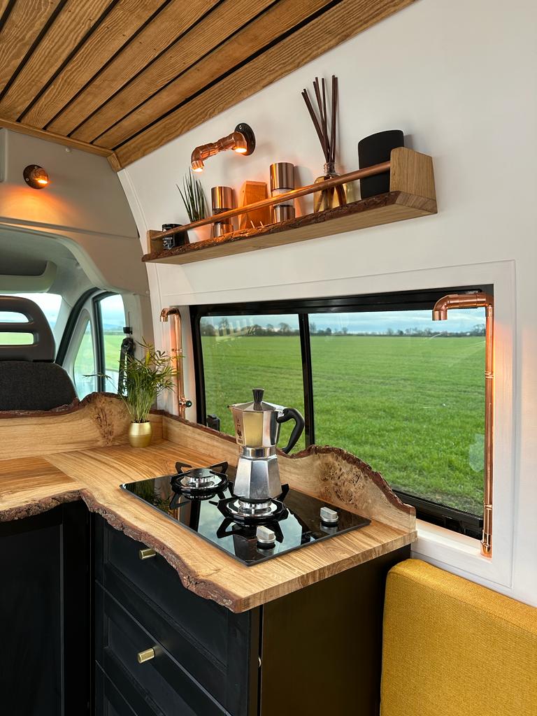 200 watts of solar power – 100ah lithium battery , mains hook up , Ventilation – Maxxair deluxe fan at the front of the van- Kitchen