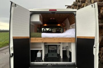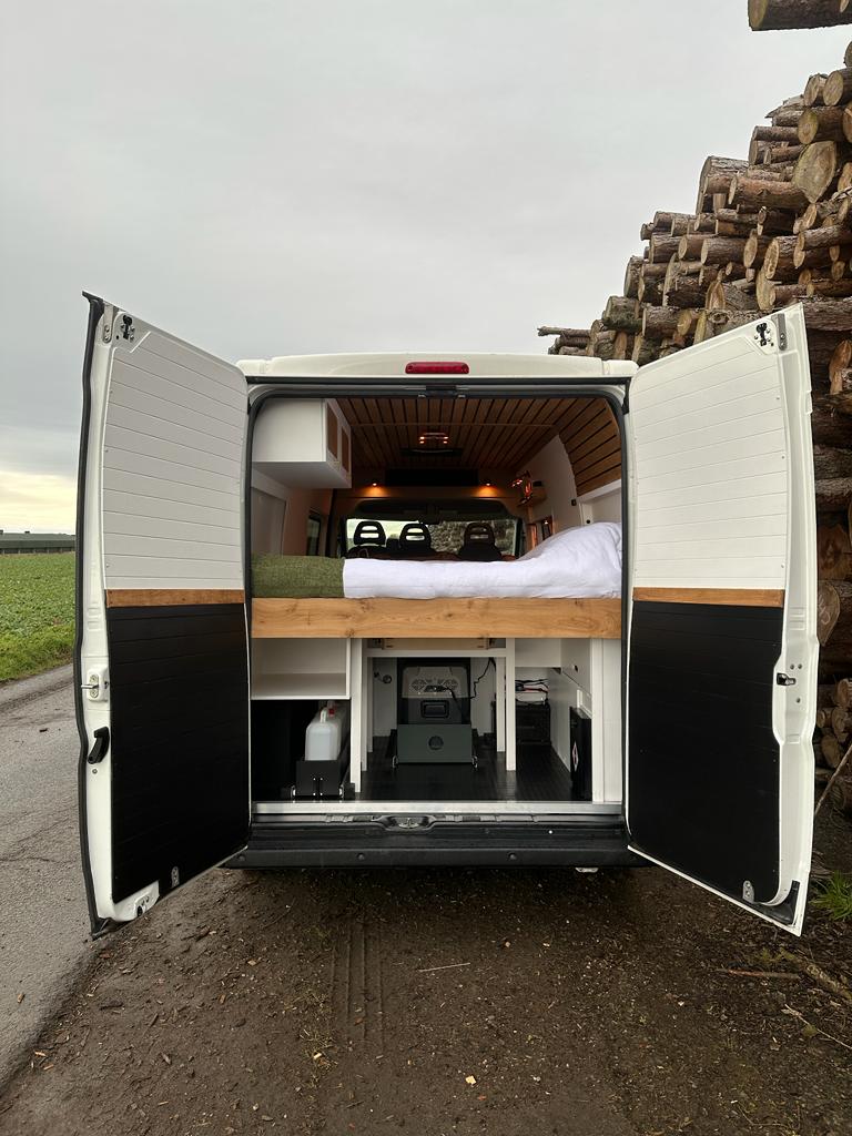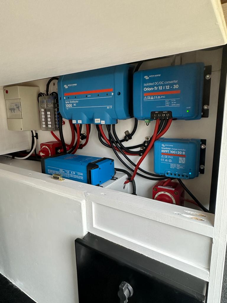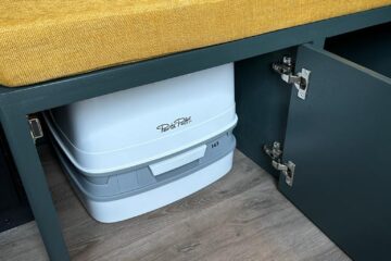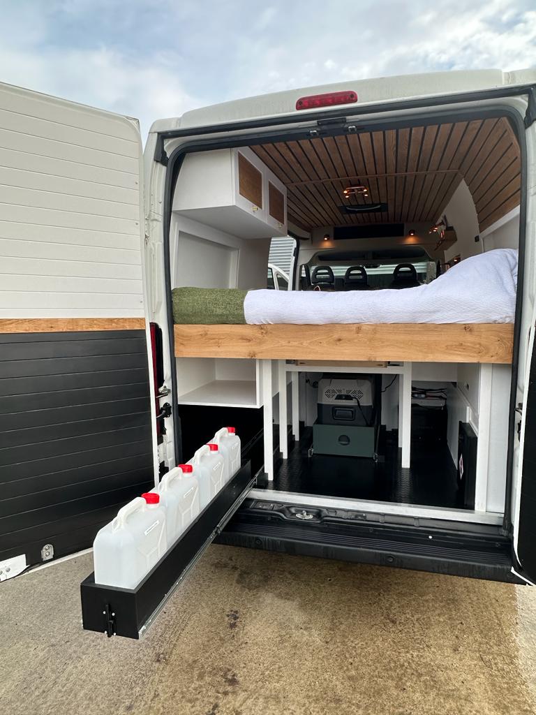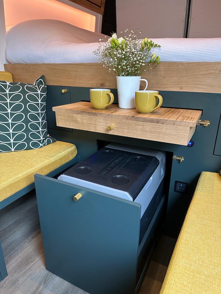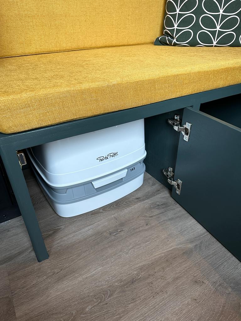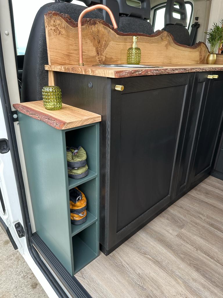 – Dometic 976 portable toilet , 40/45 litre compressor fridge on sliders, Live edge storage shelf , heating via Eberspacher diesel heater.