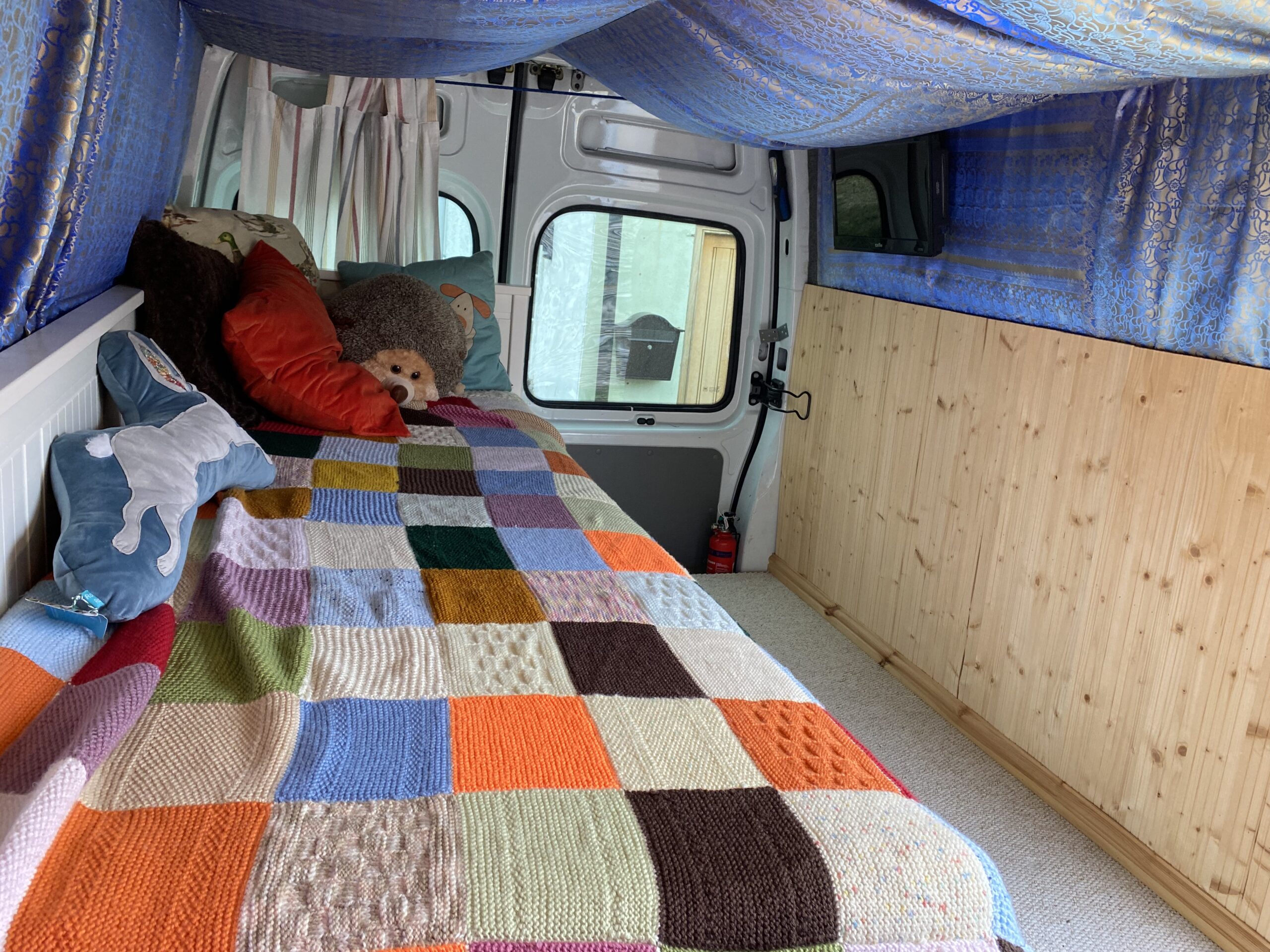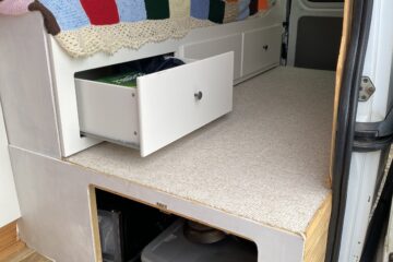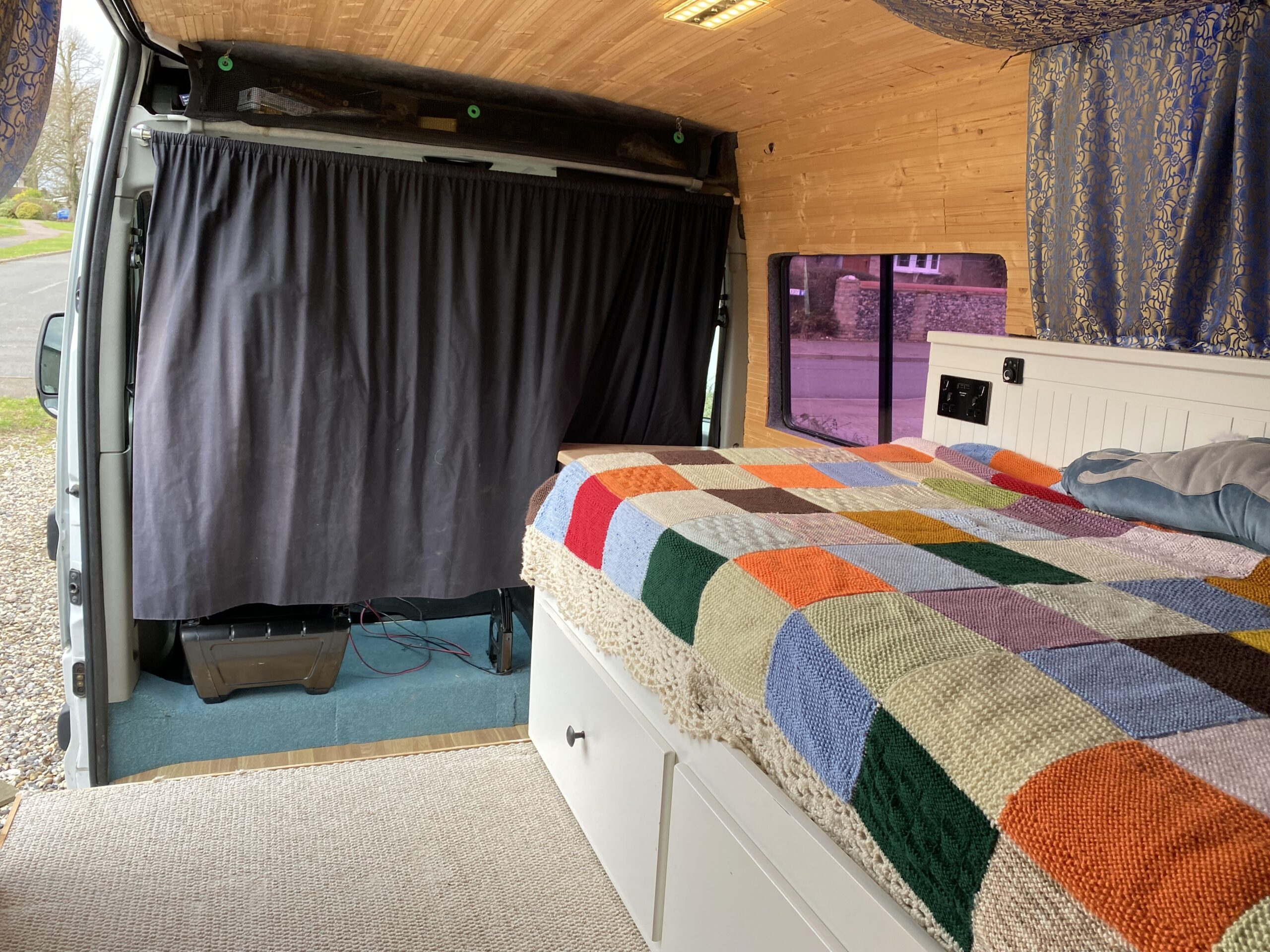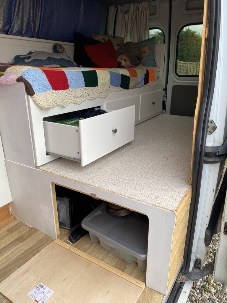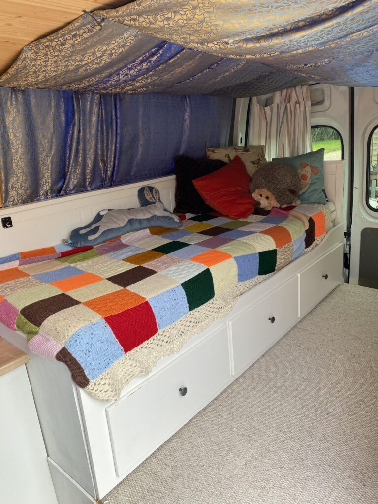 – IKEA Hemnes daybed fitted in back – pulls out to full width of van creating full sized double bed.