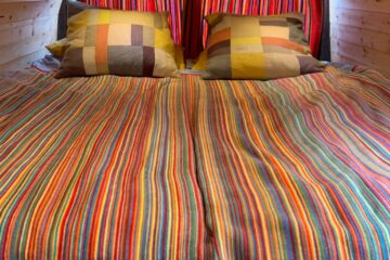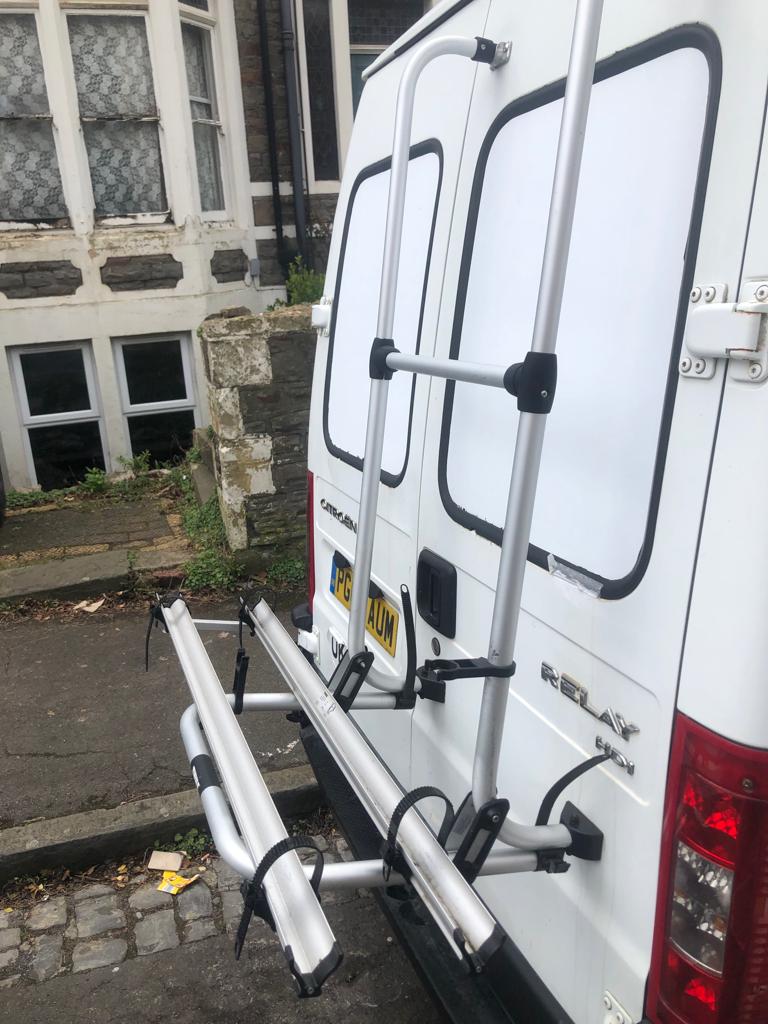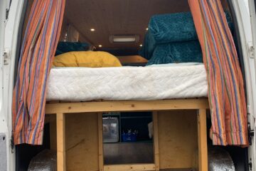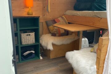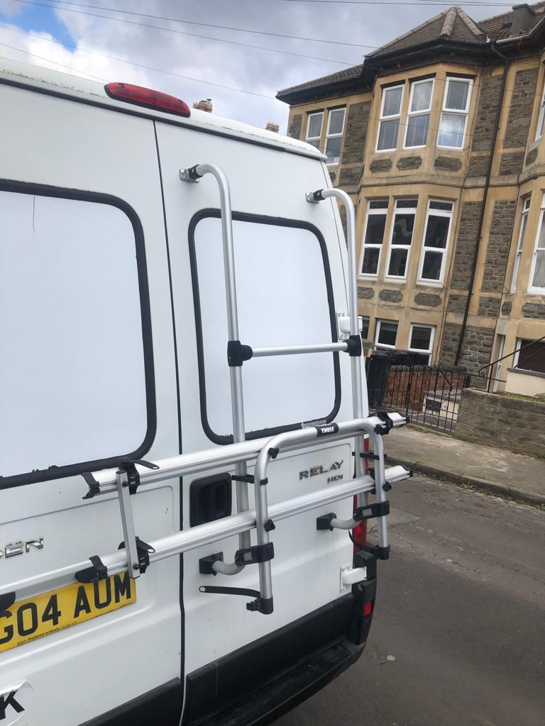 360W solar panel, split charge relay and inverter. 2 x gas hob, fridge. USB ports and 240V plugs. Have taken her off-grid to Spain for 5 weeks, and Germany for 3 weeks working remotely in the van, great closer to home at festivals and weekends away. Roof window with blind and insect net. Thule bike rack for 2 bikes. Very well insulated – have slept in minus temperatures and been more than comfortable.