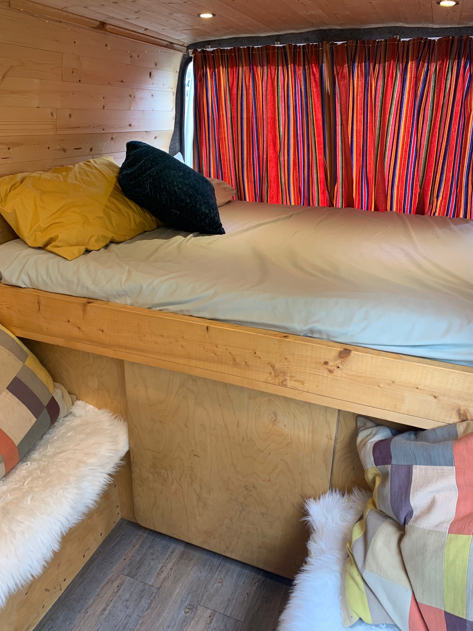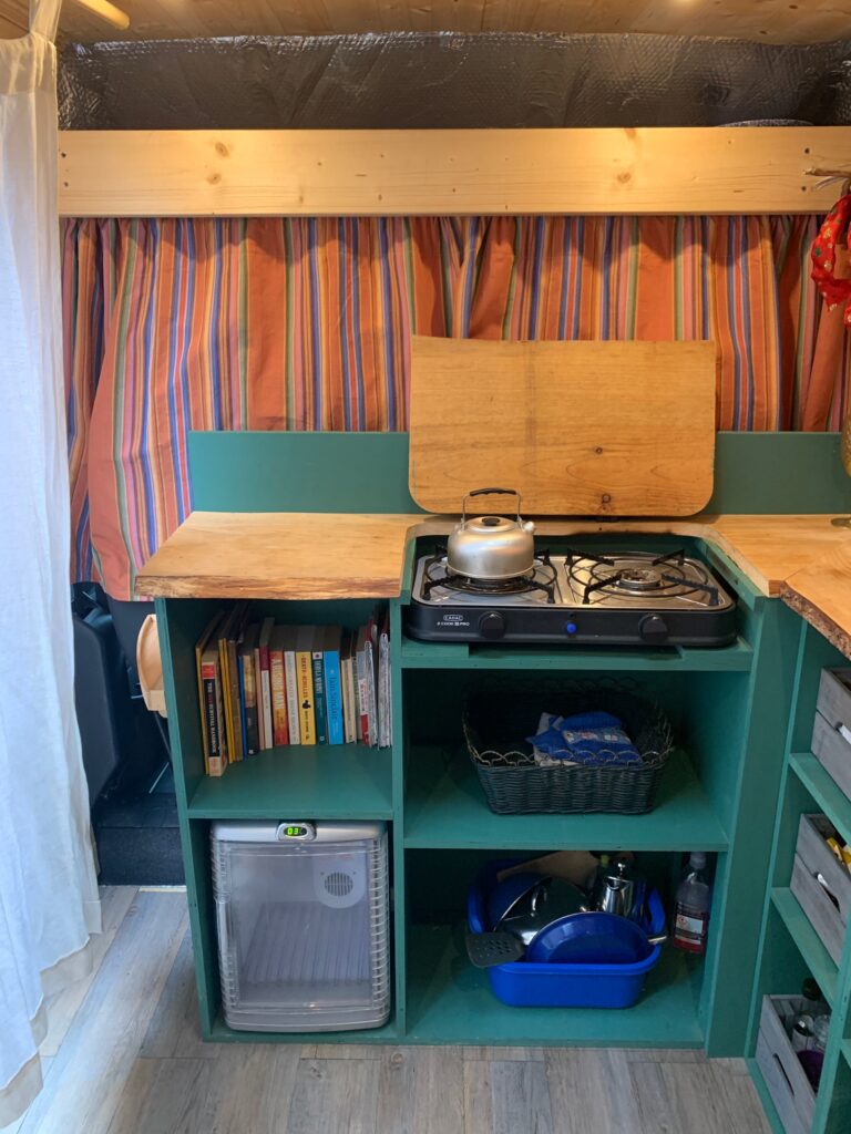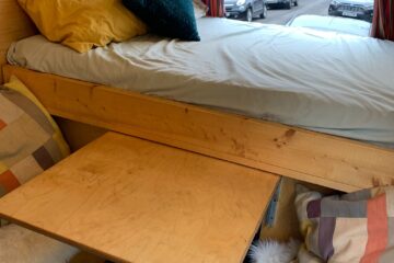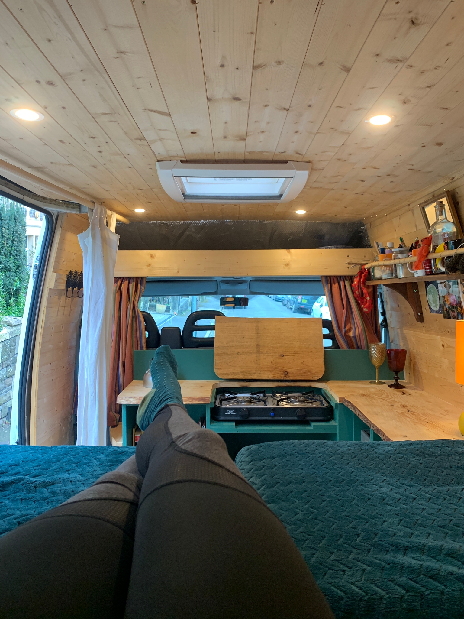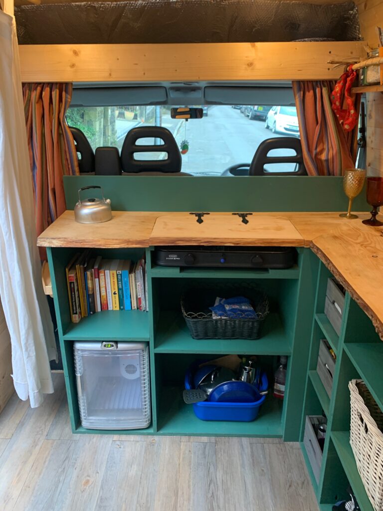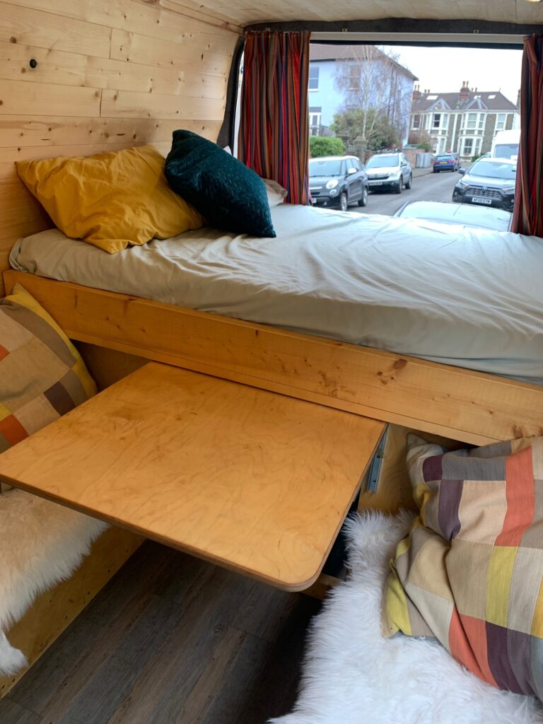 Mega comfy slide-out bed with 20cm memory foam mattress, better than the mattress in my house! Slide-out bed means you can sleep lengthways, we’re both tall-ish, so struggle to sleep sideways like so many conversions. L-shaped kitchen with loads of workspace, storage under the seats, and plenty of space under the bed. Fold out table gives access to the rear storage.