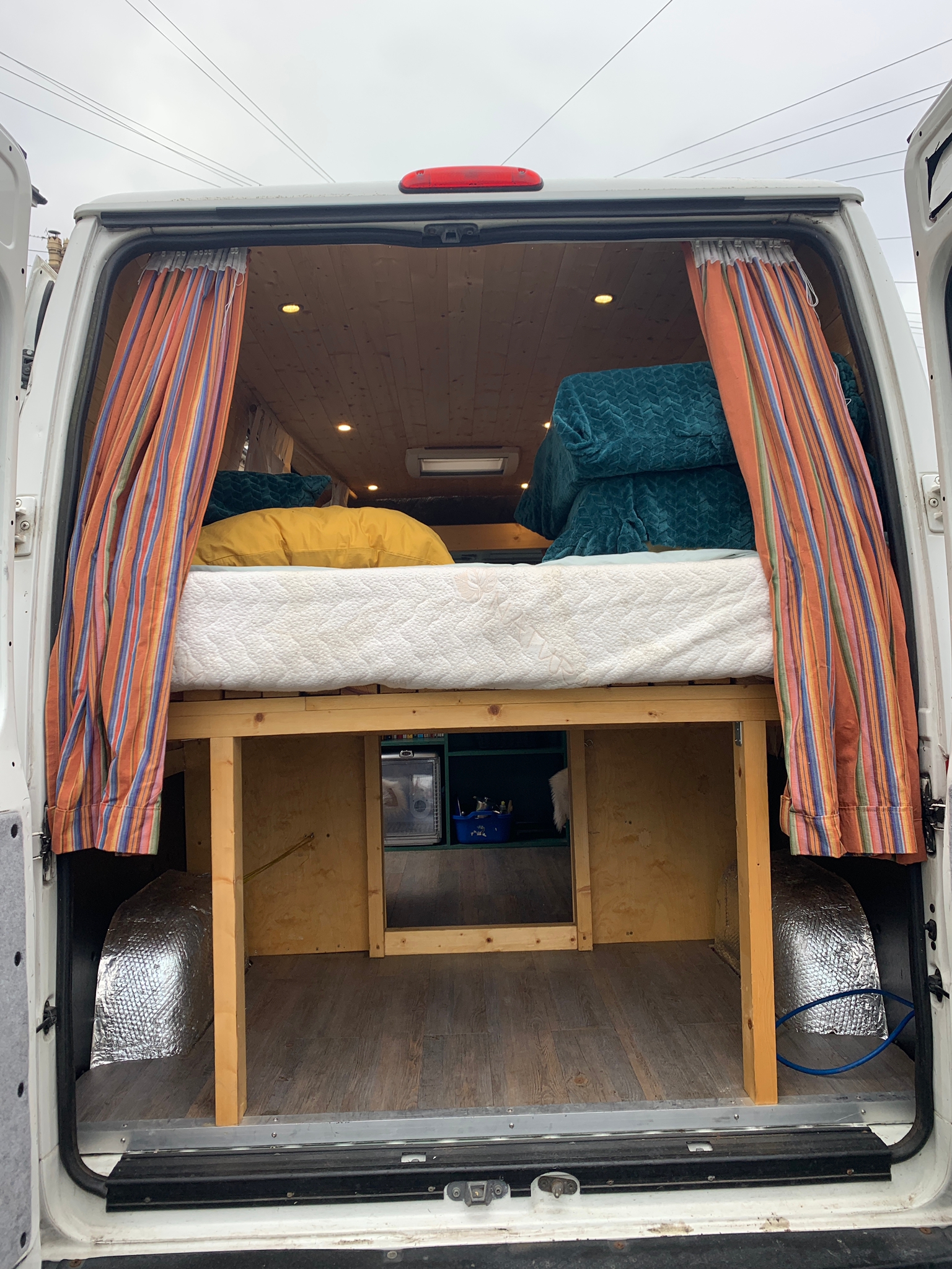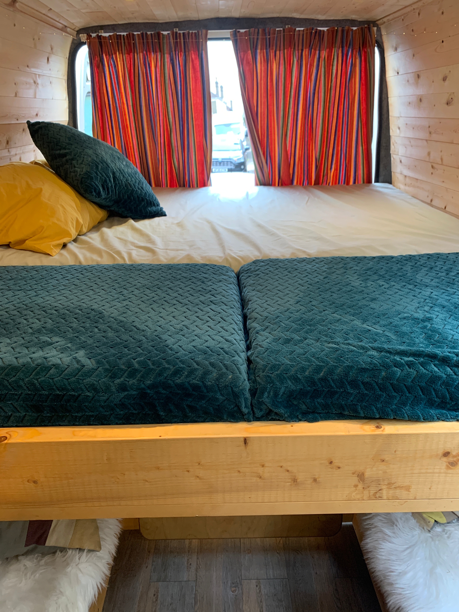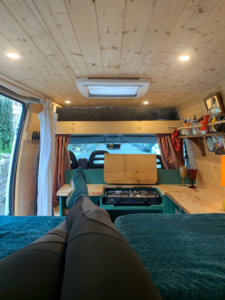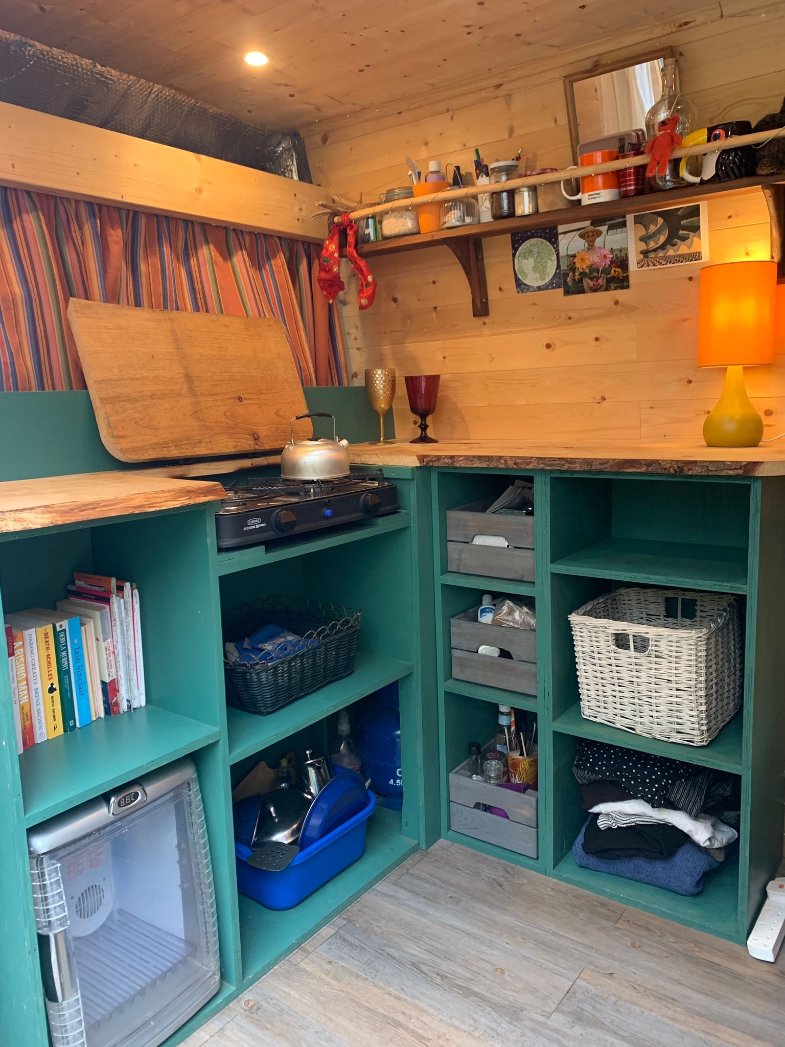Mega comfy slide-out bed with 20cm memory foam mattress, better than the mattress in my house! Slide-out bed means you can sleep lengthways, we’re both tall-ish, so struggle to sleep sideways like so many conversions. L-shaped kitchen with loads of workspace, storage under the seats, and plenty of space under the bed. Fold out table gives access to the rear storage.