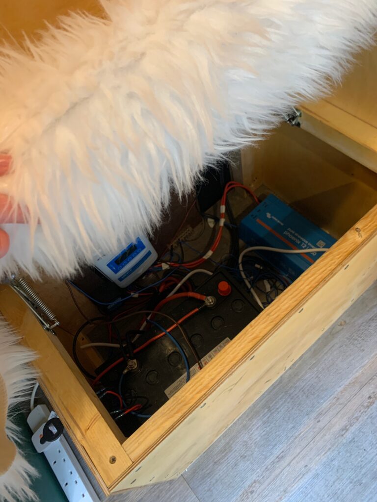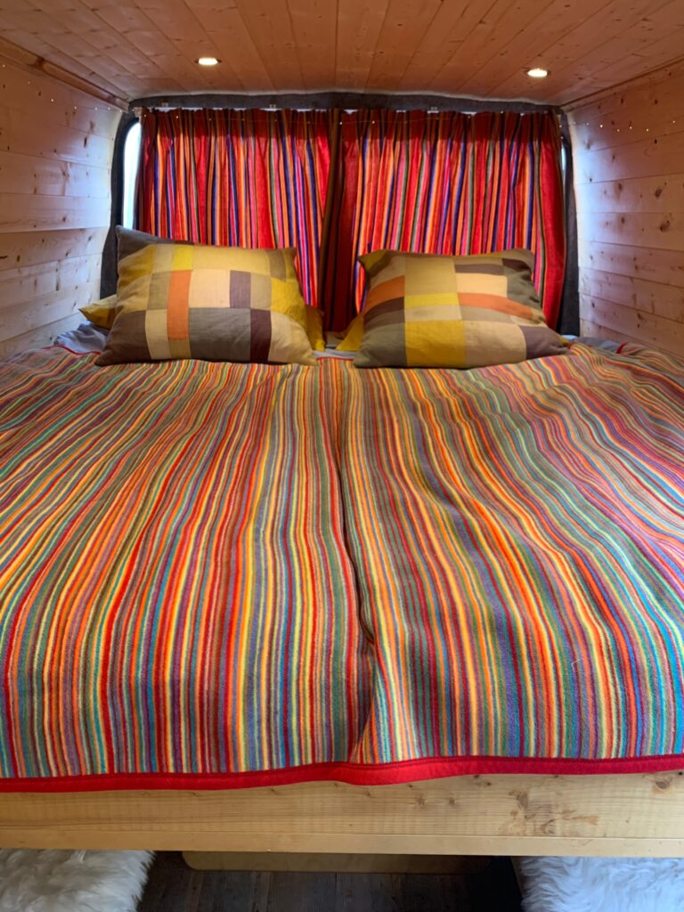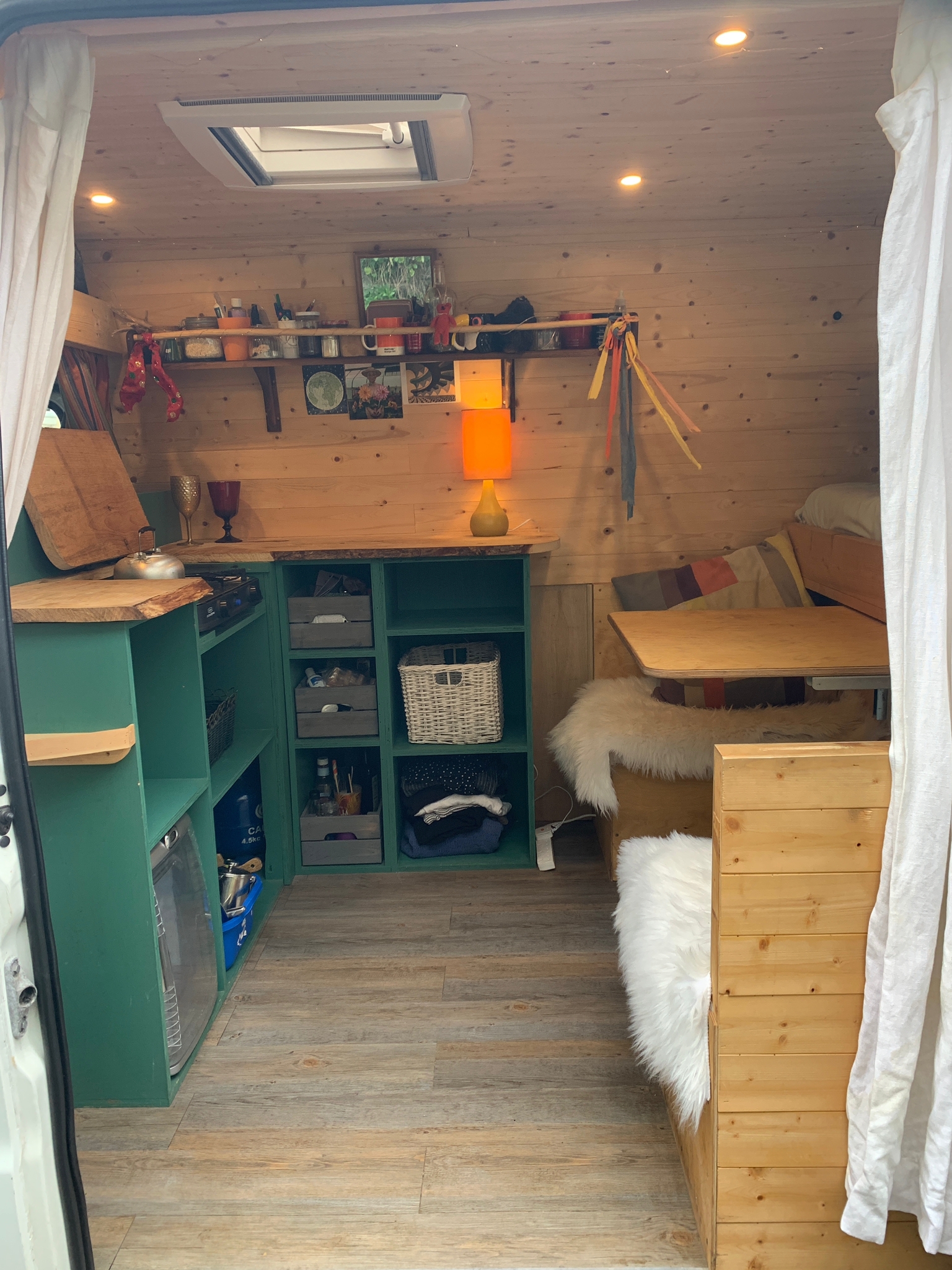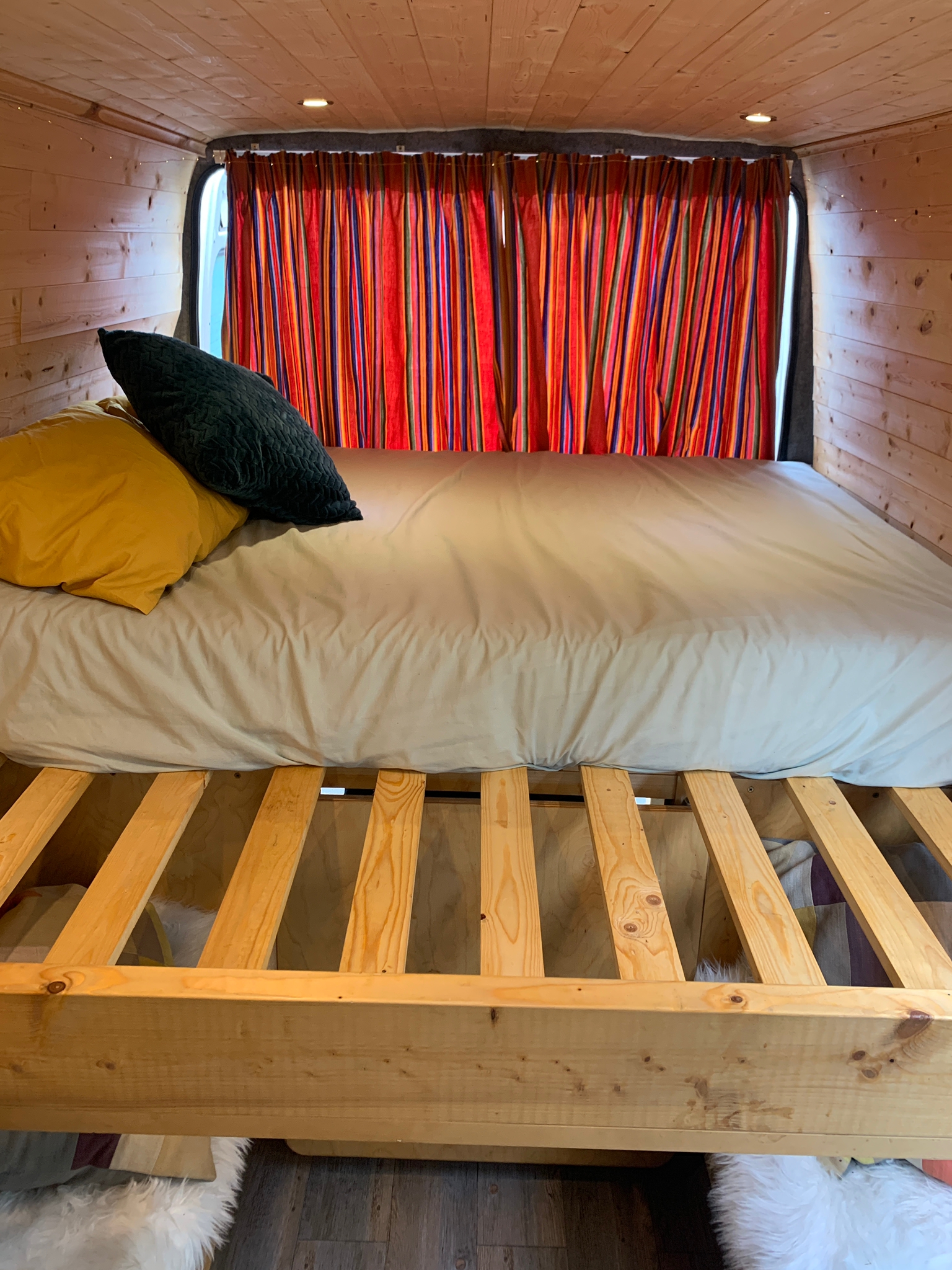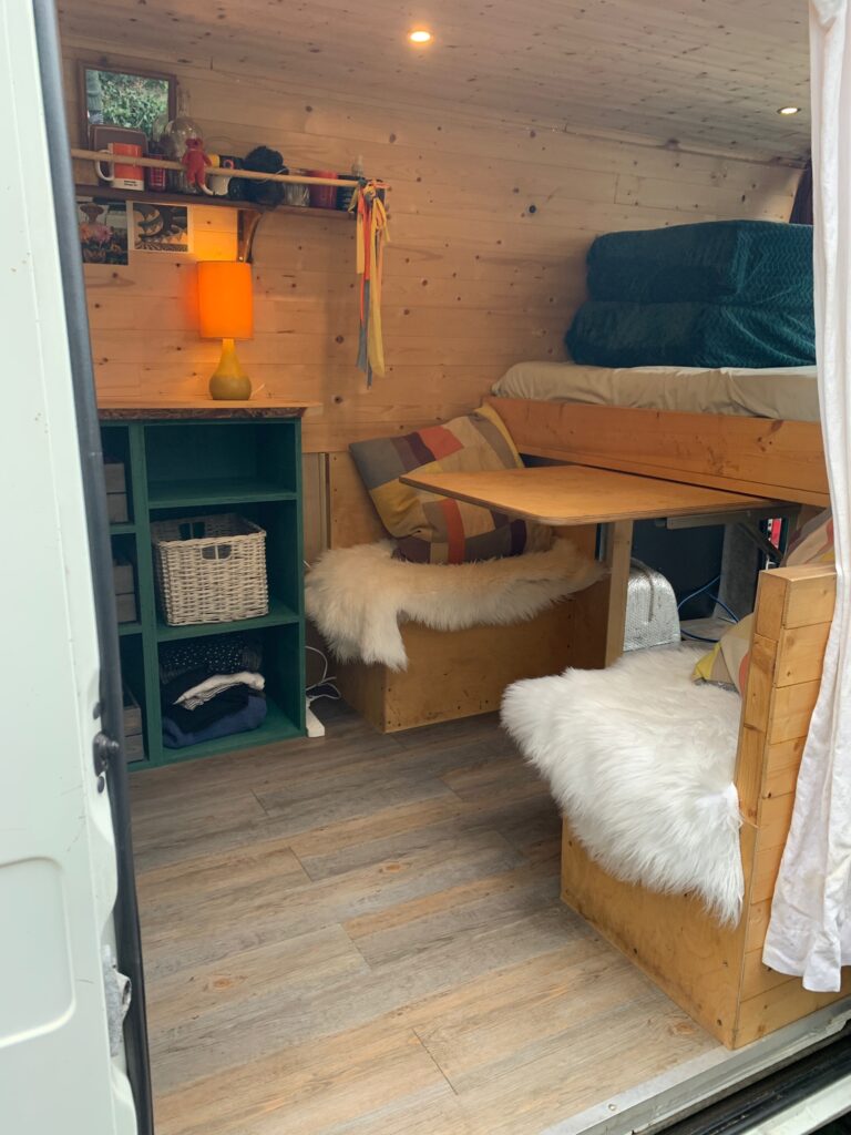 Mega comfy slide-out bed with 20cm memory foam mattress, better than the mattress in my house! Slide-out bed means you can sleep lengthways, we’re both tall-ish, so struggle to sleep sideways like so many conversions. L-shaped kitchen with loads of workspace, storage under the seats, and plenty of space under the bed. Fold out table gives access to the rear storage.