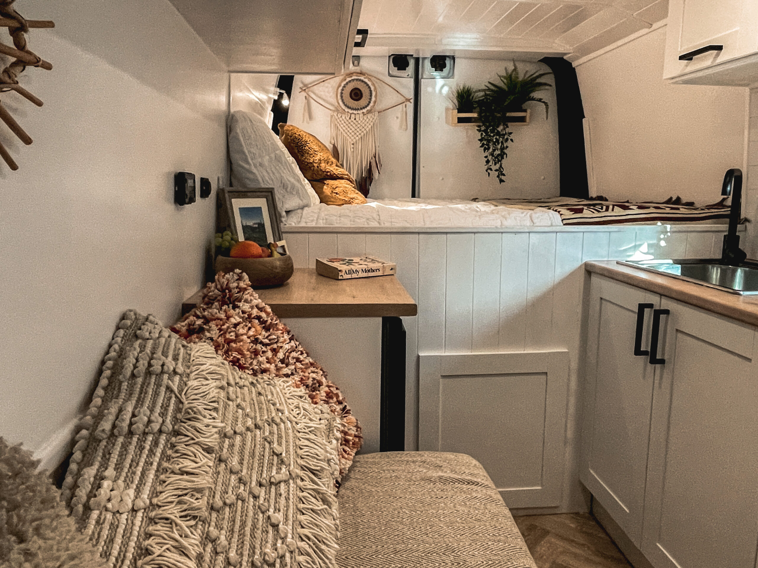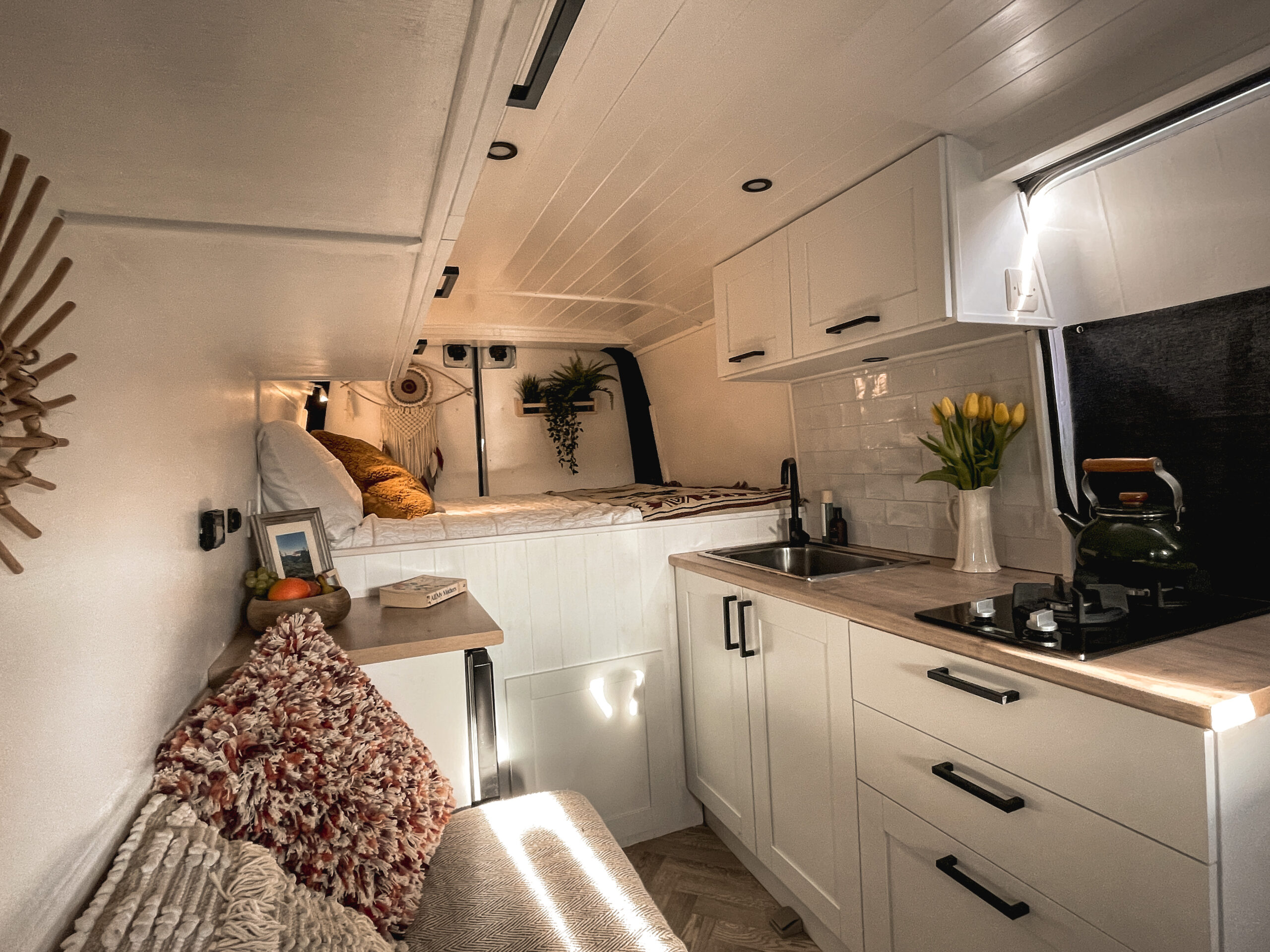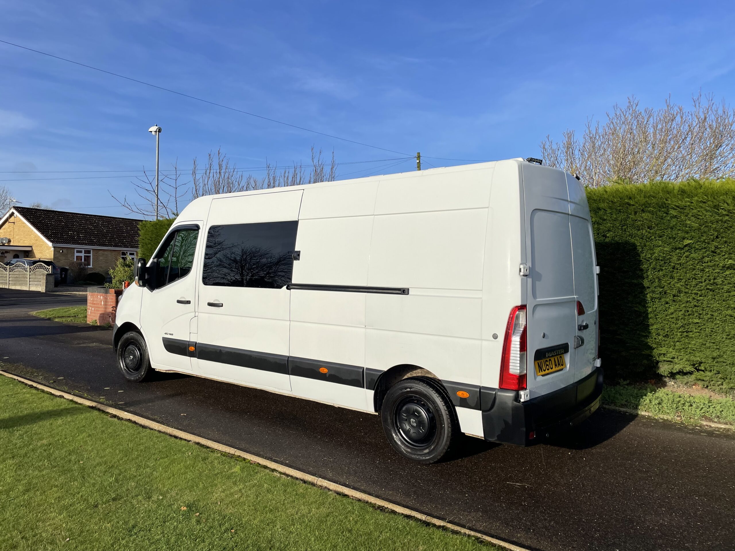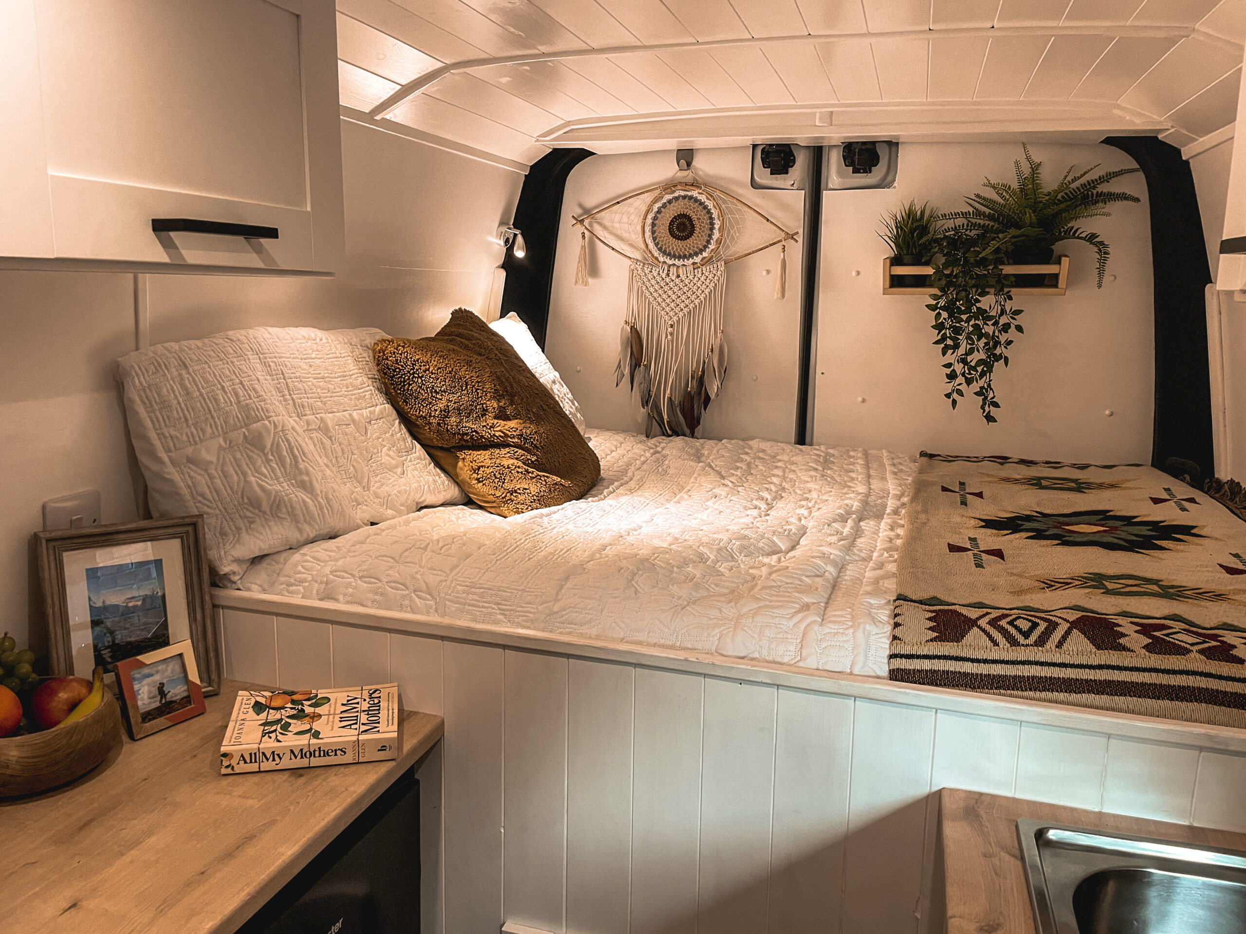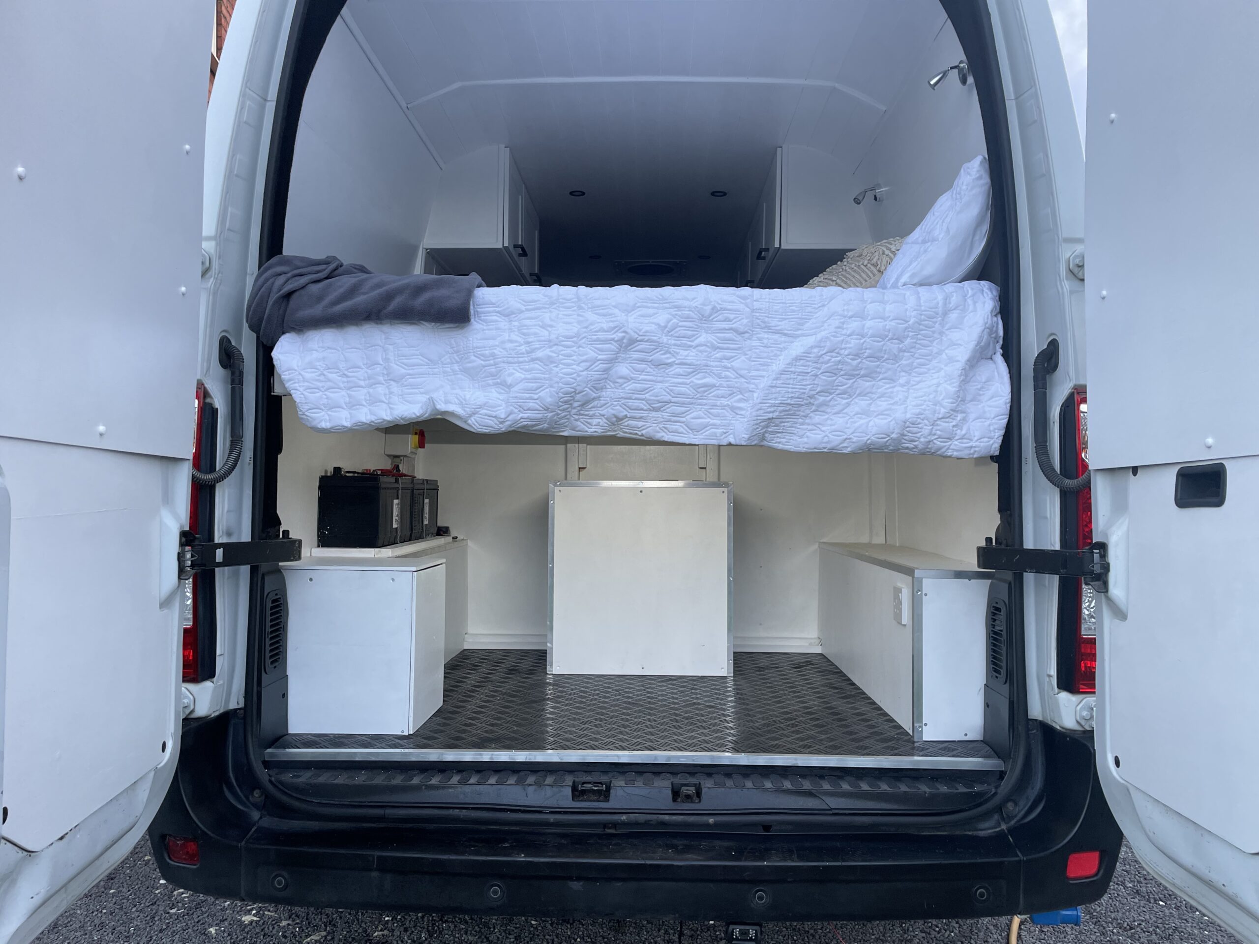 Full Double bed across the back of the van with a very comfy brand new memory foam mattress