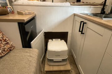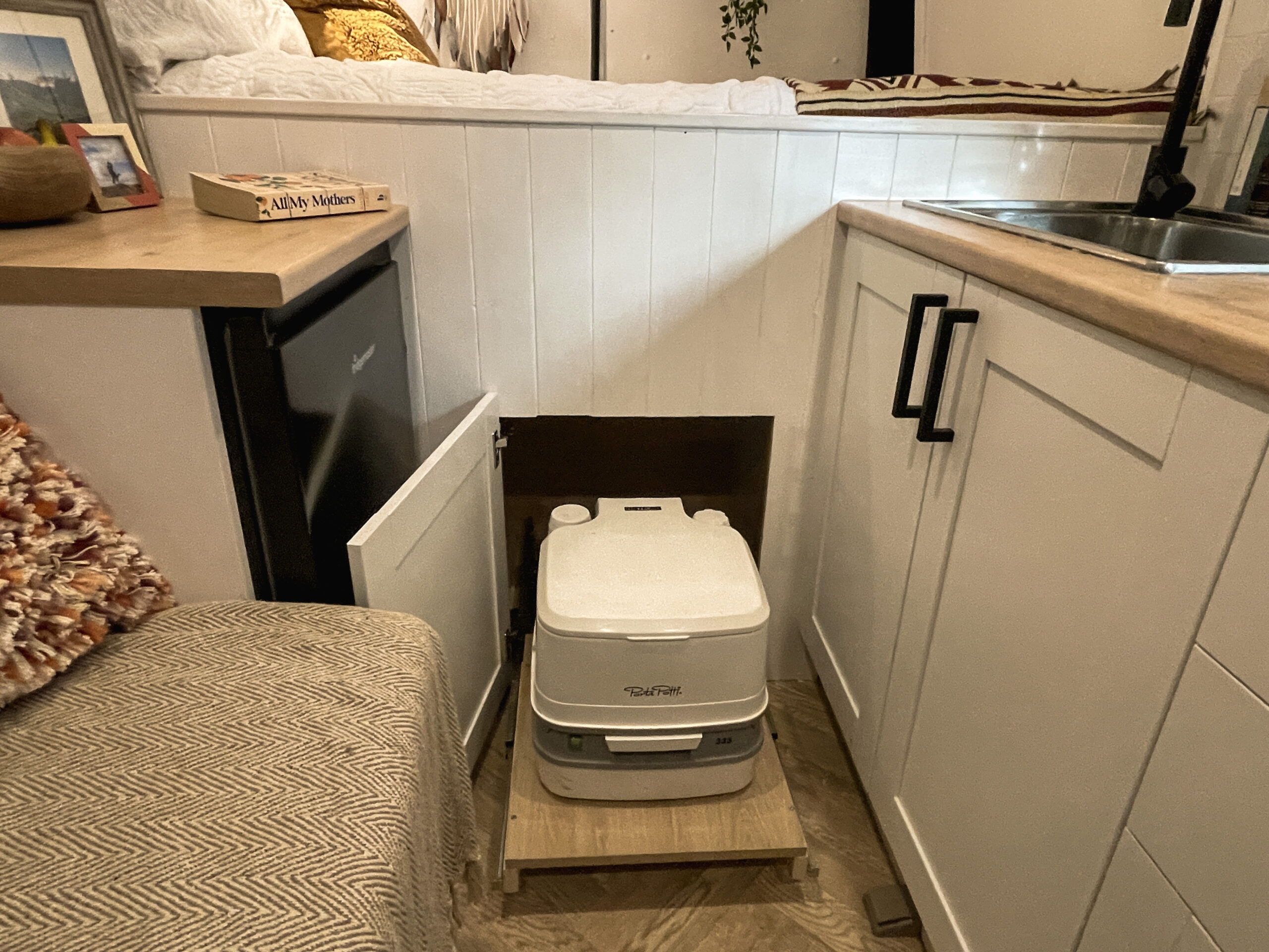 The toilet is a neat little Thetford porta potti that slides out from underneath the bed (see photos)