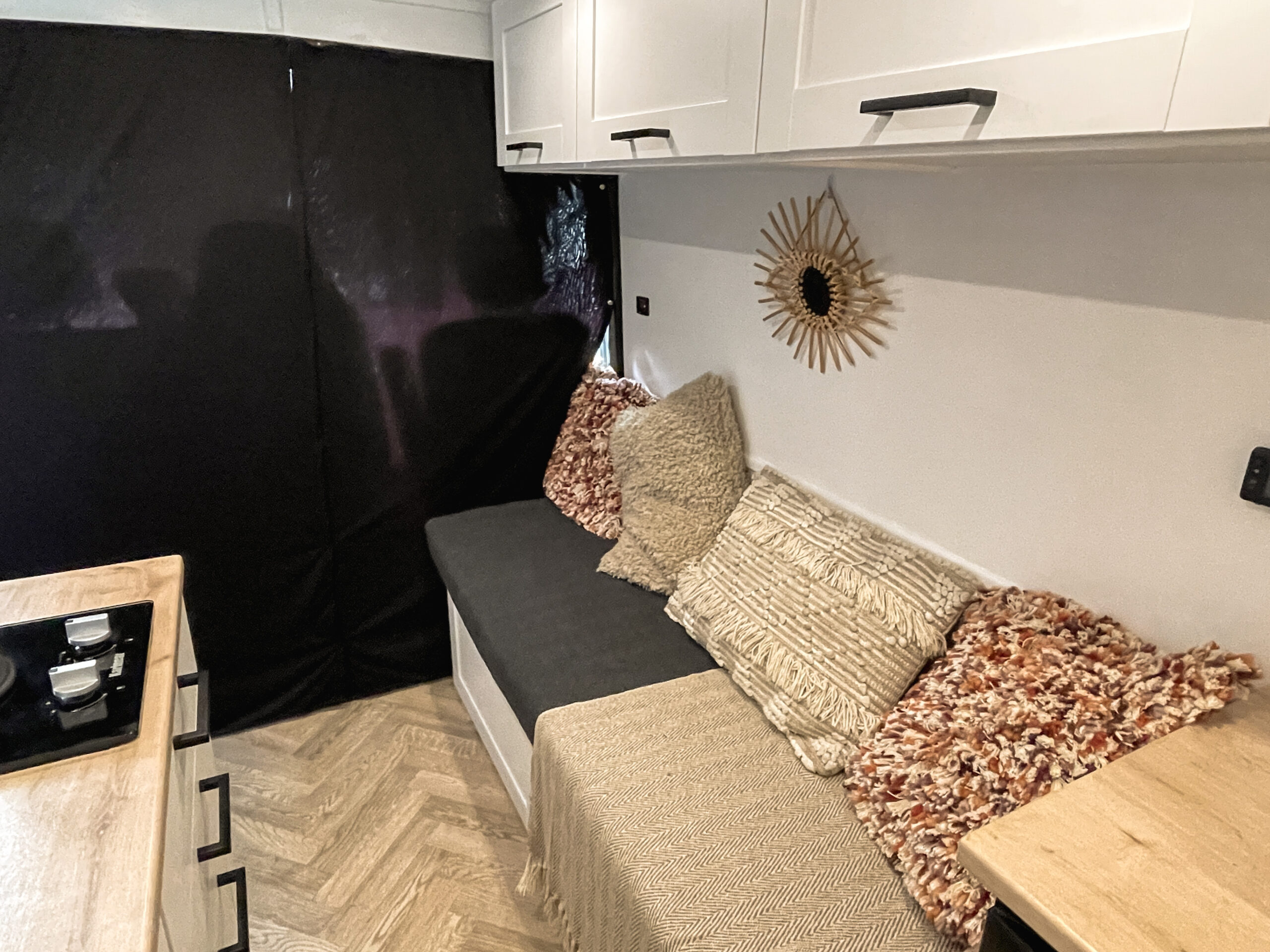 Loads of storage space with 6 overhead cupboards and huge compartments under the sofa area.