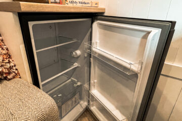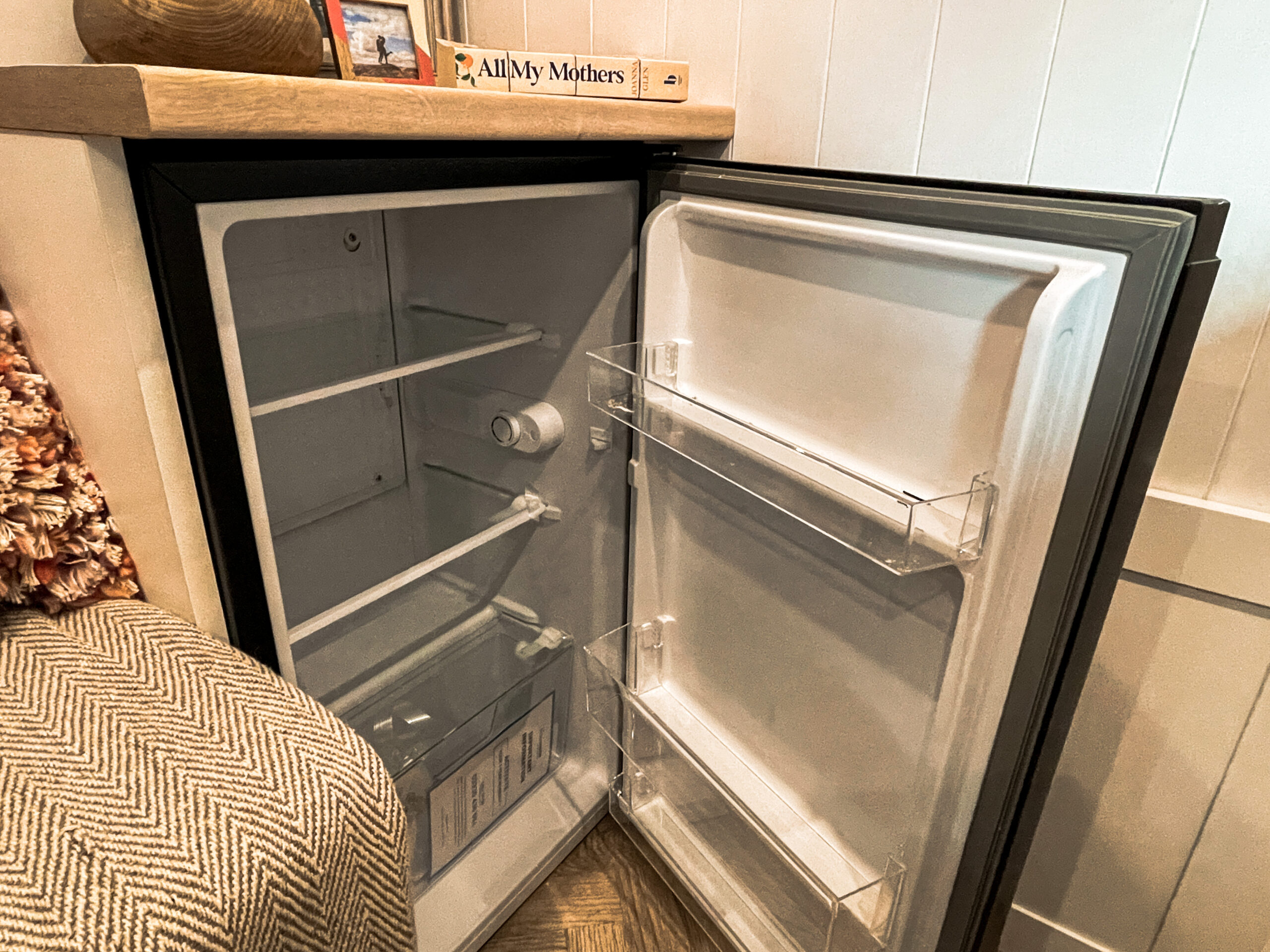 91 litre domestic fridge running from an automatically switched inverter, very efficient set up, just as power efficient as the dometic compressor fridges.