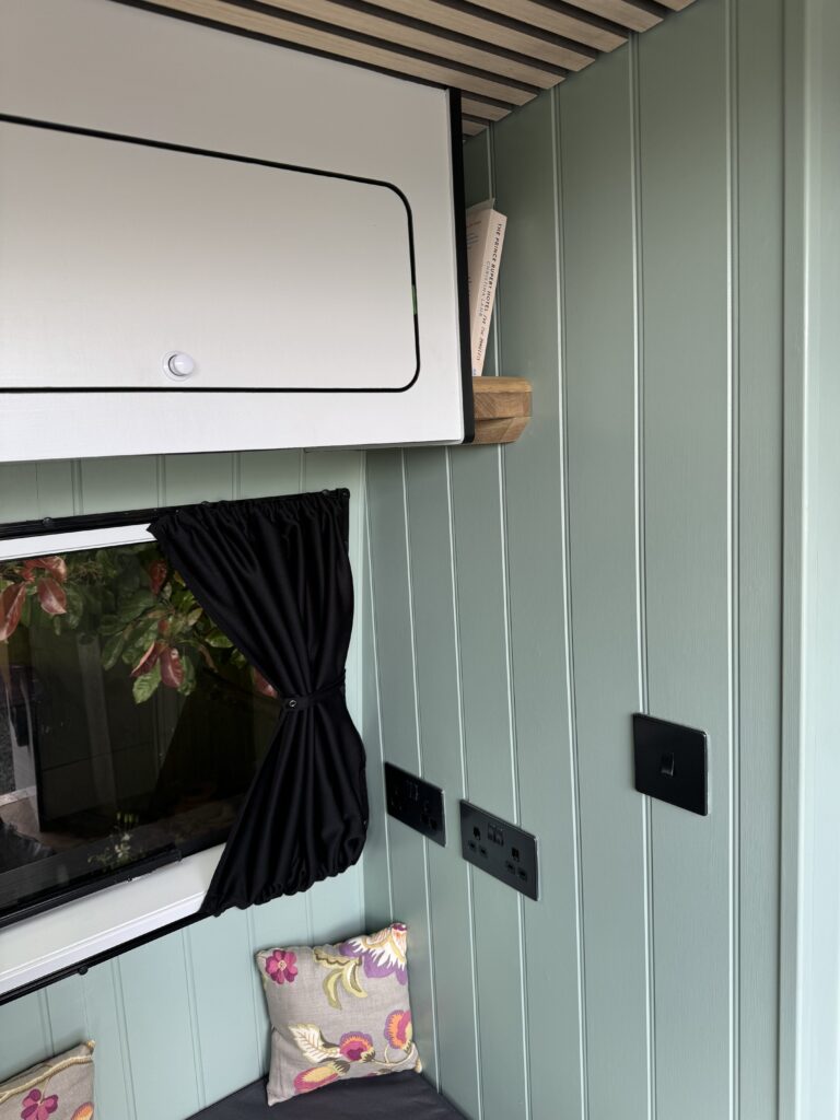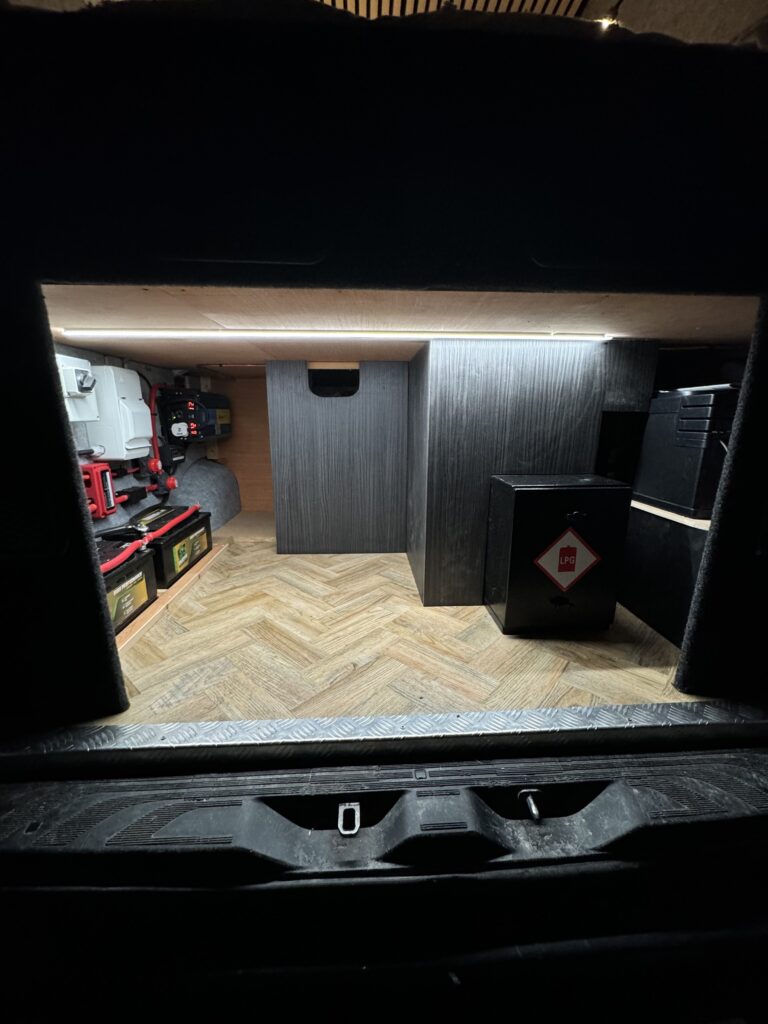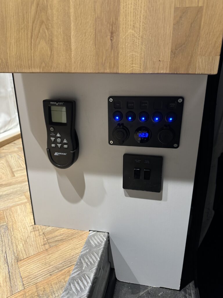 The van consists of – 4 double sockets with USB ports, 2 single sockets. Control board on the side kitchen unit by entrance from the front side door switched control lights for the kitchen and living area ceiling aswell as two wall mounted 12v lights and LES light under pull out bed, max air fan, fridge and hob. Control panel accessed through back door controls- LED lights under bed, gas heater and water pump.