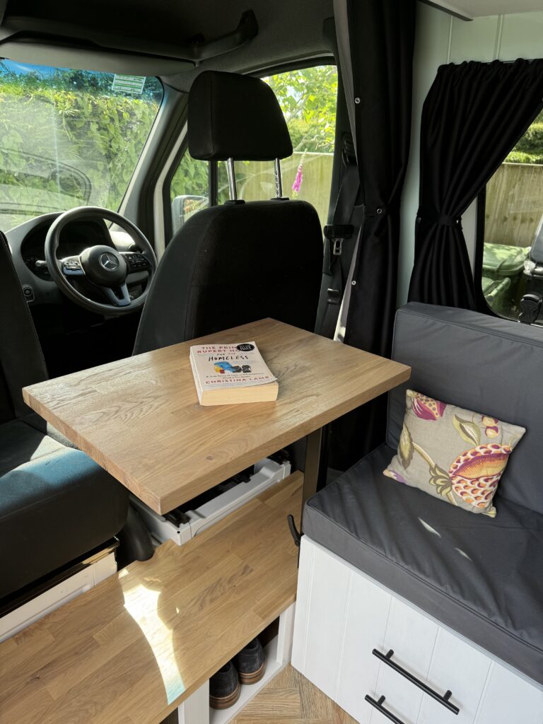 In the central living area the van has a Maxx air fan which can be controlled with remote. We have fitted a double swivel seat at the front, and built a slide out bench seat which doubles as a small bed, with wipe clean cushion covers. We have fitted side windows on both sides enabling you to take in your surroundings, with blackout curtains to maintain privacy. Both above and below you will find lots of storage space for any items you may wish to take away with you.