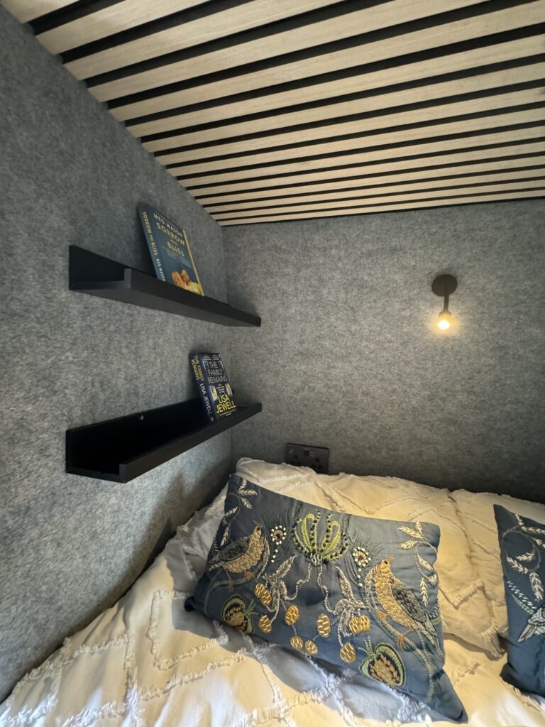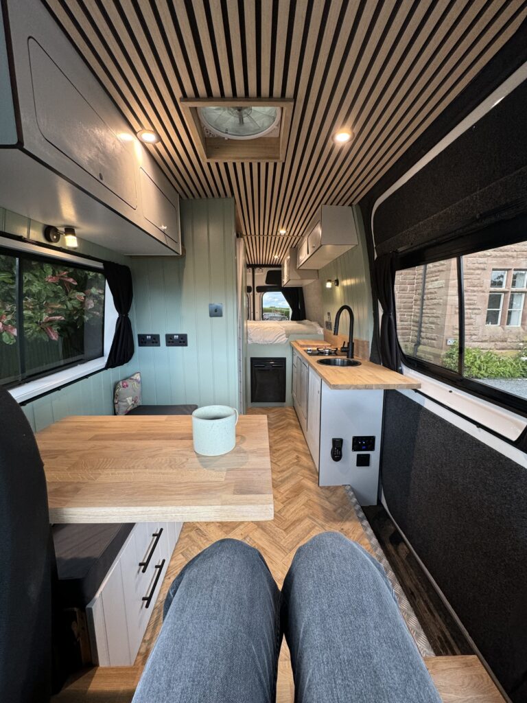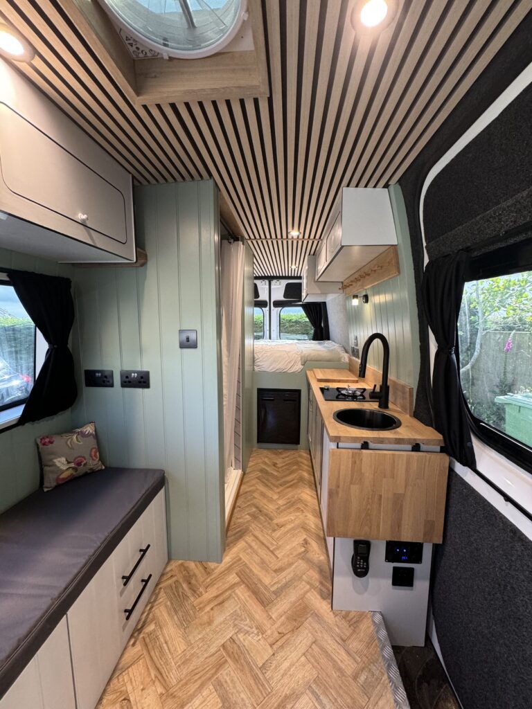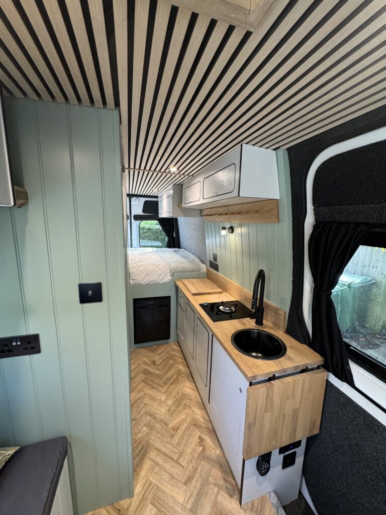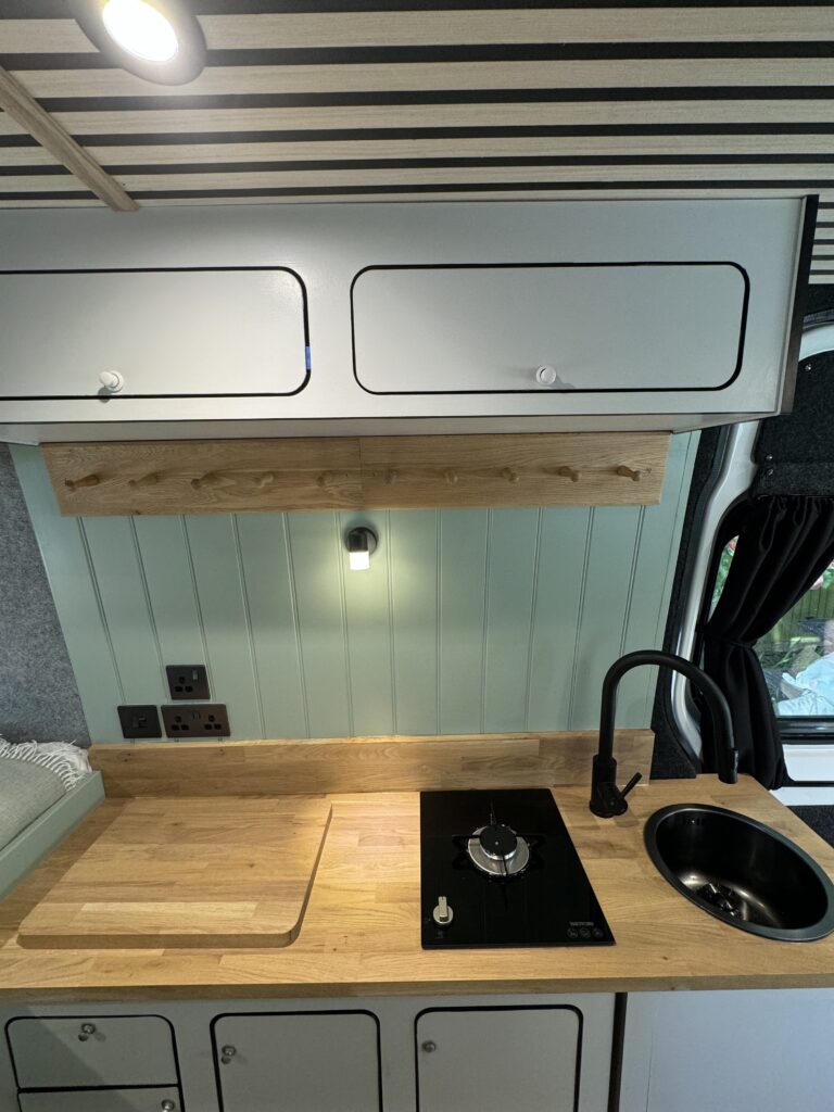 It has everything you need to live off grid, on campsites, and everything in between. In the kitchen we have fitted it out with a Thetford Topline 910 Hob Single Burner, Taro Matt Black Pull Out Tap with spray nozzle, Alpicool CR50X Campervan Boat 12v or 24v DC Compressor Fridge + Icebox, fitted with ceiling and base units with lovely solid oak worktop with flip up countertop extension.