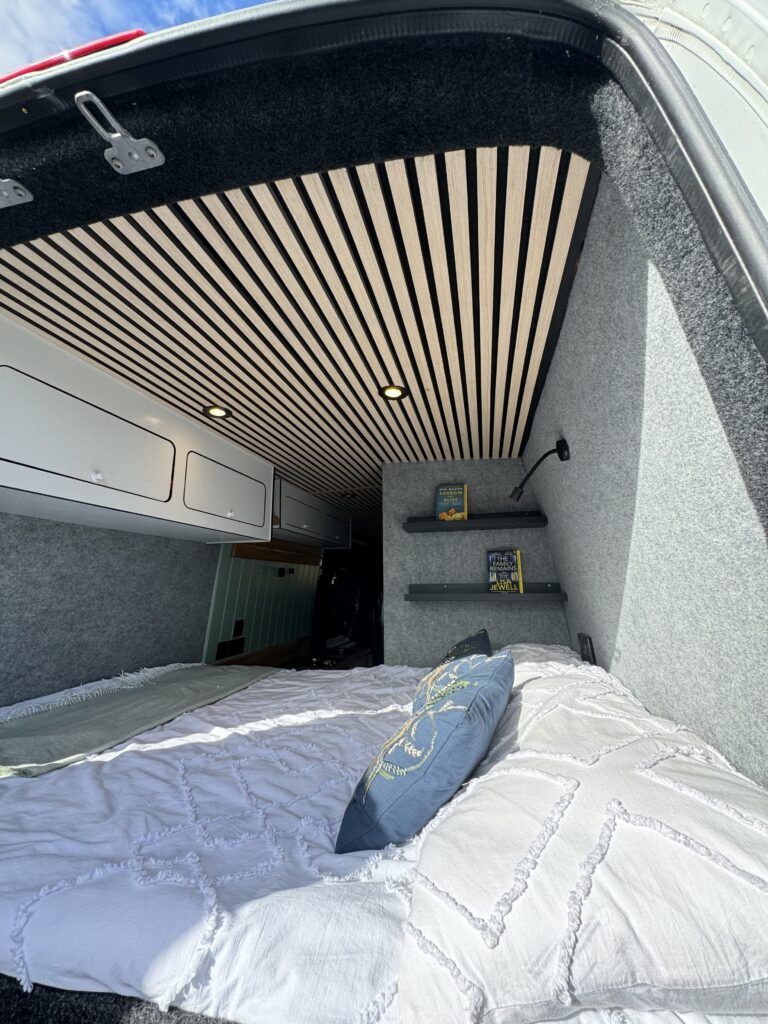 The main bed is positioned at the back of the van, and has been fitted with a custom made memory foam mattress, similar sizing to a small double. We have fitted windows into the back doors with blackout curtains to maintain privacy when needed.