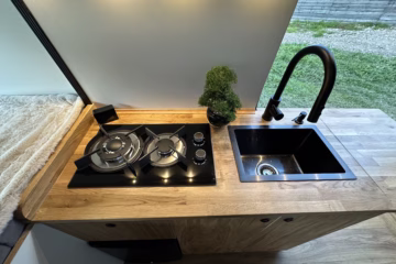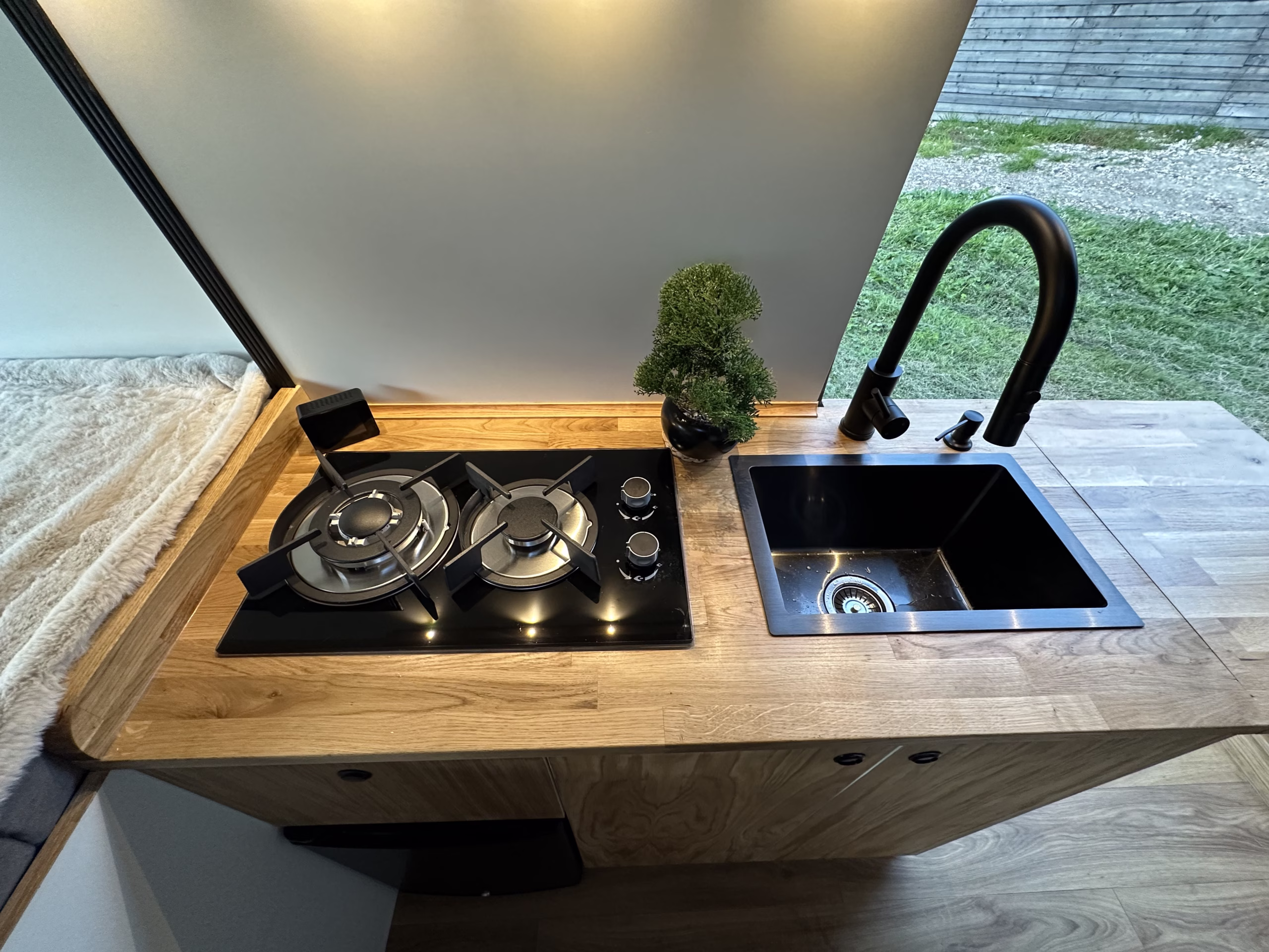 π³kitchen featuring a two-burner gas hob, deep black sink with a stylish mixer tap