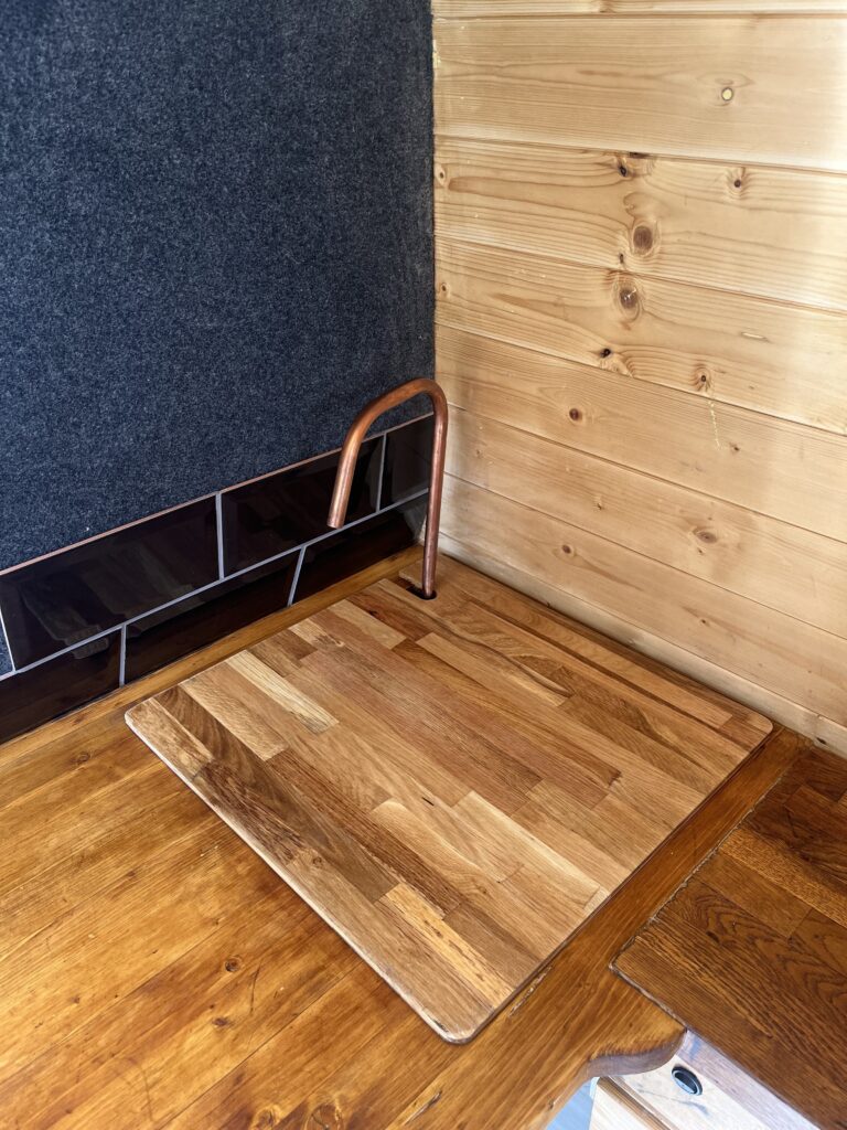 Inset oak chopping board which sits in the sink to give extra work surface space.