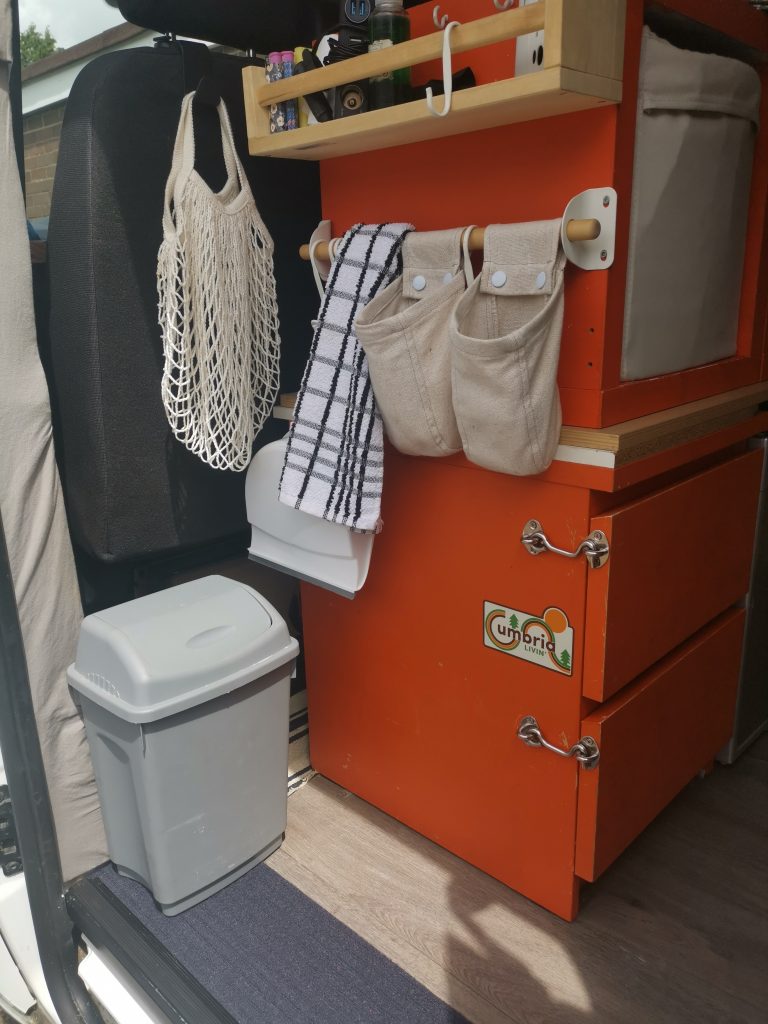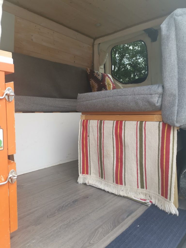 Interior design features: U-shaped benches with thick, foam seat cushions, which convert into a comfortable bed (sleeps 2). Plenty of storage, including full length under-bench space, 3 large storage cubes, and 3 drawers. Spacious ‘garage’ area accessible from the back of the van. 3 windows: 1 slide-open side window, and 2 fixed rear door windows. Lots of hooks and small shelf space to store items, as well as a window sill area to store items aswell.
