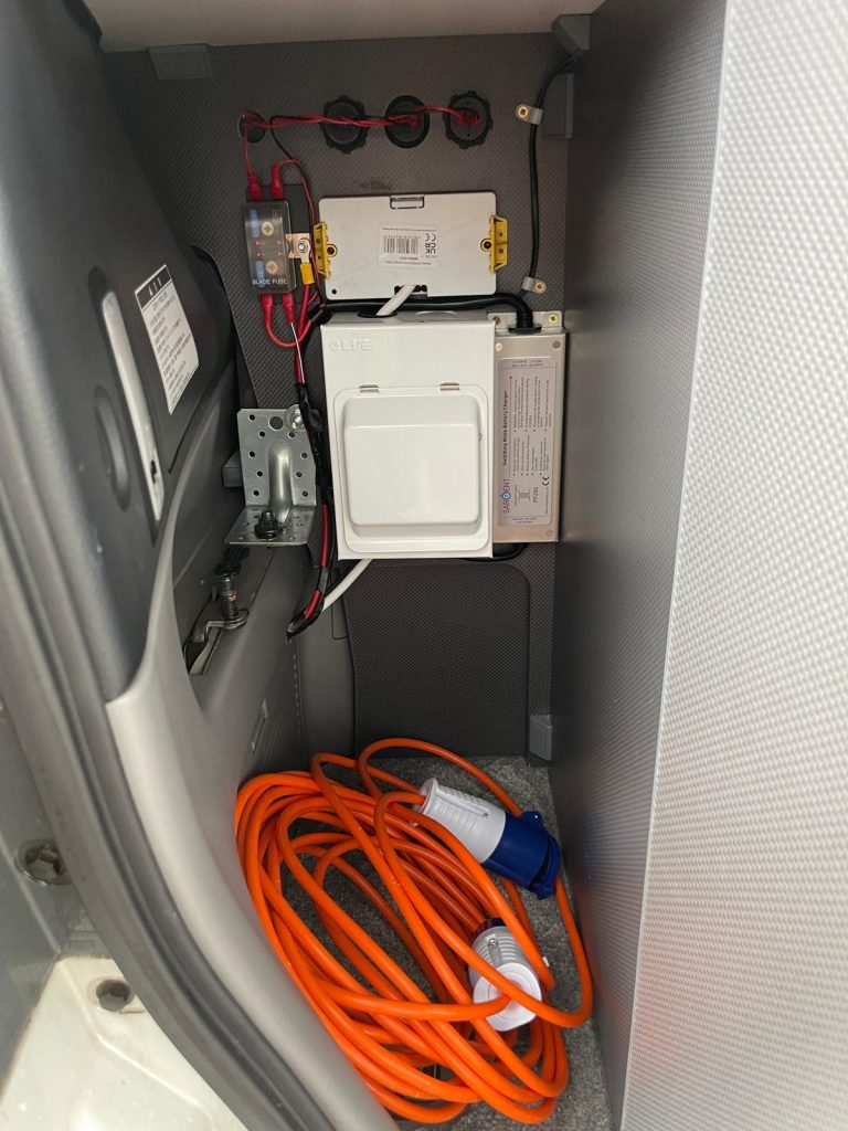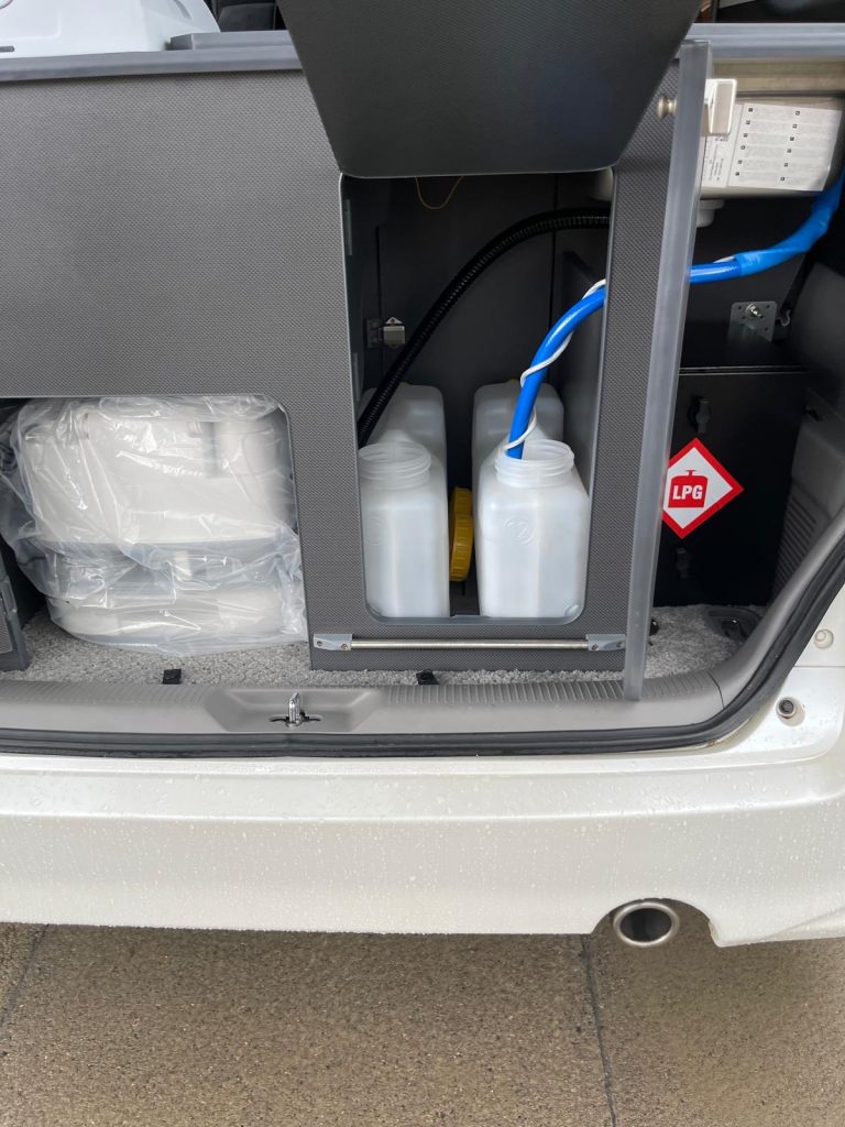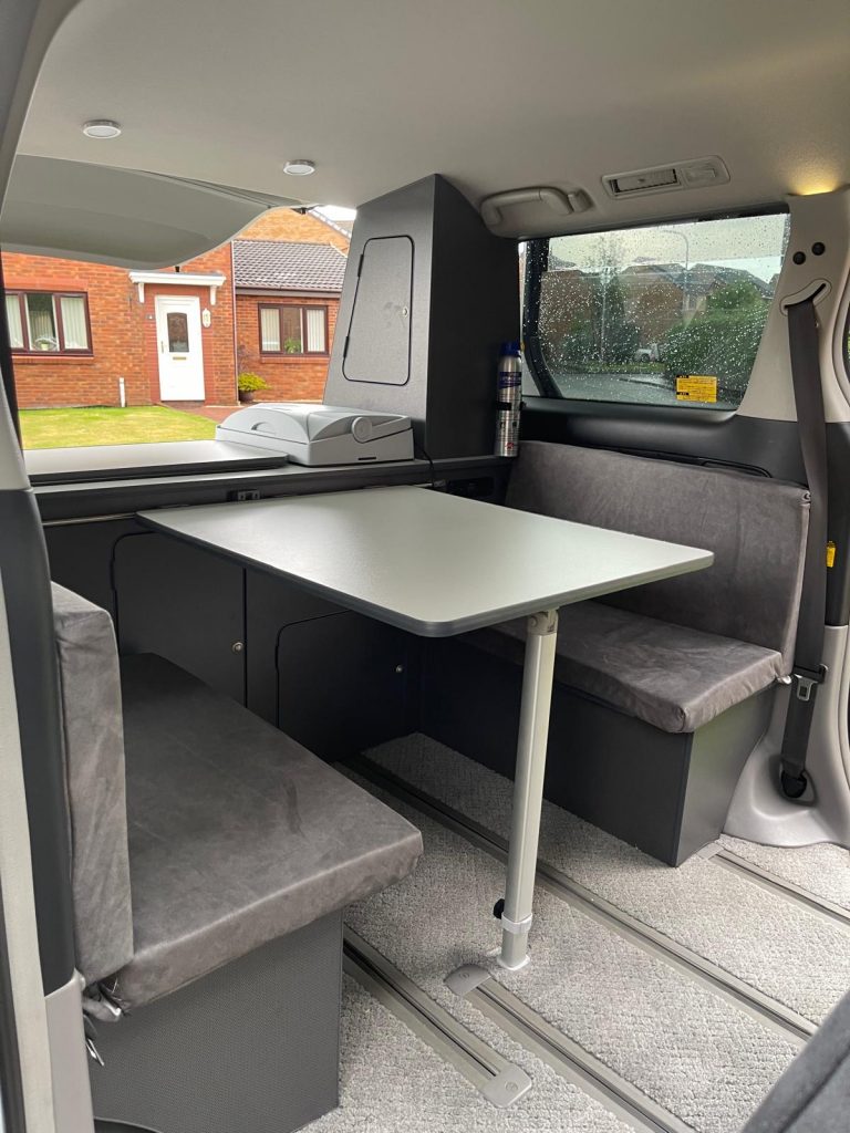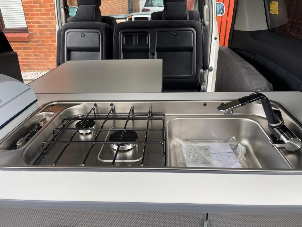HEAD UNIT CONVERSION, CONSISTS OF DENIM BLUE/CARBON UNITS INC. TOP LOCKER AND TWO FOOT BOXES FOR UNDER SEAT STARAGE, SINK WITH 2 BURNER GAS HOB, DEDICATED GAS LOCKER WITH GAS SAFETY CERTIFICTE, WATER TAP AND ELECTIRIC PUMP, 2X12 LITRE WATER TANKS FOR FRESH AND WASTE, FIRE EXTINGUISHER, CO ALARM, TABLE RAIL, UPHOLSTERED CUSHIONS IN EASY CLEAN FAUX SUIDE, MAINS ELECTRICS AND SECONDARY LEISURE BATTERY, DOUBLE 240V SOCKET, TWIN USB AND 12 VOLT SOCKET ALONG WITH BATTERY HEALTH DISPLAY, CONSUMER UNIT WITH RCD, SPLIT CHARGE REPAY, 4 X12V LED LGHTS, ELECTRIC REMOVABLE TOP LOADING COOL BOX, PERMANENT ROOF AWNING RAIL FOR DRIVE AWAY AWNING, ORIGINAL TOYOTA ROOF BARS WITH OPTION OF ADDING ROOF BOX FOR EXTRA STORAGE, QUBE 335 POTABLE TOILET, FULL THERMAL BLINDS FOR EVERY WINDOW,